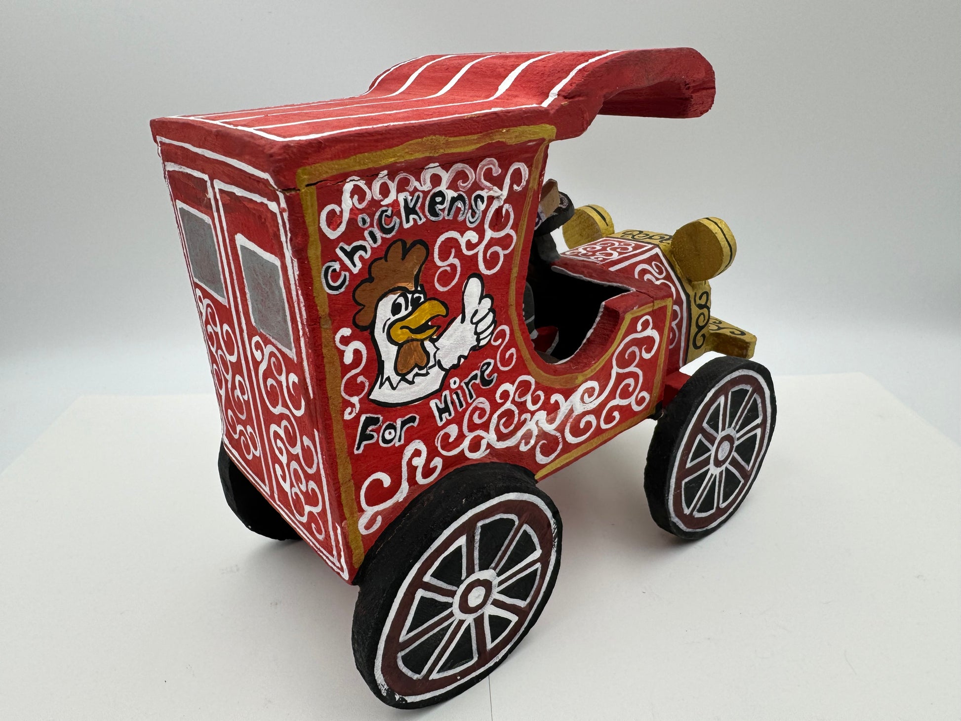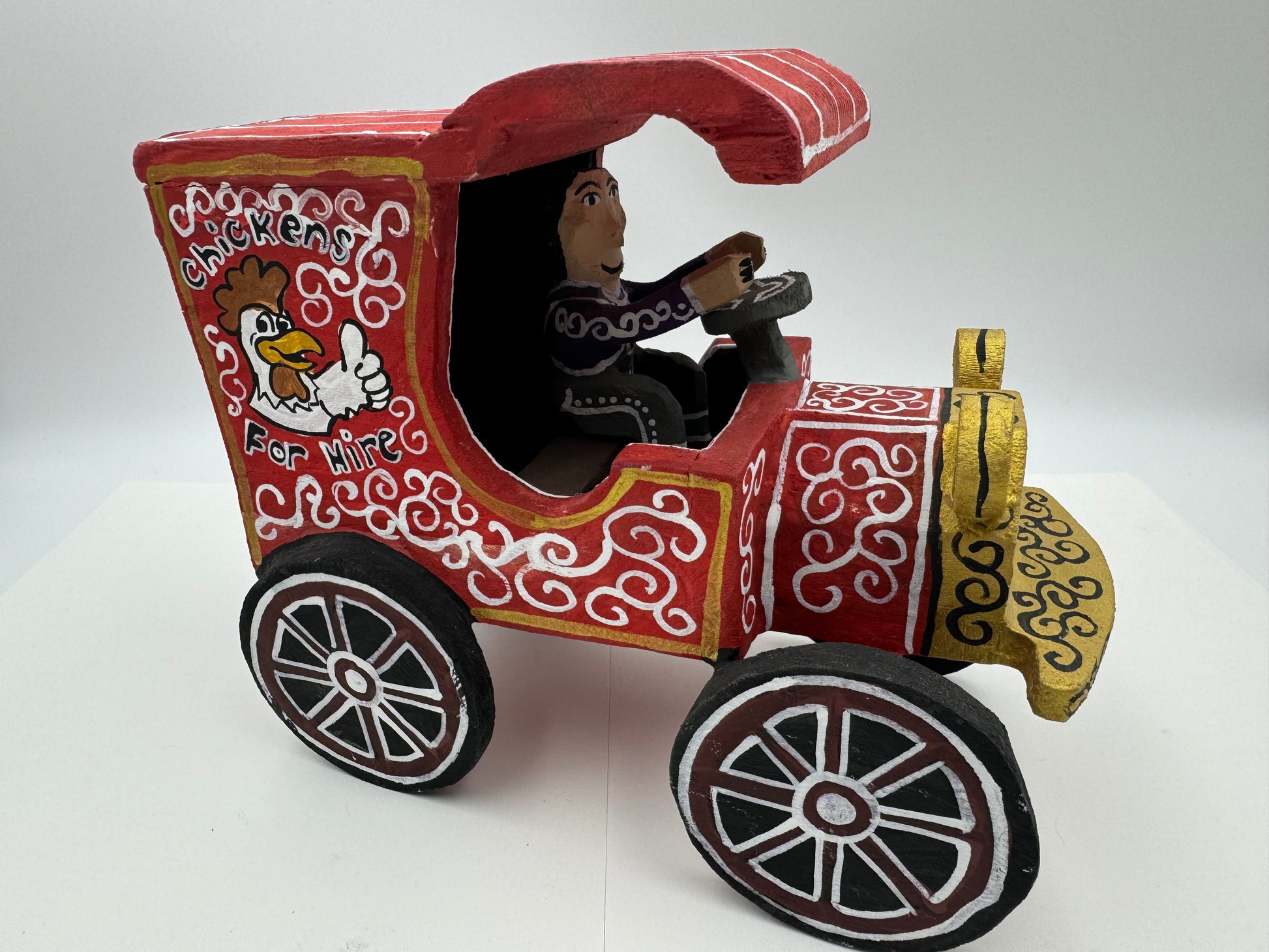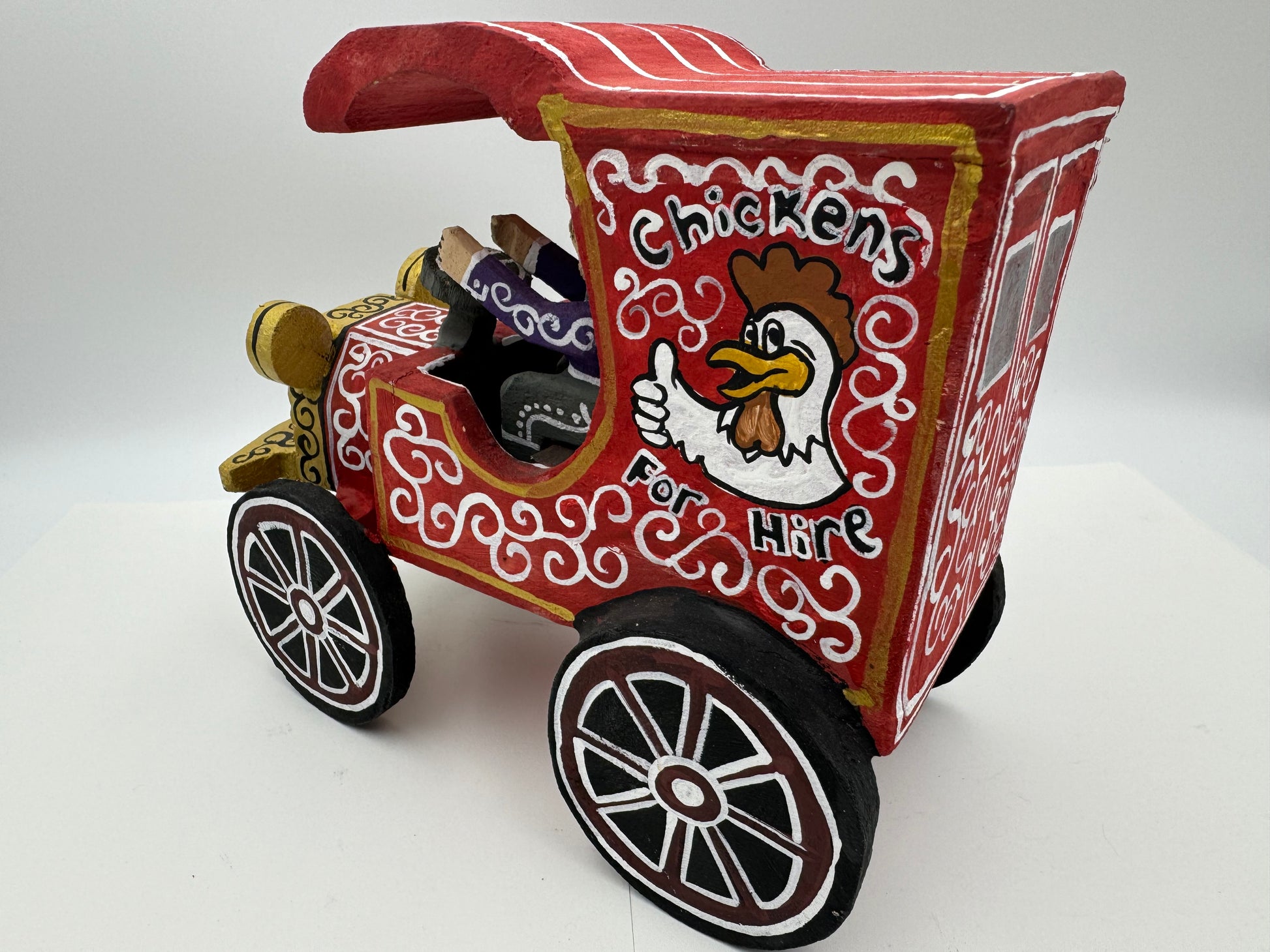 This is a Handcrafted folk-art piece by Delbert Buck of the Navajo Nation. The Chicken For Hire Truck is about 7 inches tall, 7.5 inches long, 4 inches wide and weighs about 12 ounces. On the underside is Delbert's autograph Hallmark. The wood pieces are hand carved and painted by Delbert Buck of the Navajo Nation.