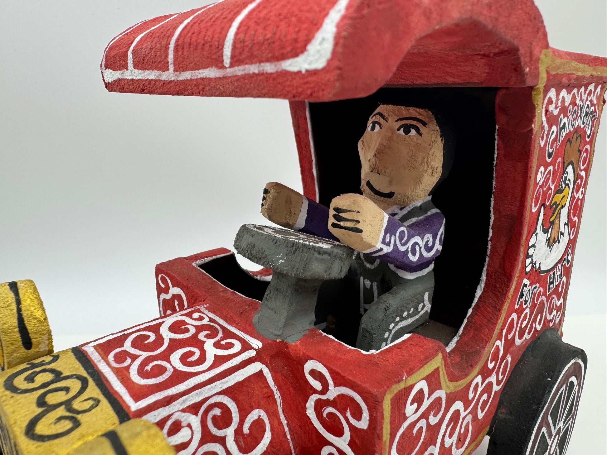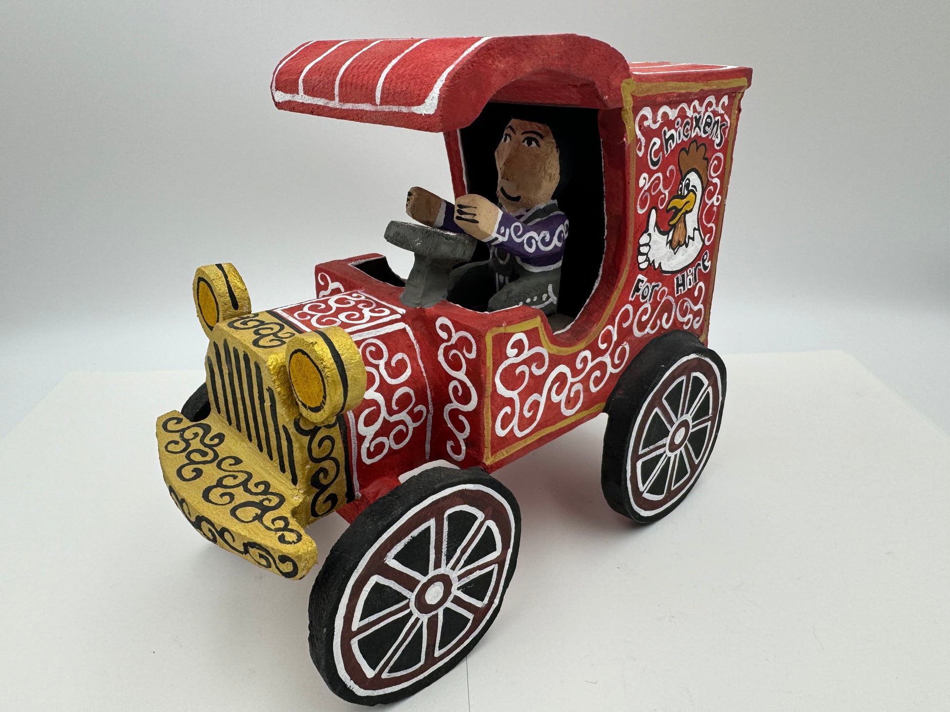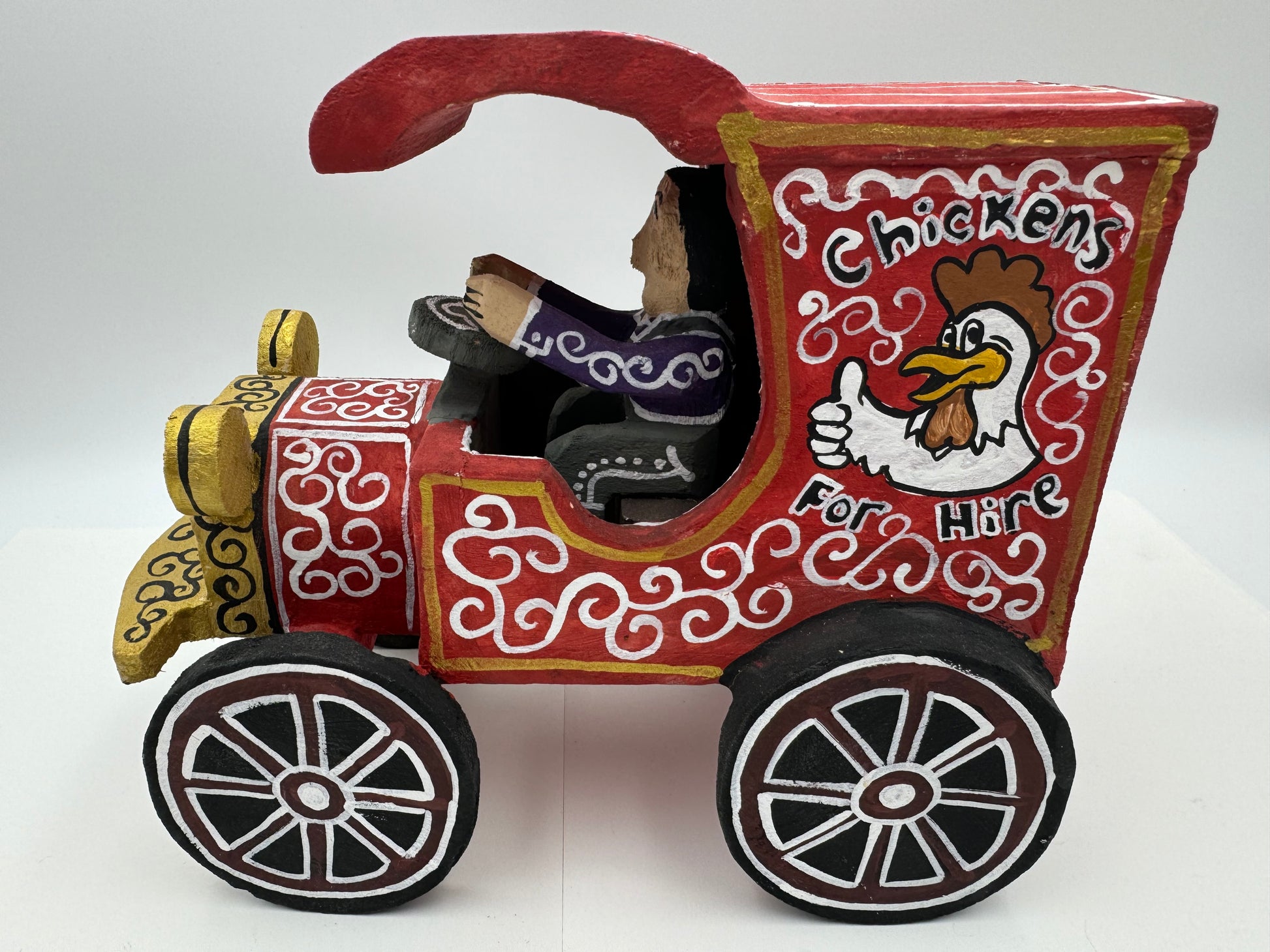 This is a Handcrafted folk-art piece by Delbert Buck of the Navajo Nation. The Chicken For Hire Truck is about 7 inches tall, 7.5 inches long, 4 inches wide and weighs about 12 ounces. On the underside is Delbert's autograph Hallmark. The wood pieces are hand carved and painted by Delbert Buck of the Navajo Nation.