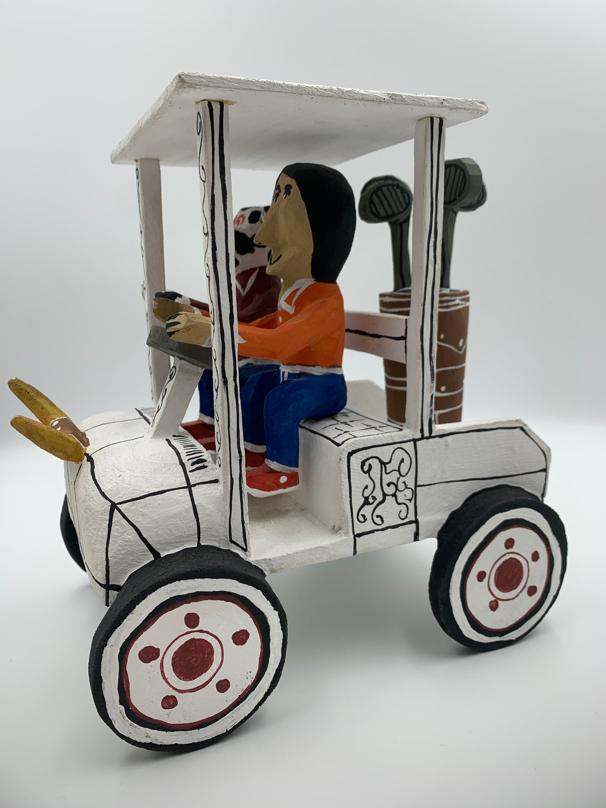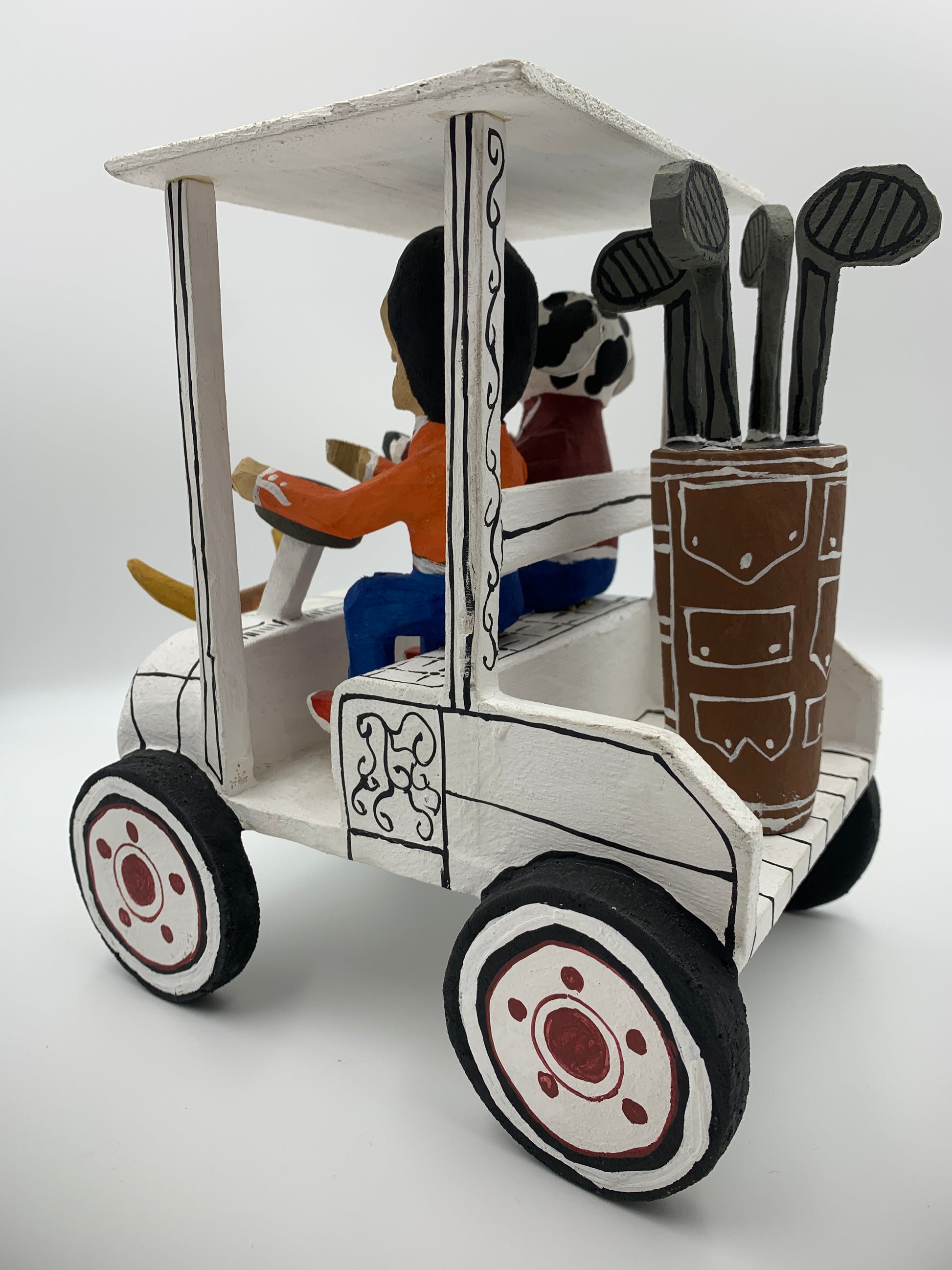 This is a Handcrafted folk-art piece by Delbert Buck of the Navajo Nation. The Golf cart is about 8.5 inches tall, 8 inches long, 6 inches wide and weighs about 19 ounces. The wood pieces are hand carved and painted by Delbert Buck of the Navajo Nation.