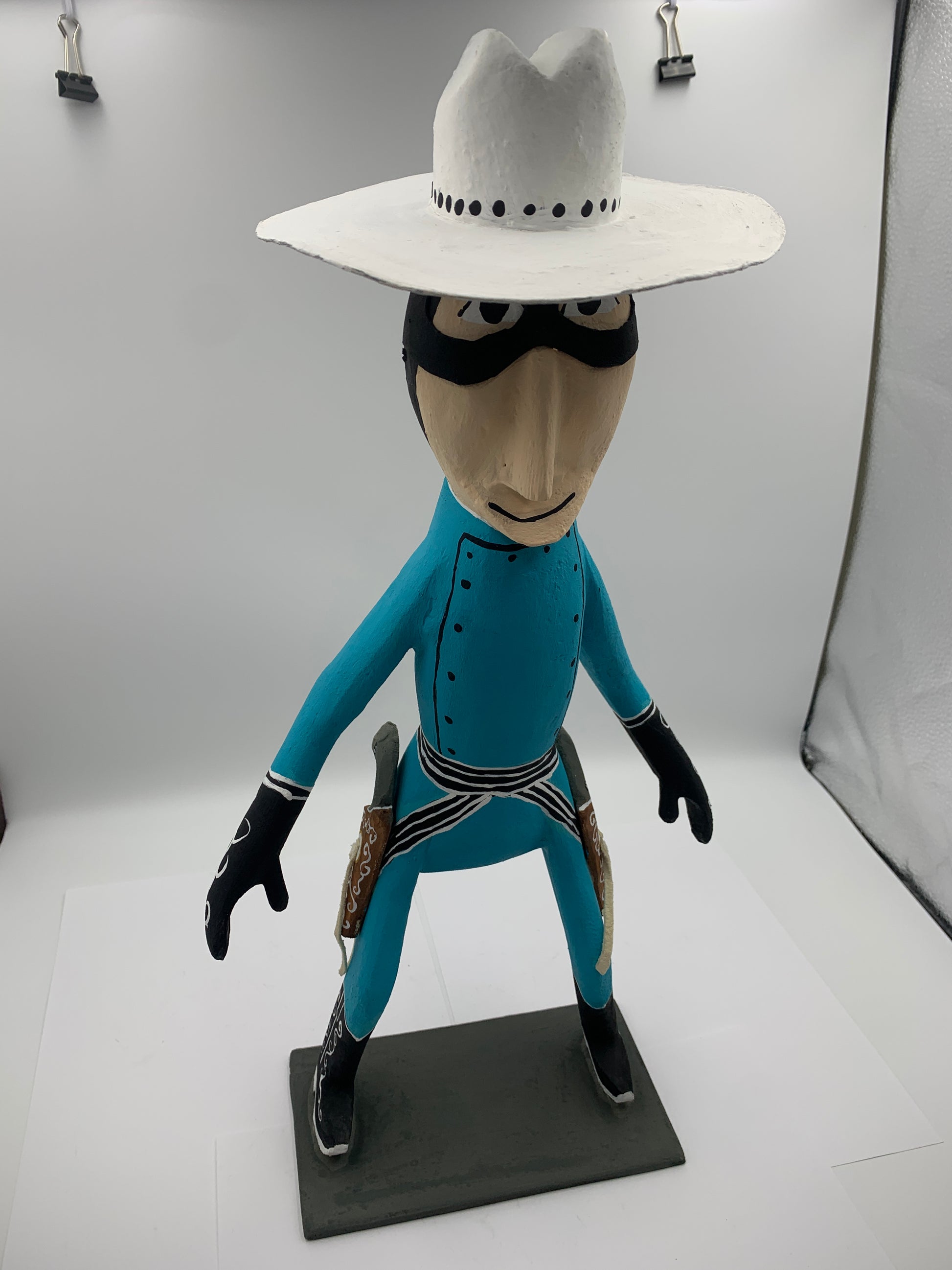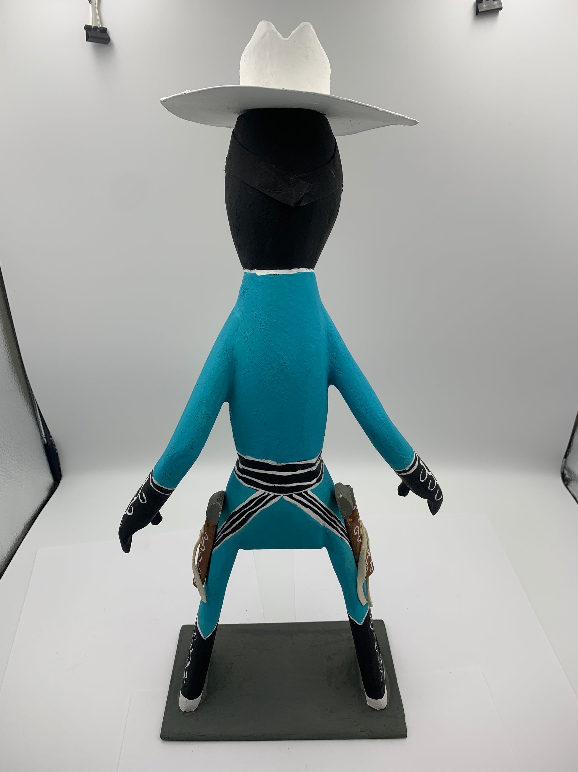 This is a Handcrafted folk-art piece by Delbert Buck of the Navajo Nation. The Navajo Ranger stands about 18 inches tall and about 9 x 6 inches wide. The wood pieces are hand carved and painted by Delbert Buck of the Navajo Nation.