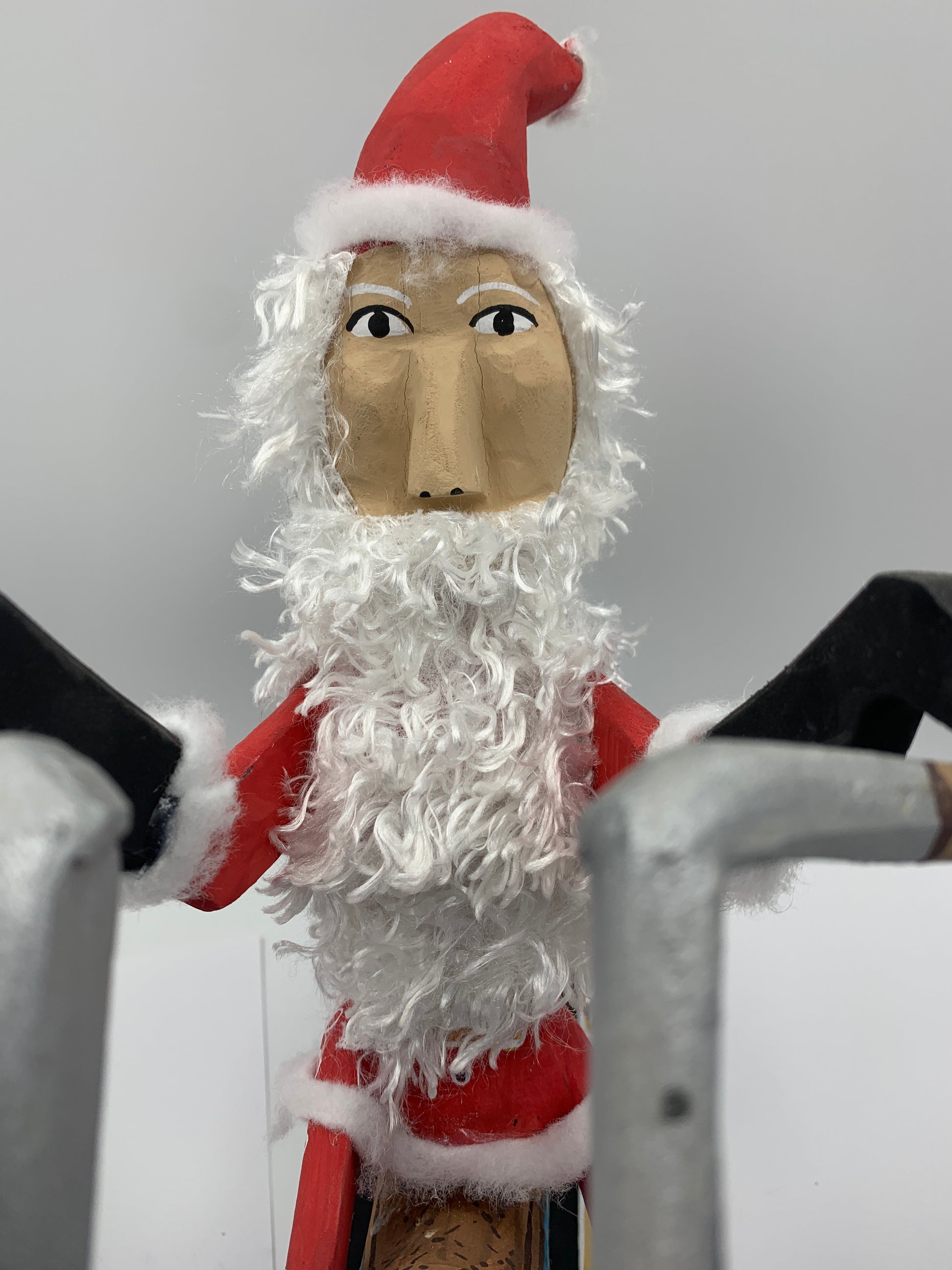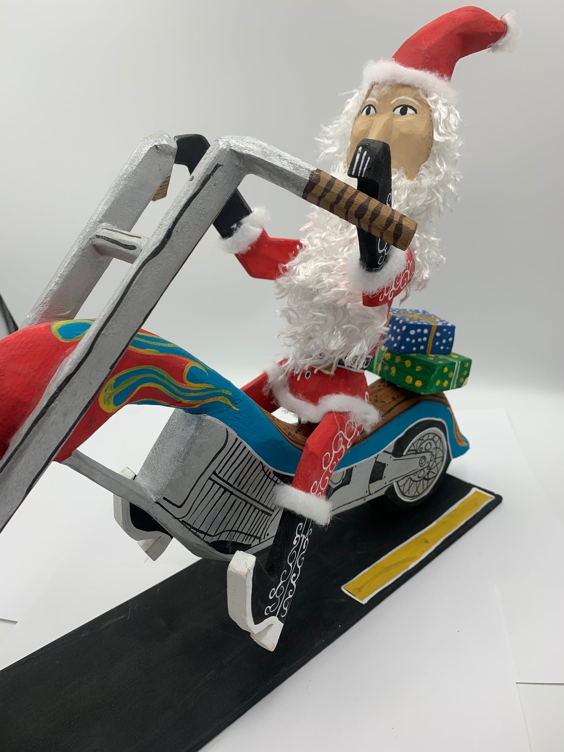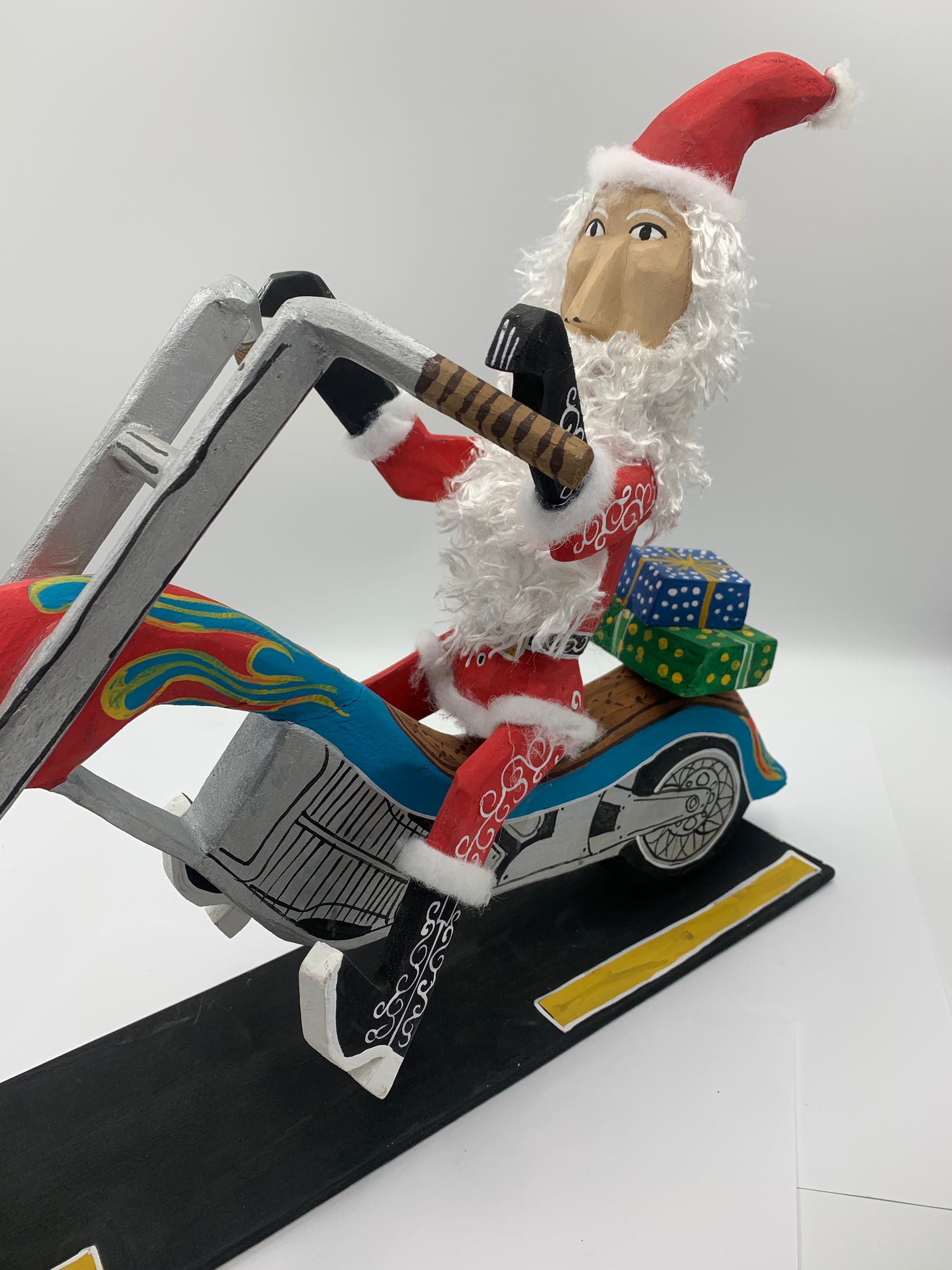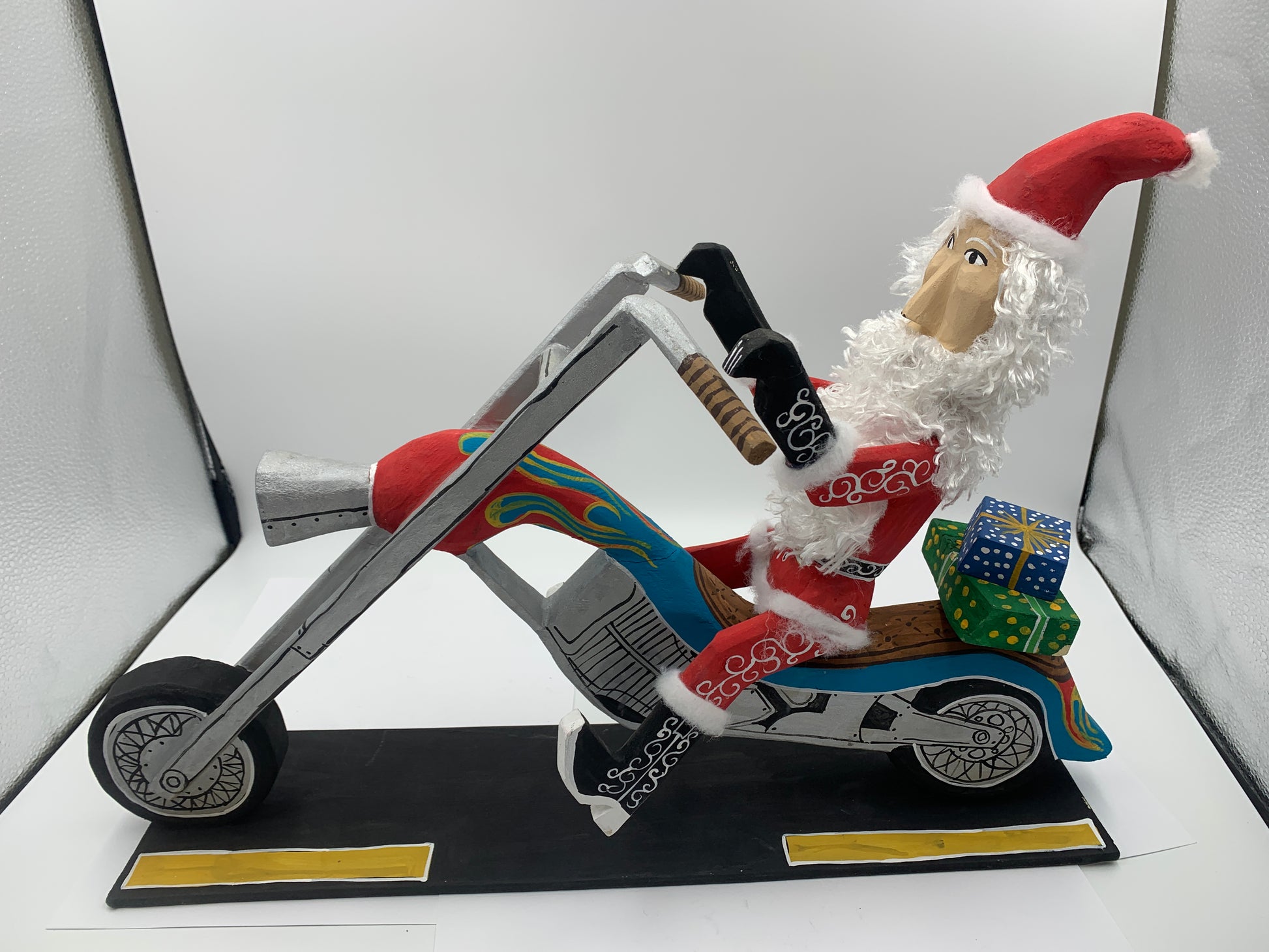 This is a Handcrafted folk-art piece by Delbert Buck of the Navajo Nation. The Santa on Harley stands about 13 inches tall and about 18 x 5 inches wide. The wood pieces are hand carved and painted by Delbert Buck of the Navajo Nation.