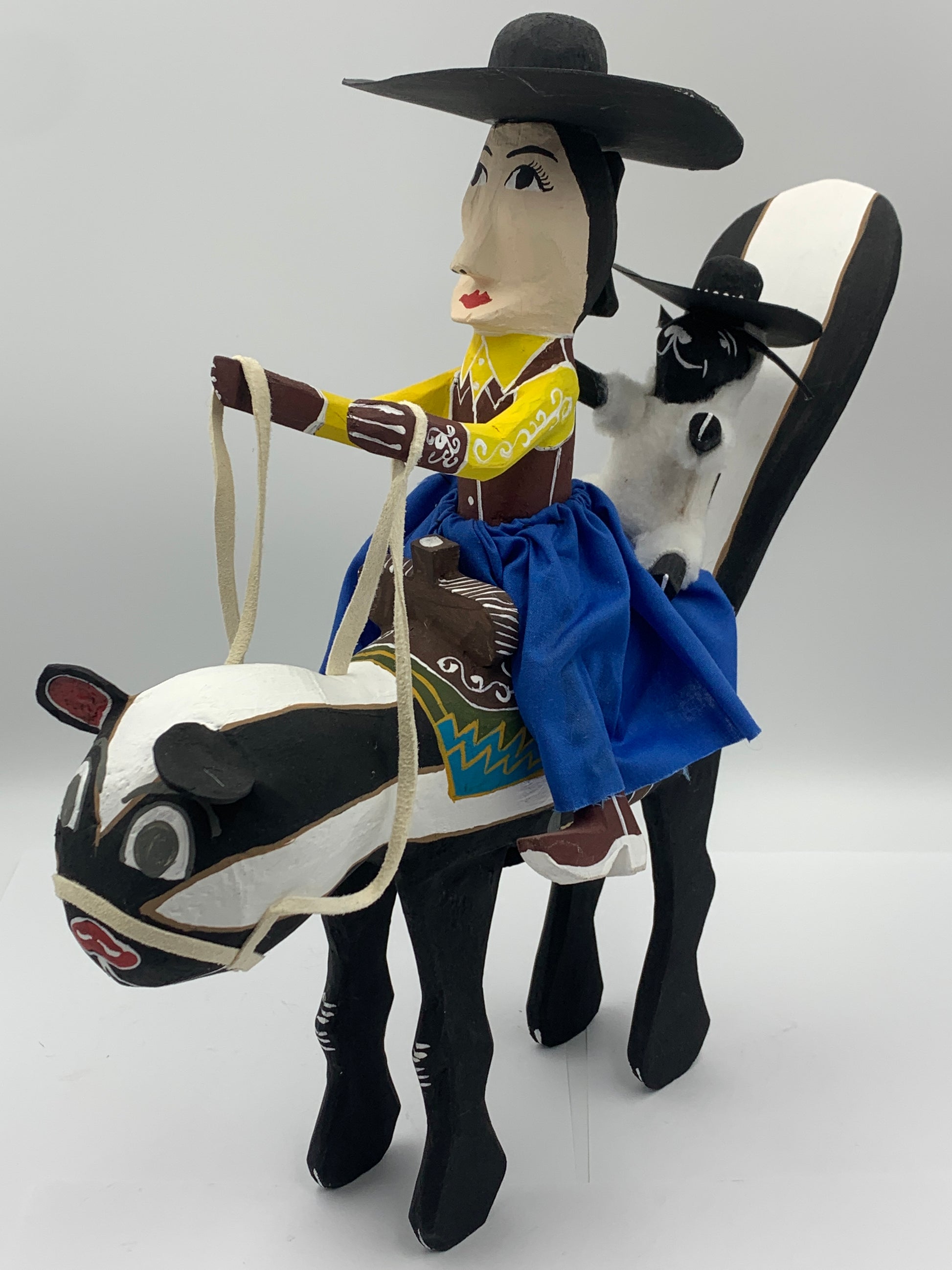 This is a Handcrafted folk-art piece by Delbert Buck of the Navajo Nation. The Skunk Rider Guy stands about 13 inches tall and about 13 x 5 inches wide. The wood pieces are hand carved and painted by Delbert Buck of the Navajo Nation.