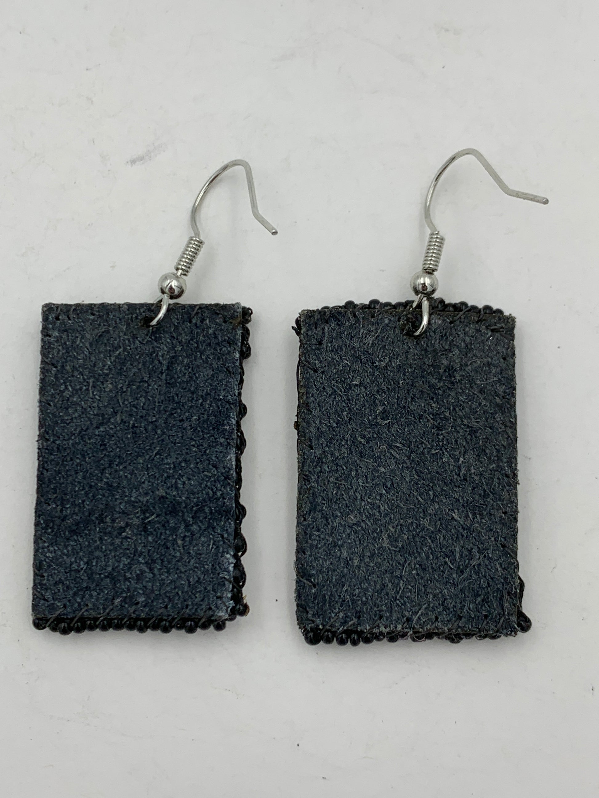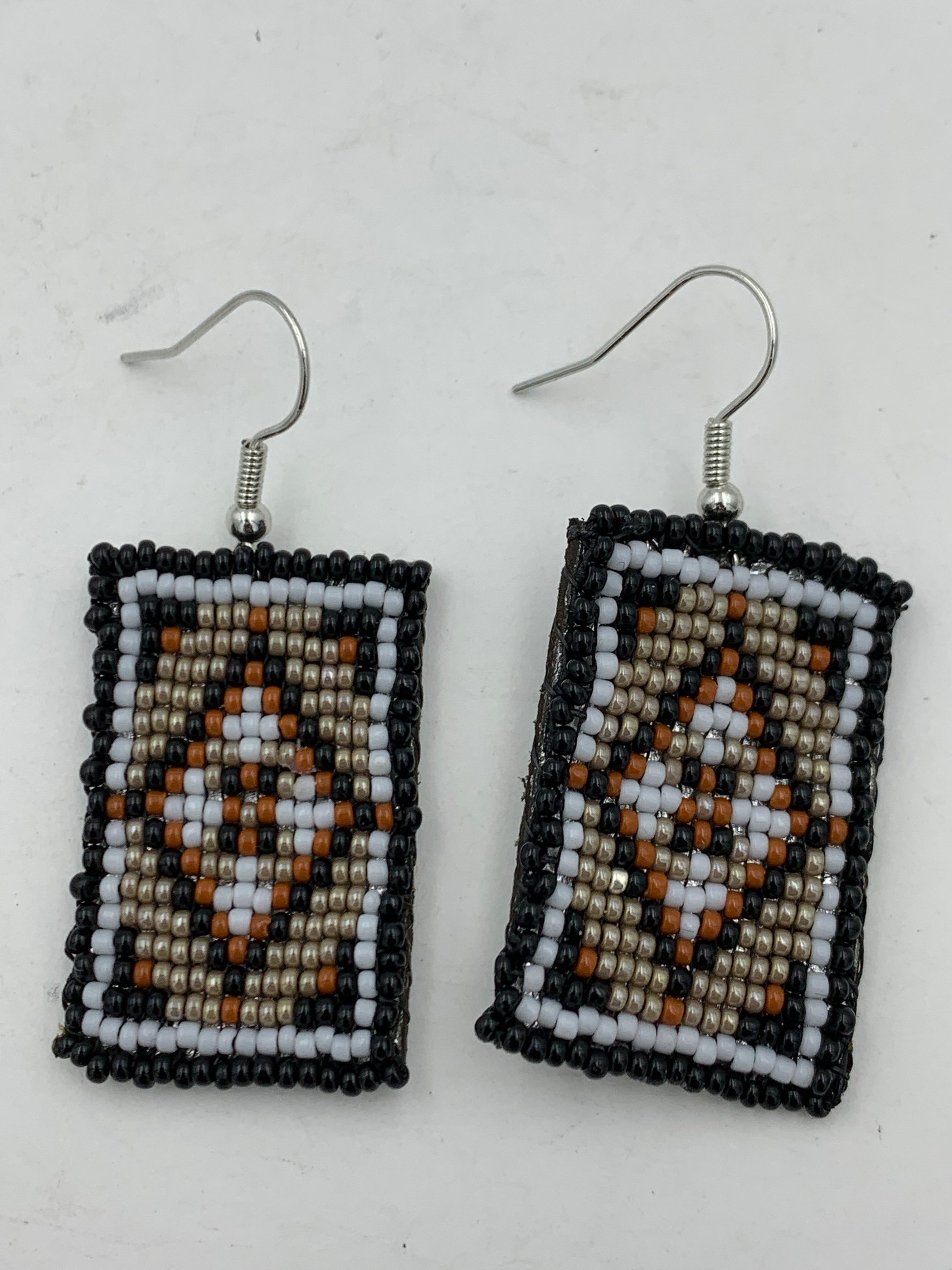 These Laser cut beaded leather earrings match size and design of some of our Apple Watch Bands for Apple Watch 38/40/41. The Bead work is done by Dwight Nathaniel of the Navajo Nation. The beads are made of glass and have a rug design that nicely matches the leather watch band. The bead work is hand sewn onto the leather. The earring loops are stainless steel.