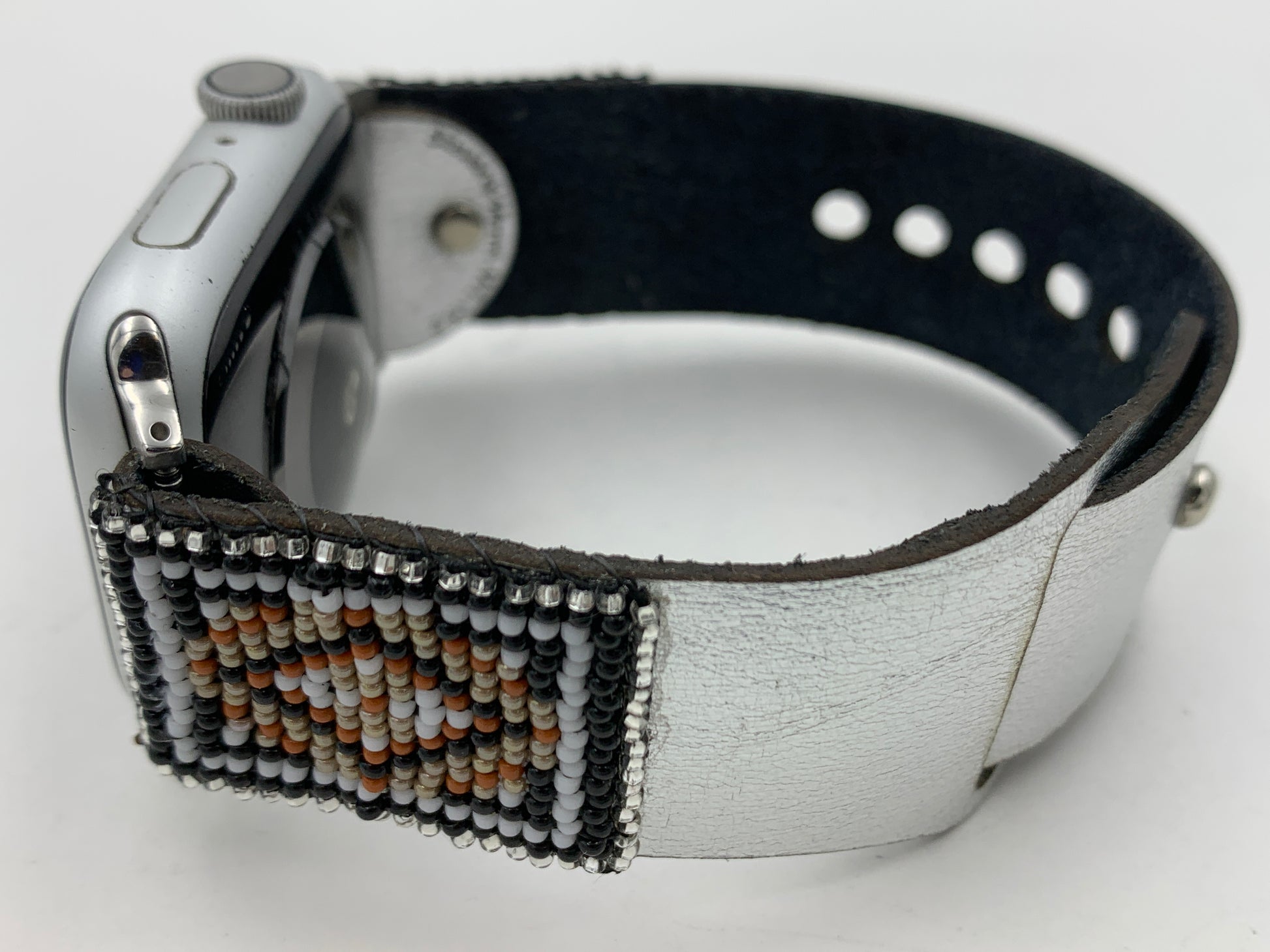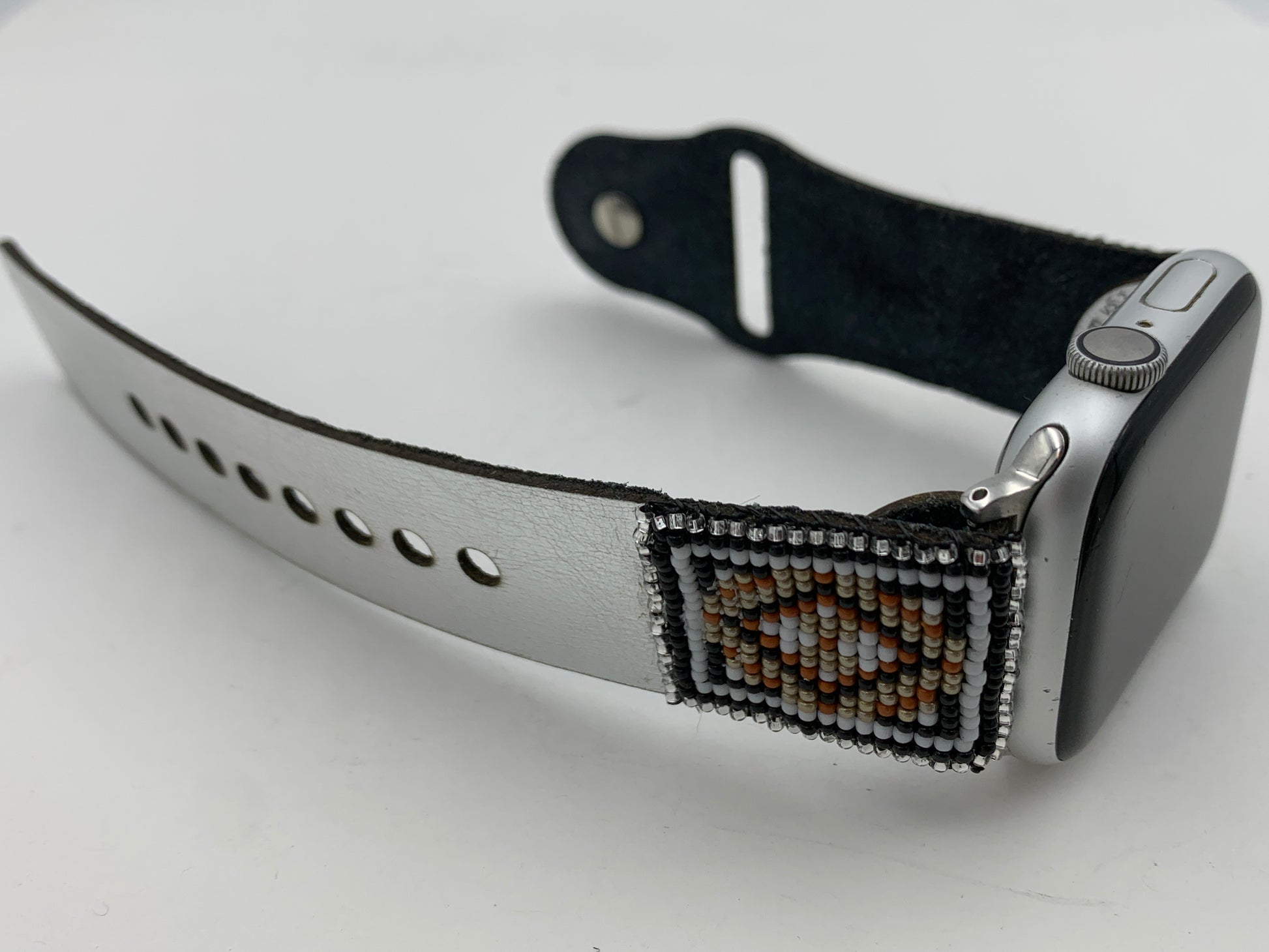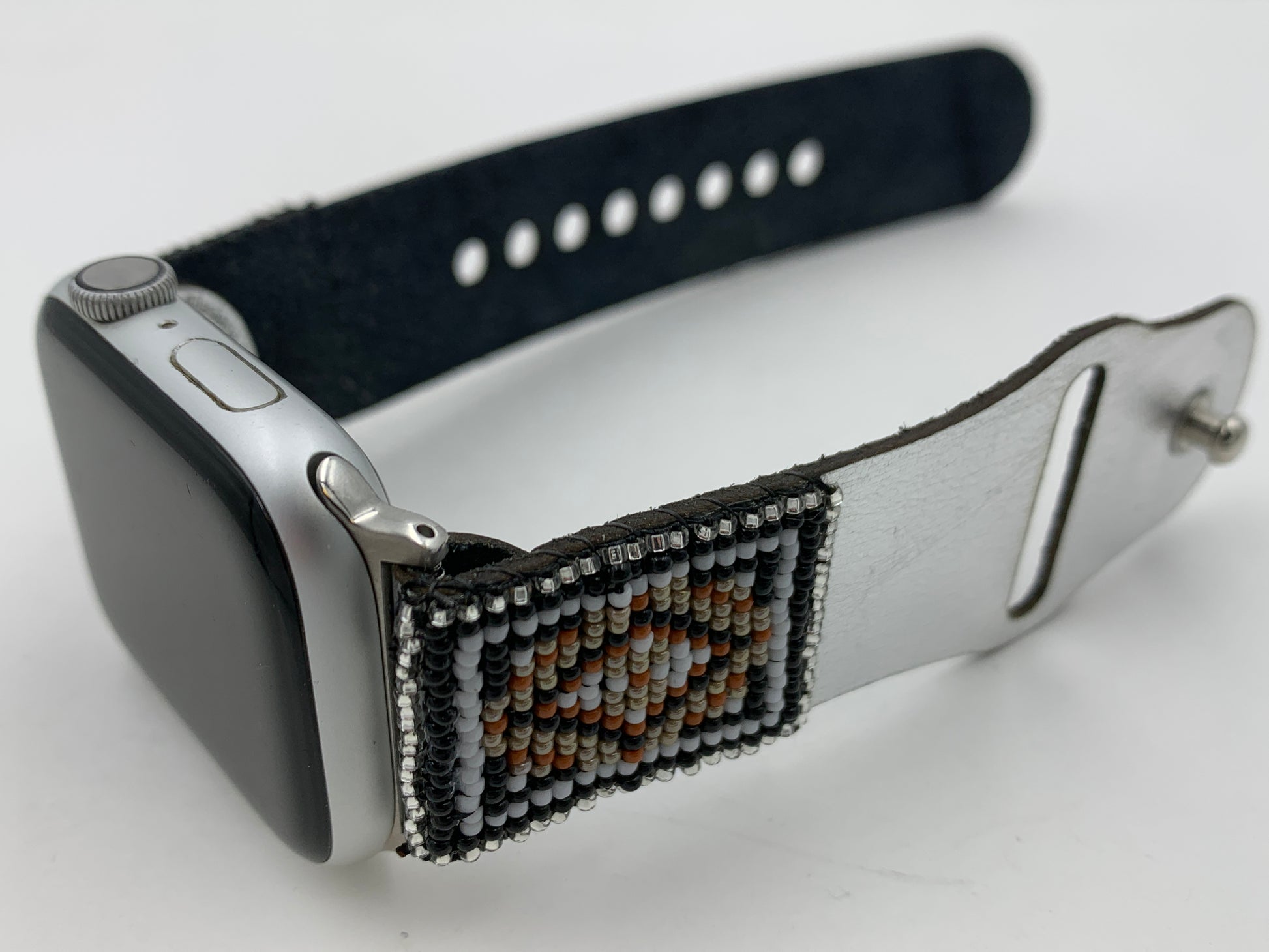 This Laser cut beaded leather band works with Apple Watch Series 1 42mm thru Series 9 45mm and is the M/L size. The Bead work is done by Dwight Nathaniel of the Navajo Nation. This band is v5.2 and has a smaller button and smaller holes and will last longer than previous versions. The beads are made of glass and have a rug design that nicely matches the silver leather band. The band is similar to the original Apple Watch bands but is made of leather which is about 1.2mm thick. The leather has a silver color on one side and has a water-resistant coating on the inside. The bead work is hand sewn onto the leather. Only the M/L is available with this band. The bands work with Apple Watch Series 1 42mm thru Series 9 45mm. There are matching earrings #3 or #4 for this band. This band will also work with the new Apple Watch Ultra 49mm.