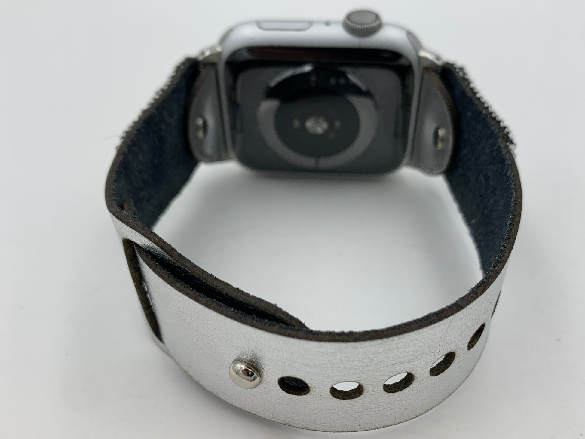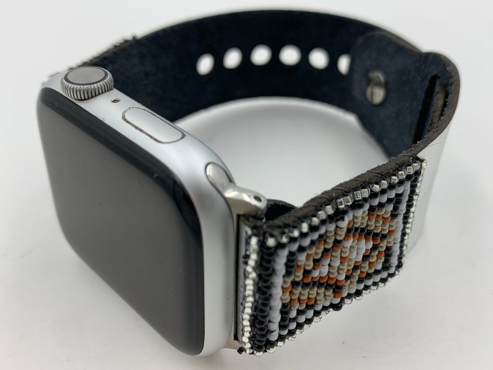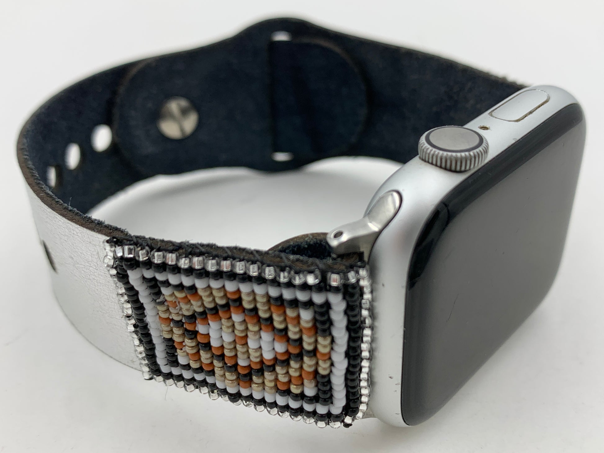 This Laser cut beaded leather band works with Apple Watch Series 1 42mm thru Series 9 45mm and is the M/L size. The Bead work is done by Dwight Nathaniel of the Navajo Nation. This band is v5.2 and has a smaller button and smaller holes and will last longer than previous versions. The beads are made of glass and have a rug design that nicely matches the silver leather band. The band is similar to the original Apple Watch bands but is made of leather which is about 1.2mm thick. The leather has a silver color on one side and has a water-resistant coating on the inside. The bead work is hand sewn onto the leather. Only the M/L is available with this band. The bands work with Apple Watch Series 1 42mm thru Series 9 45mm. There are matching earrings #3 or #4 for this band. This band will also work with the new Apple Watch Ultra 49mm.