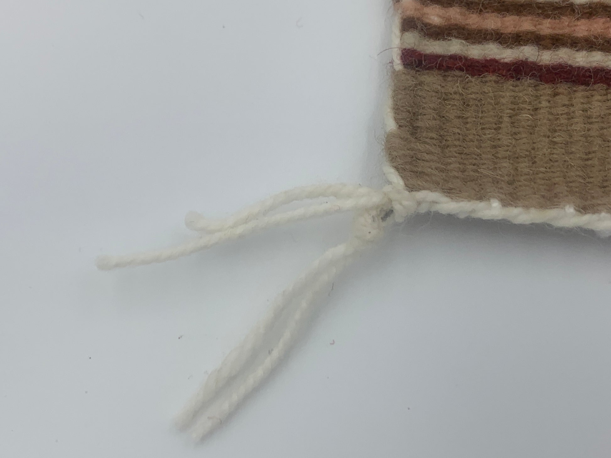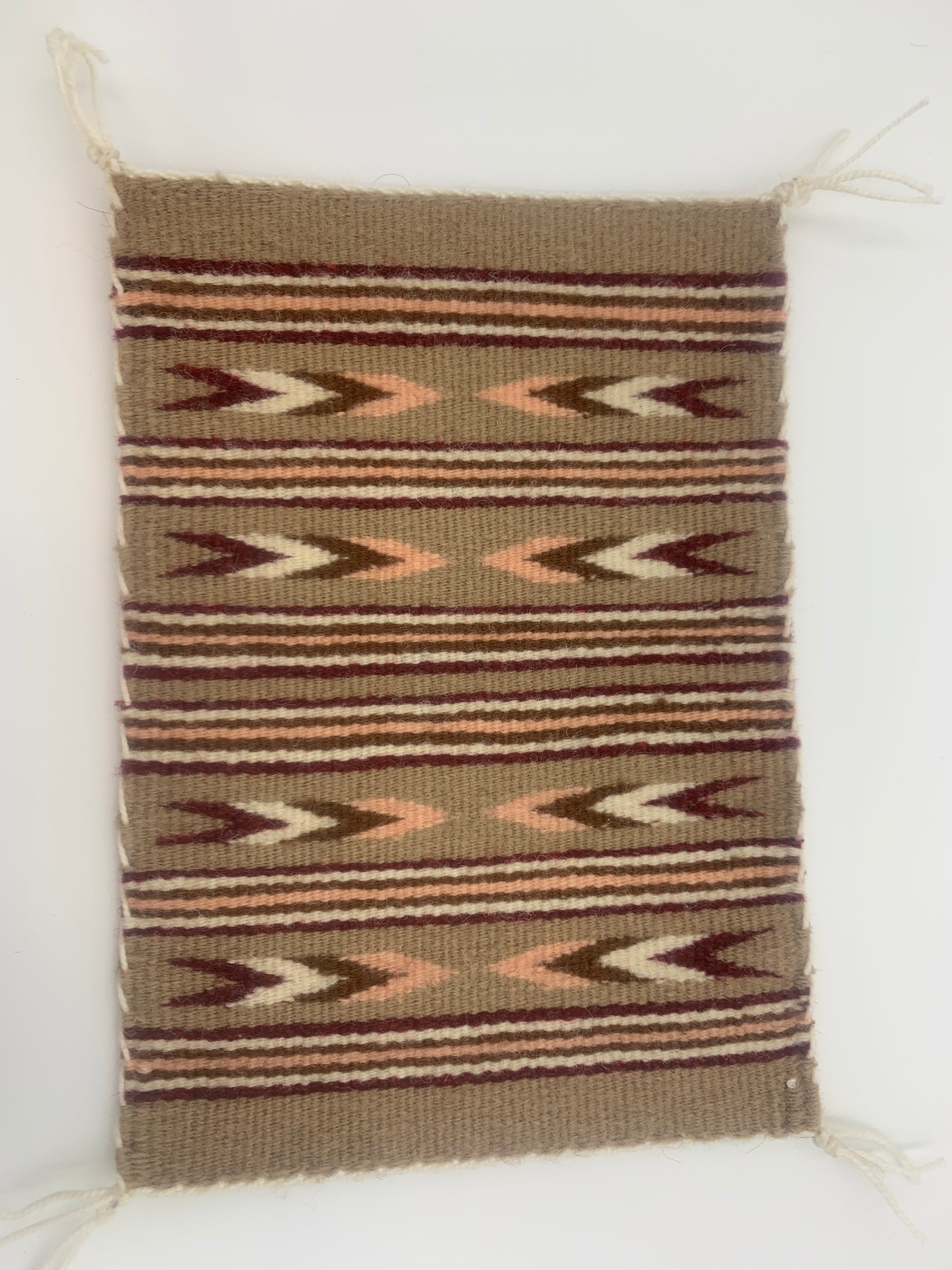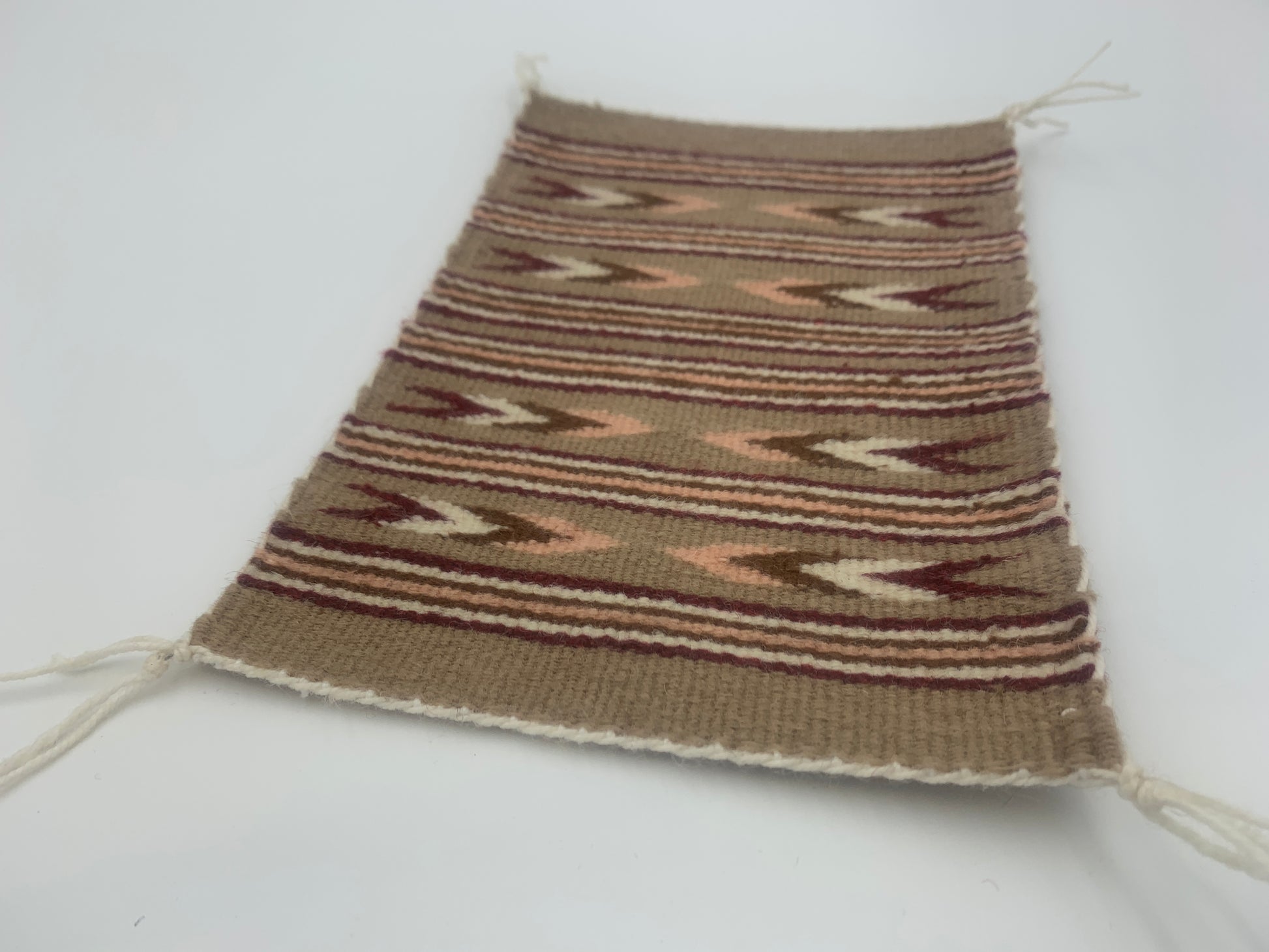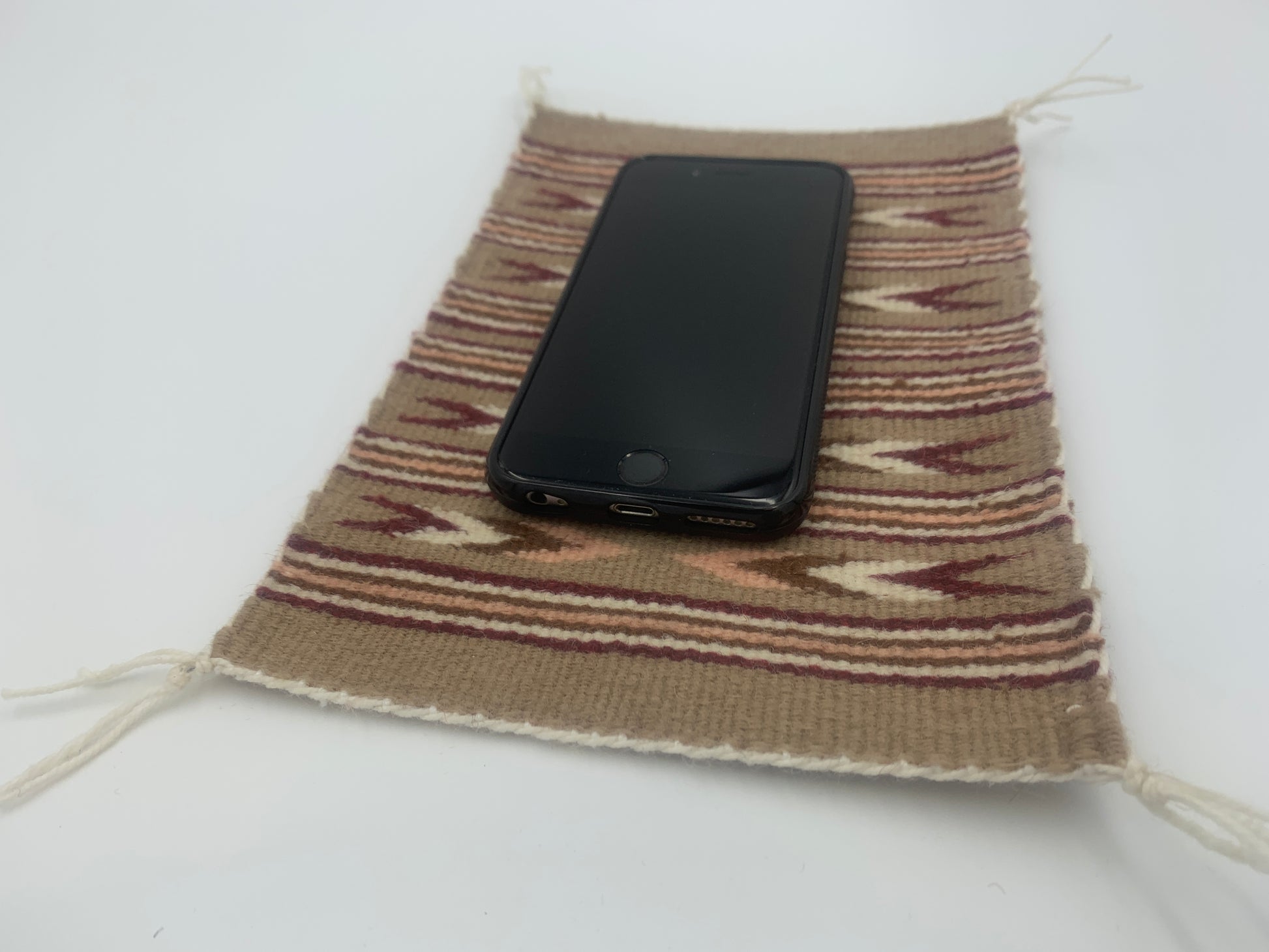 Handmade Chinle Mini Tapestry iRug by Elouise Bia of the Navajo Nation. iRug Measures about 8 1/2" x 6 1/2" made using Fine Tapestry Wool Thread. Chinle rugs typically feature bands of repeating geometric motifs alternated with plain or striped bands of contrasting colors. Common colors for Chinle rugs include yellow, gold, brown, tan, terra cotta, soft pink and other earth tones, as well as natural wool colors ranging from white to black.This is a rare handmade item and can be used to rest and charge your Apple iPhone as shown.