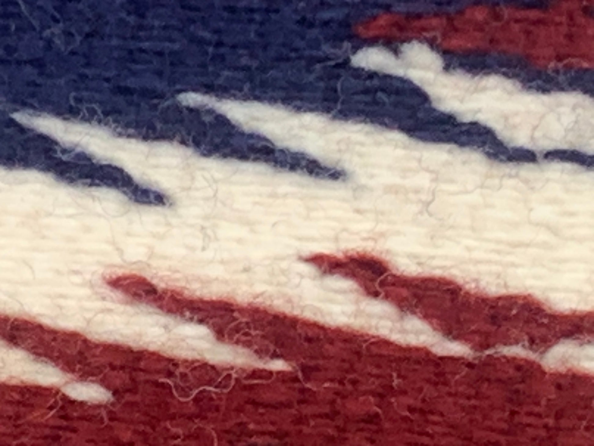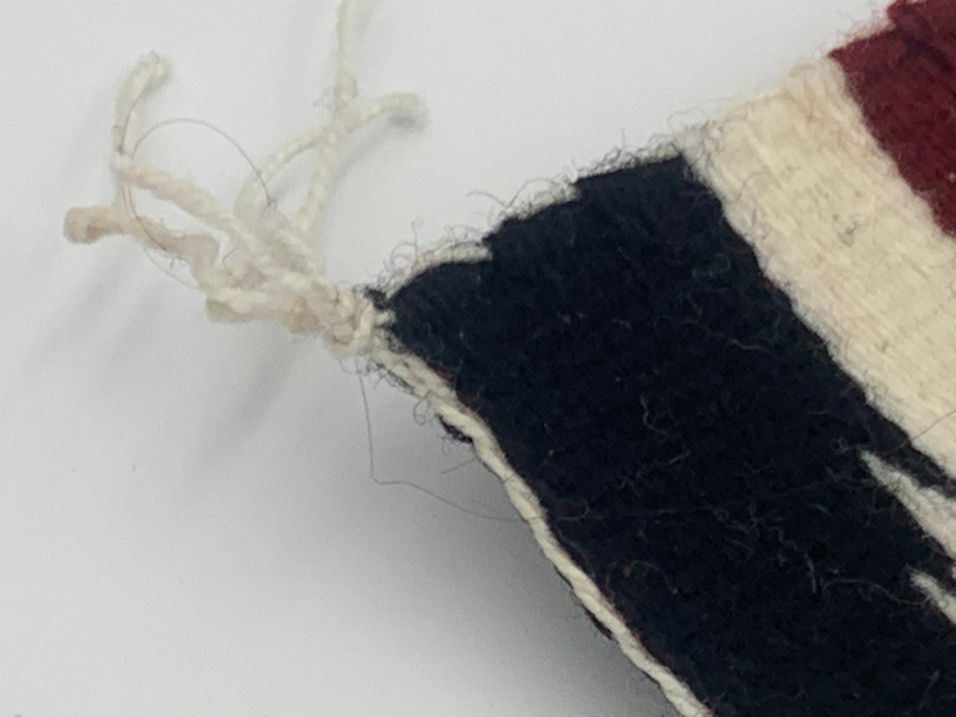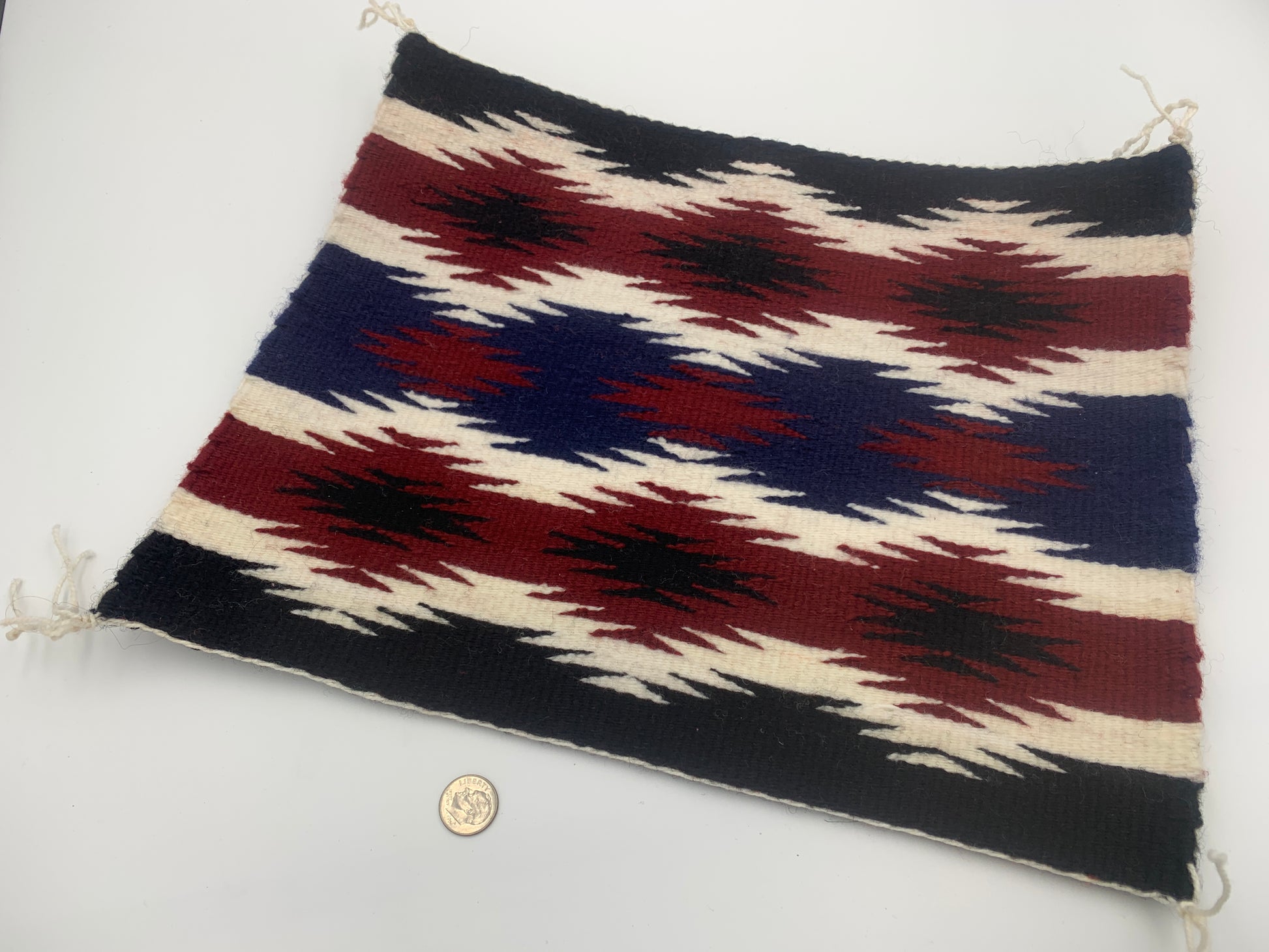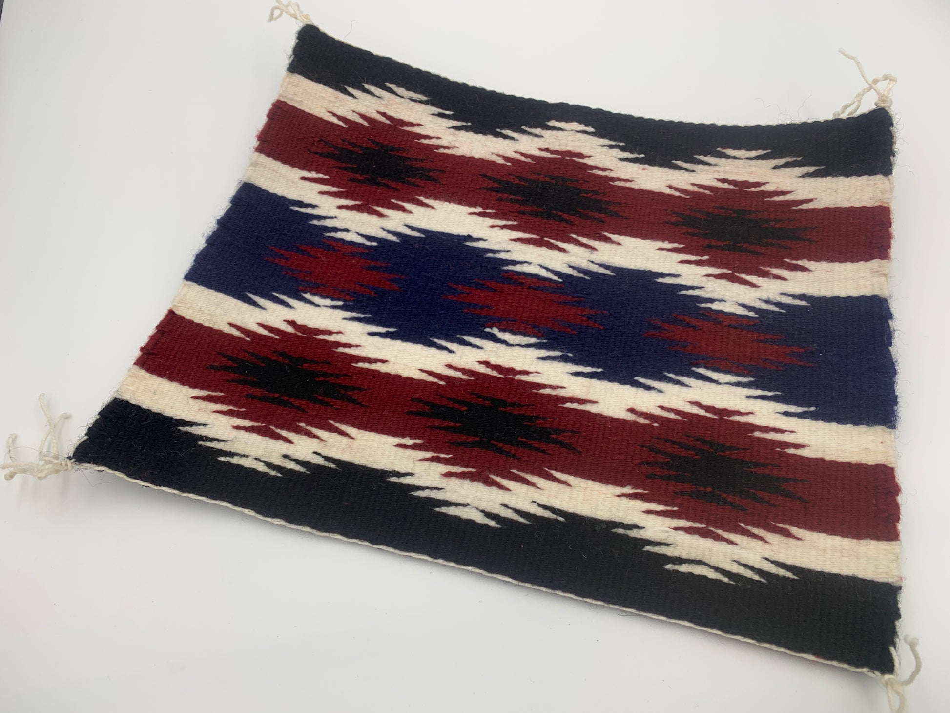 This is a handmade Third Phase Chief Mini iRug by Elouise Bia of the Navajo Nation. iRug Measures about 13" x 10" and has a fine wool tapestry weave with tasseled corners. The Chief Rug usually has a plain design in blue, red, black and white. Third Phase Chiefs are the most popular today and often have stepped triangles. The third Phase added short red bars to the design. This is a rare handmade item and can be used to rest and charge your Apple Devices and Accessories as shown.