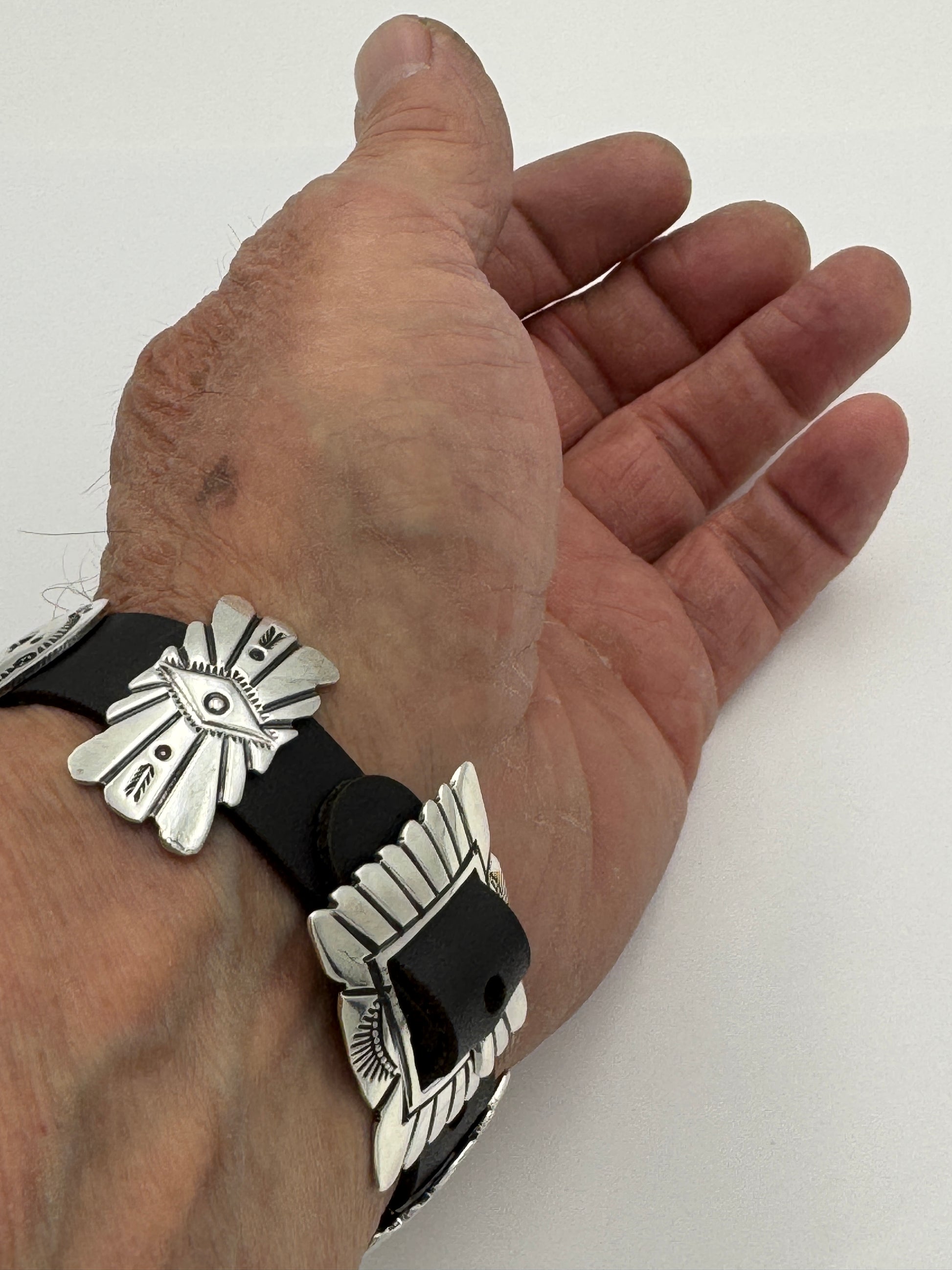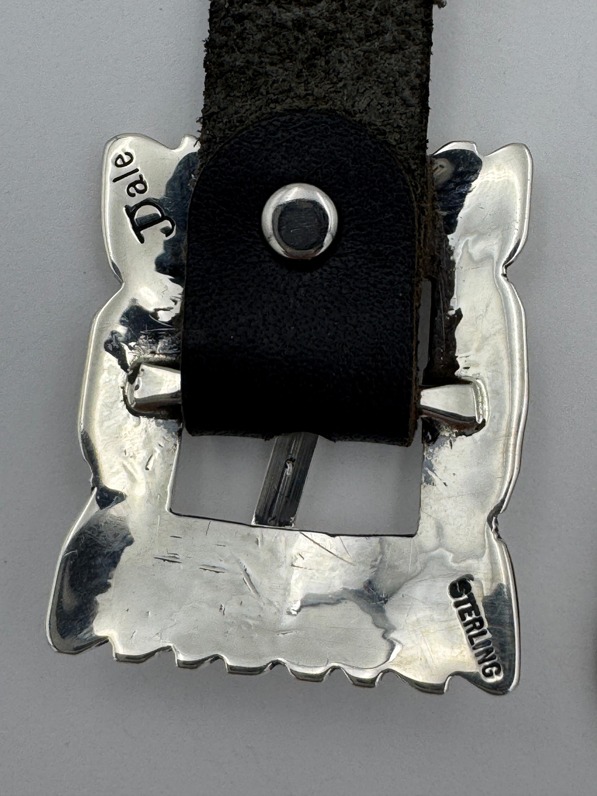 The Silverwork, which is done by Navajo Silversmith Jeanette Dale from Tocito, New Mexico, includes two oval silver Conchos, two silver butterflies and a buckle on a leather band. The Buckle has the Jeanette "Dale" authentication artist Stamp and a Sterling mark. The Conchos and butterflies are hand stamped with a traditional symbols Design.