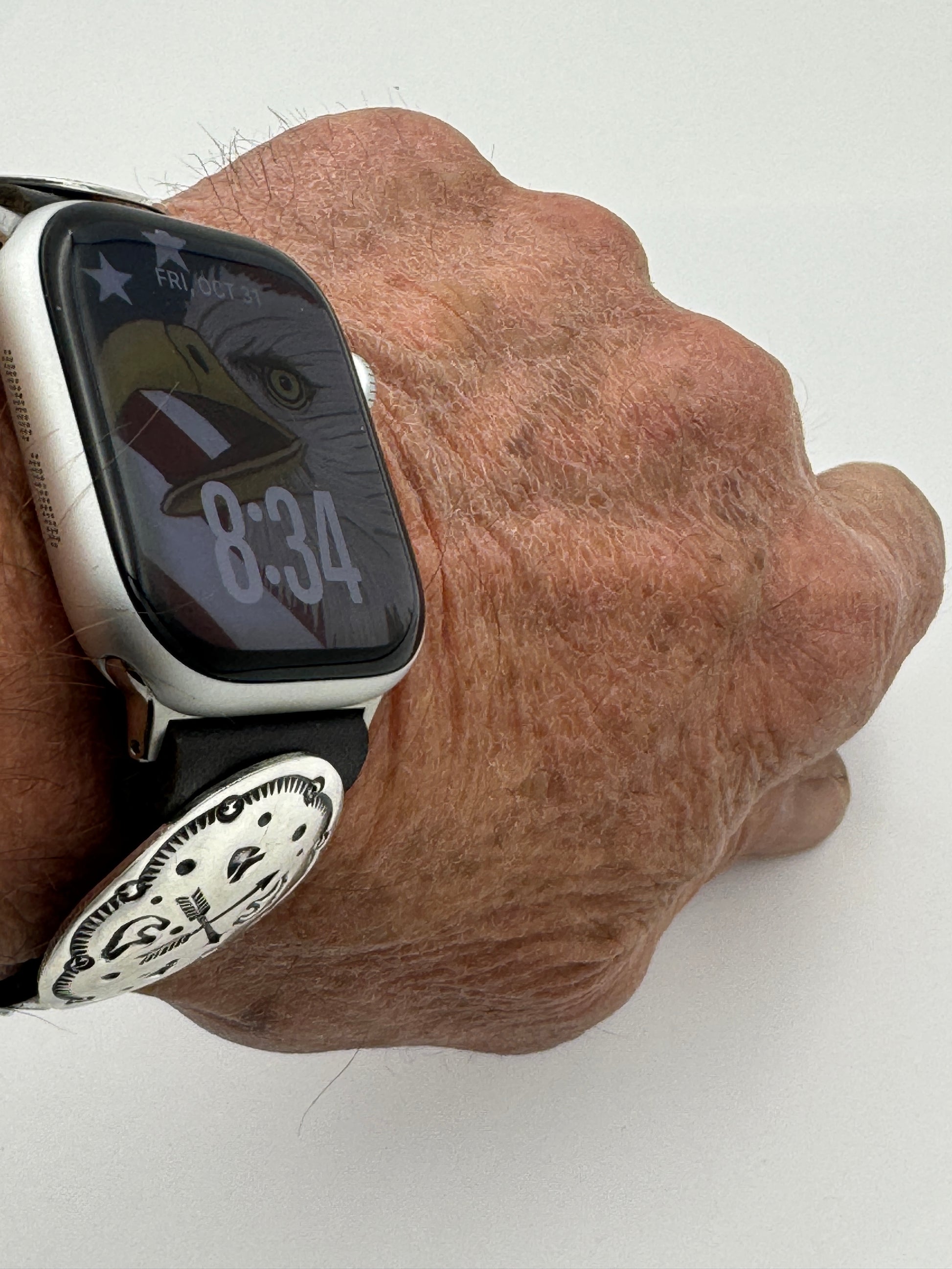 The Conchos, Butterflies and Buckle are held firmly in place with our latest adjustable Riveted black colored Leather S/M-4 band v2.0. The Leather Band comes with 38/40/41/42mm Apple Watch adaptors and can be sized to fit a small to large sized wrist. By changing the leather, we can make this band fit virtually any wrist nicely. Be sure and leave valid contact information so we can contact you to assure a nice fit. The iBand will seamlessly integrate with the Apple Watch 38mm Series 1 thru Series 10 42mm. Slip your Apple WATCH onto the band, buckle up and slide the Conchos and Butterflies around to get a perfect arrangement and comfortable fit for your wrist. We can convert this to a 42/44/45/46mm if you have the bigger Watch. Different colors of leather are available upon request.