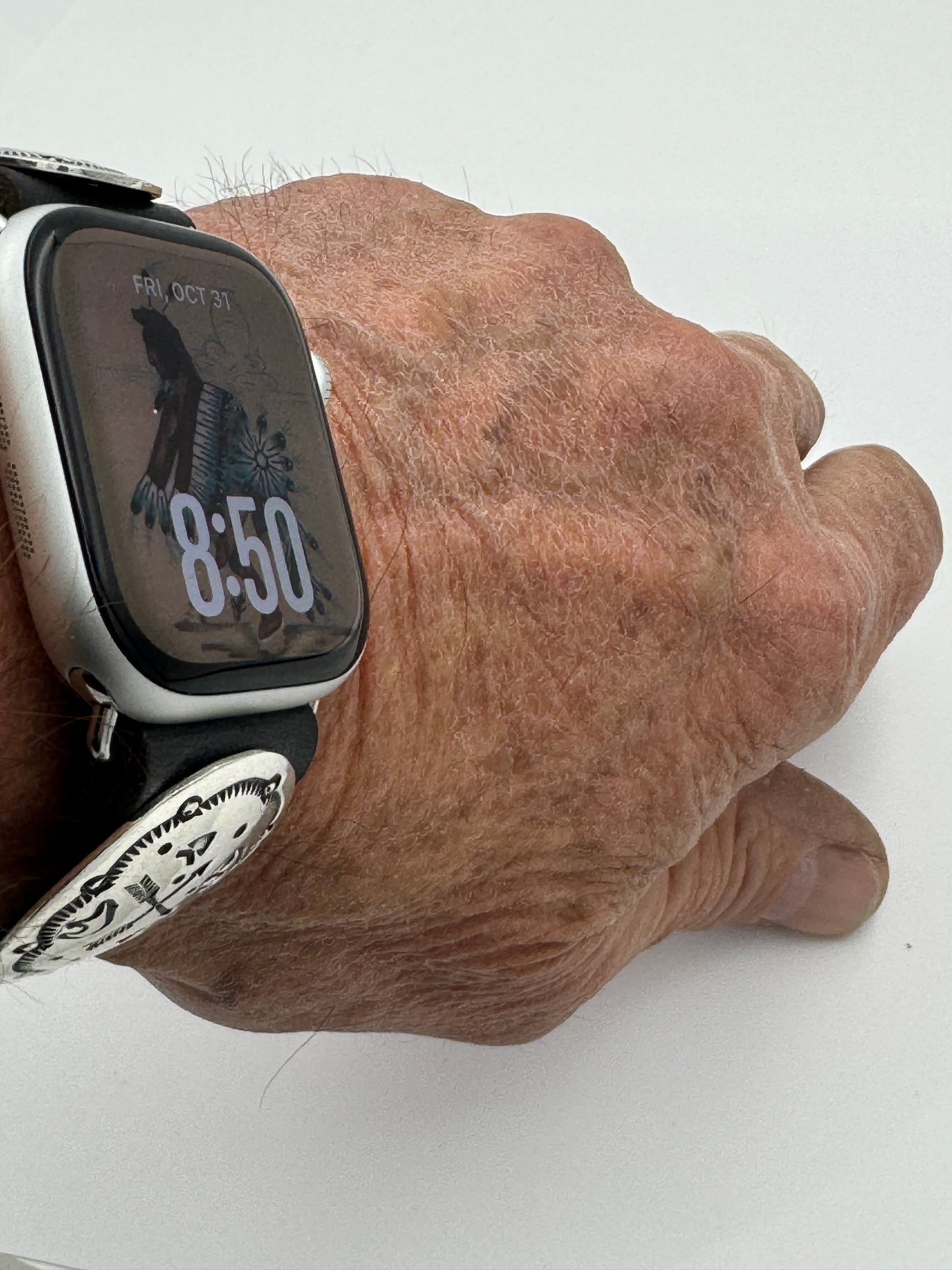 The Conchos, Butterflies and Buckle are held firmly in place with our latest adjustable Riveted black colored Leather S/M-6 band v2.0. The Leather Band comes with 38/40/41/42mm Apple Watch adaptors and can be sized to fit a small to large sized wrist. By changing the leather, we can make this band fit virtually any wrist nicely. Be sure and leave valid contact information so we can contact you to assure a nice fit. The iBand will seamlessly integrate with the Apple Watch 38mm Series 1 thru Series 10 42mm. Slip your Apple WATCH onto the band, buckle up and slide the Conchos and Butterflies around to get a perfect arrangement and comfortable fit for your wrist. We can convert this to a 42/44/45/46mm if you have the bigger Watch. Different colors of leather are available upon request.