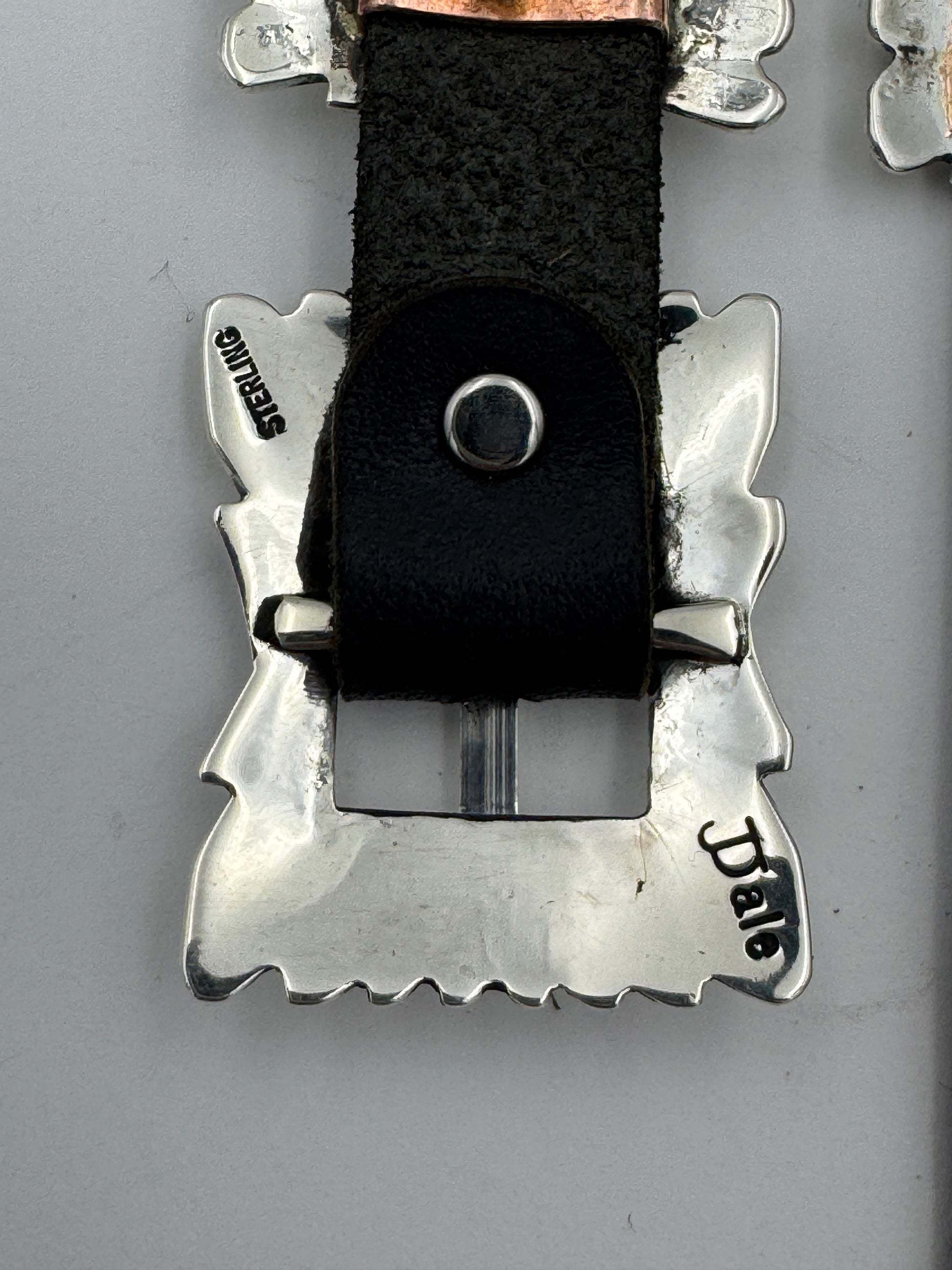 The Silverwork, which is done by Navajo Silversmith Jeanette Dale from Tocito, New Mexico, includes two oval silver Conchos, two silver butterflies and a buckle on a leather band. The Buckle has the Jeanette "Dale" authentication artist Stamp a Sterling mark. The Conchos and butterflies are hand stamped with a traditional symbols Design.