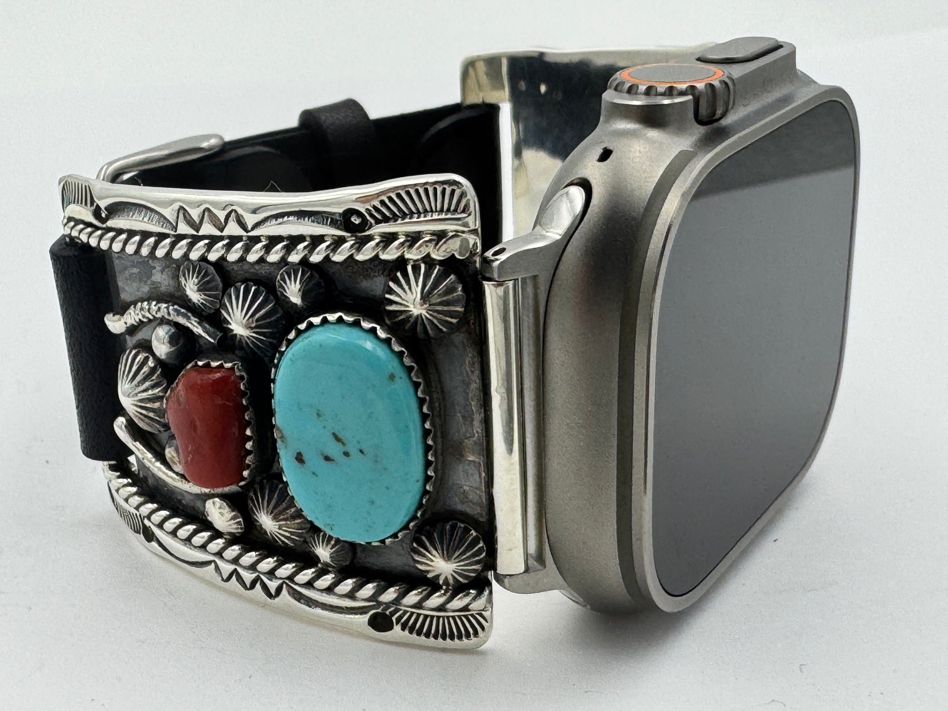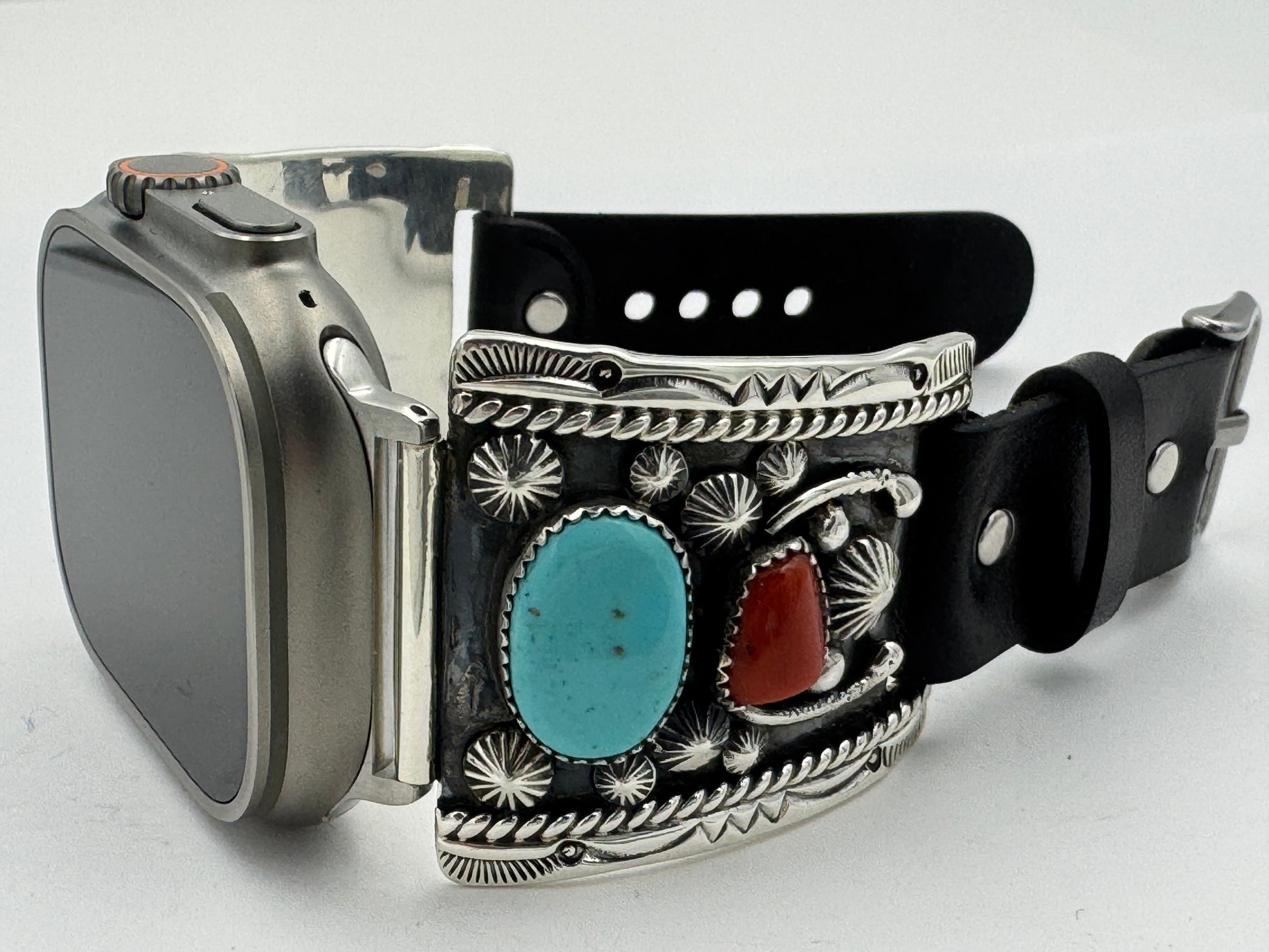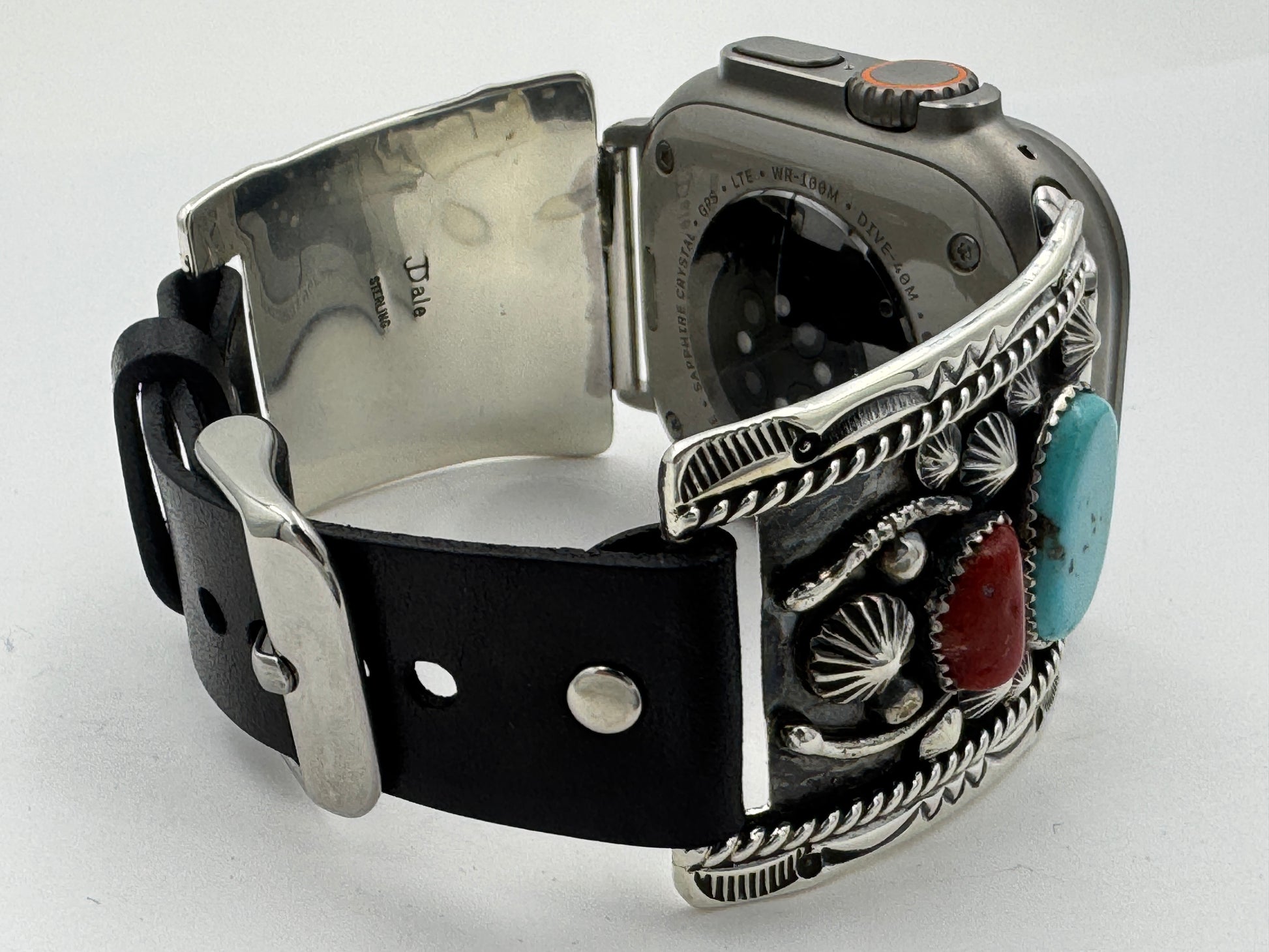 This is Jeanette Dale's 136th Bilasáana piece offered. The iBand consists of two Sterling Silver Tips with 42/44/45/46/49mm WATCH adapters and a Laser Cut Leather Band. The Sterling Silver Tips are Handcrafted by Jeanette Dale of the Navajo Nation and have an authentic Navajo Twisted Wire Leaf Design with Kingman Turquoise and Coral. On the inside of one Tip is the official Bilasáana Trademark. The other tip has a Sterling mark and Jeanette's JDale mark.