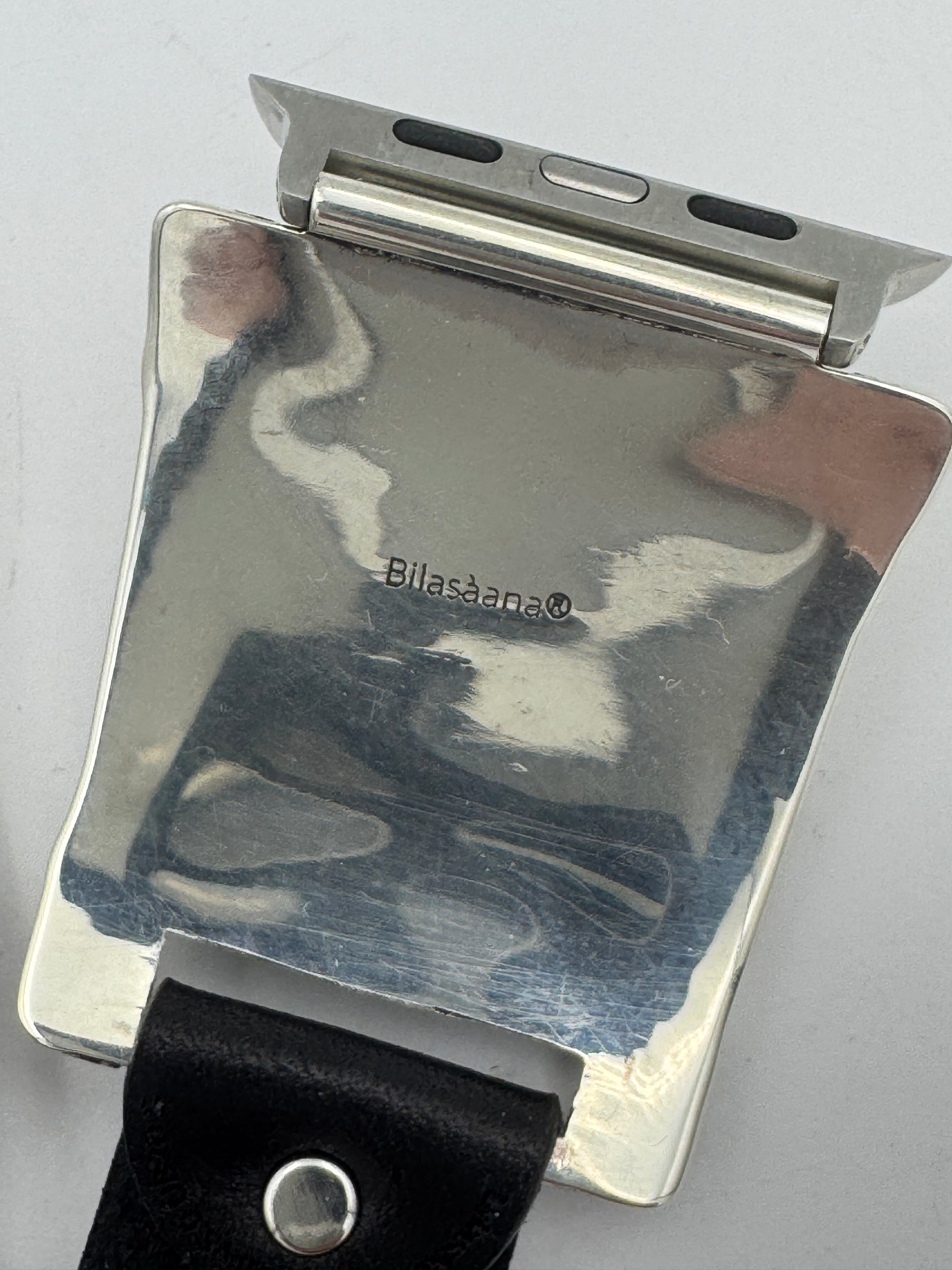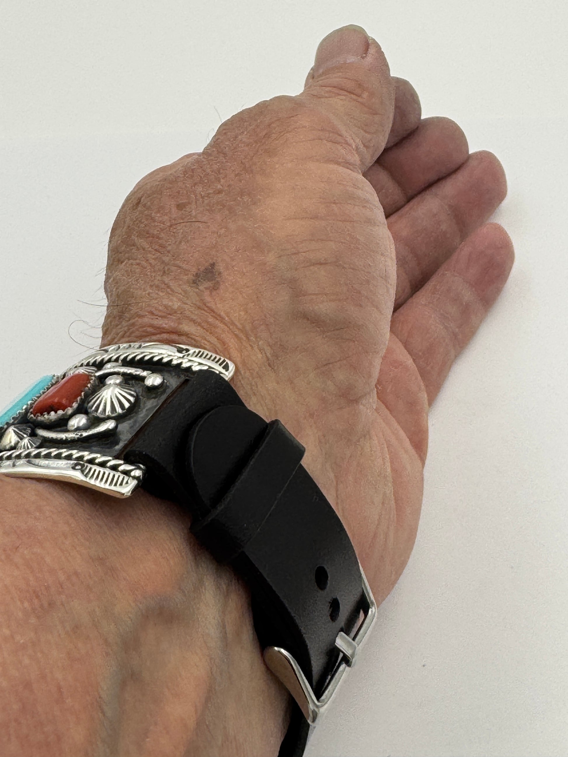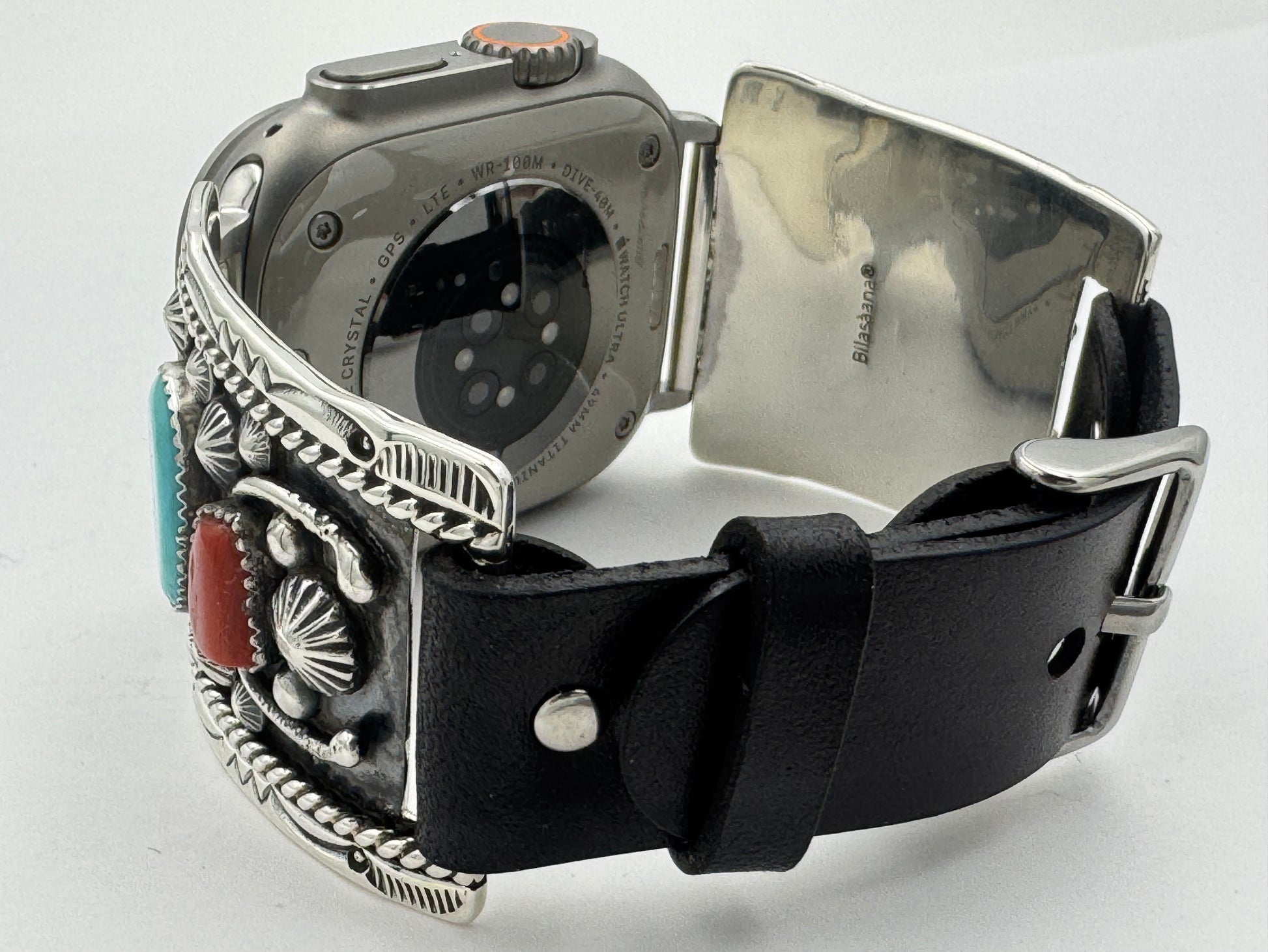 This is Jeanette Dale's 136th Bilasáana piece offered. The iBand consists of two Sterling Silver Tips with 42/44/45/46/49mm WATCH adapters and a Laser Cut Leather Band. The Sterling Silver Tips are Handcrafted by Jeanette Dale of the Navajo Nation and have an authentic Navajo Twisted Wire Leaf Design with Kingman Turquoise and Coral. On the inside of one Tip is the official Bilasáana Trademark. The other tip has a Sterling mark and Jeanette's JDale mark.