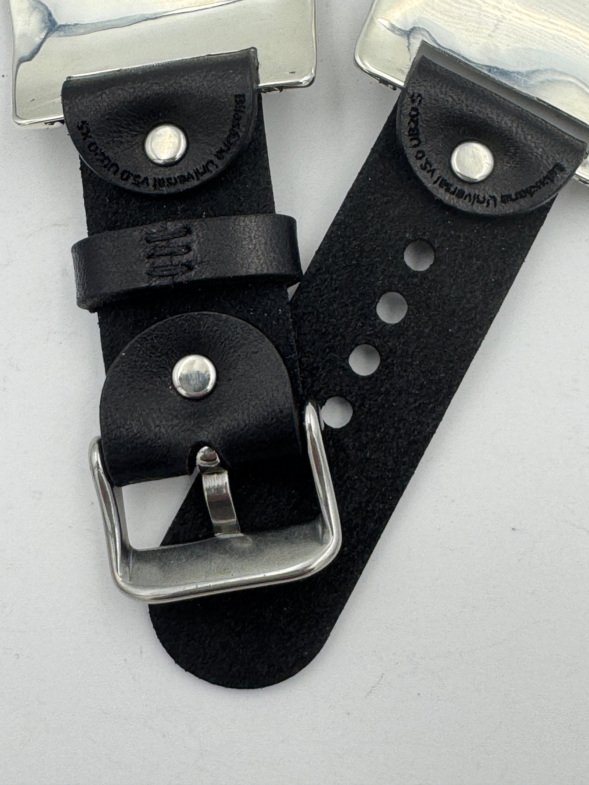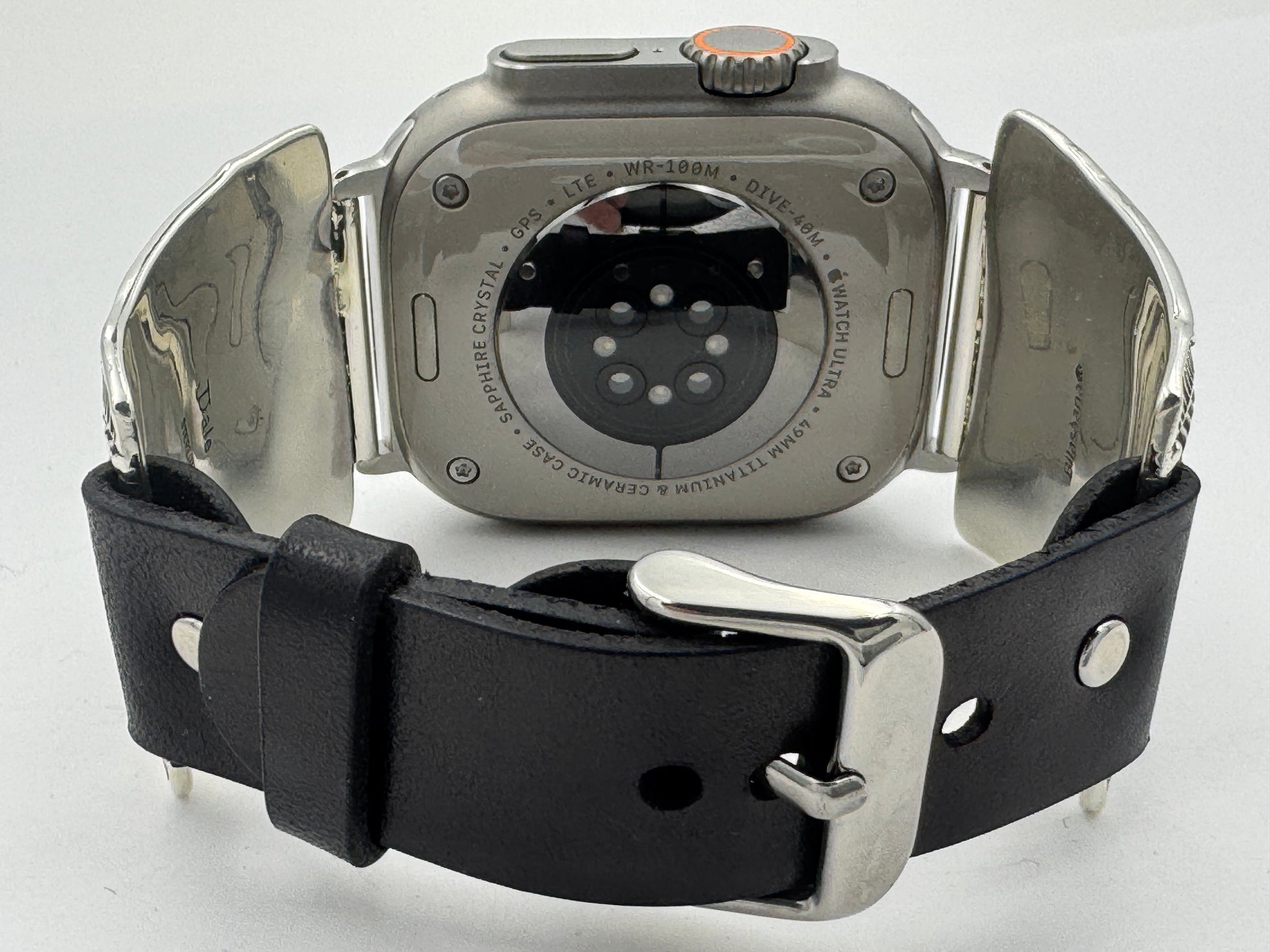 The iBand comes with a choice of our new Laser Cut Riveted bands in a variety of colors. The iBand shown has our XS-4 20mm Black Leather Buckle Band v5.0 with a hand sewn loop attached. This is a wider band from previous versions and is a great piece for a small to large size wrist. By changing the leather we can make this band fit virtually any wrist nicely. Brown, Buckskin and other colors of leather available. Choose your band size at checkout and we will contact you to assure a nice fit. The iBand will seamlessly integrate with the Apple 42mm Series 1 thru Series 10 46mm WATCH. This band was specifically designed to work with the New Apple Watch 49mm Ultra series I or II. We can also easily adapt this band to the Samsung Ultra Watch.