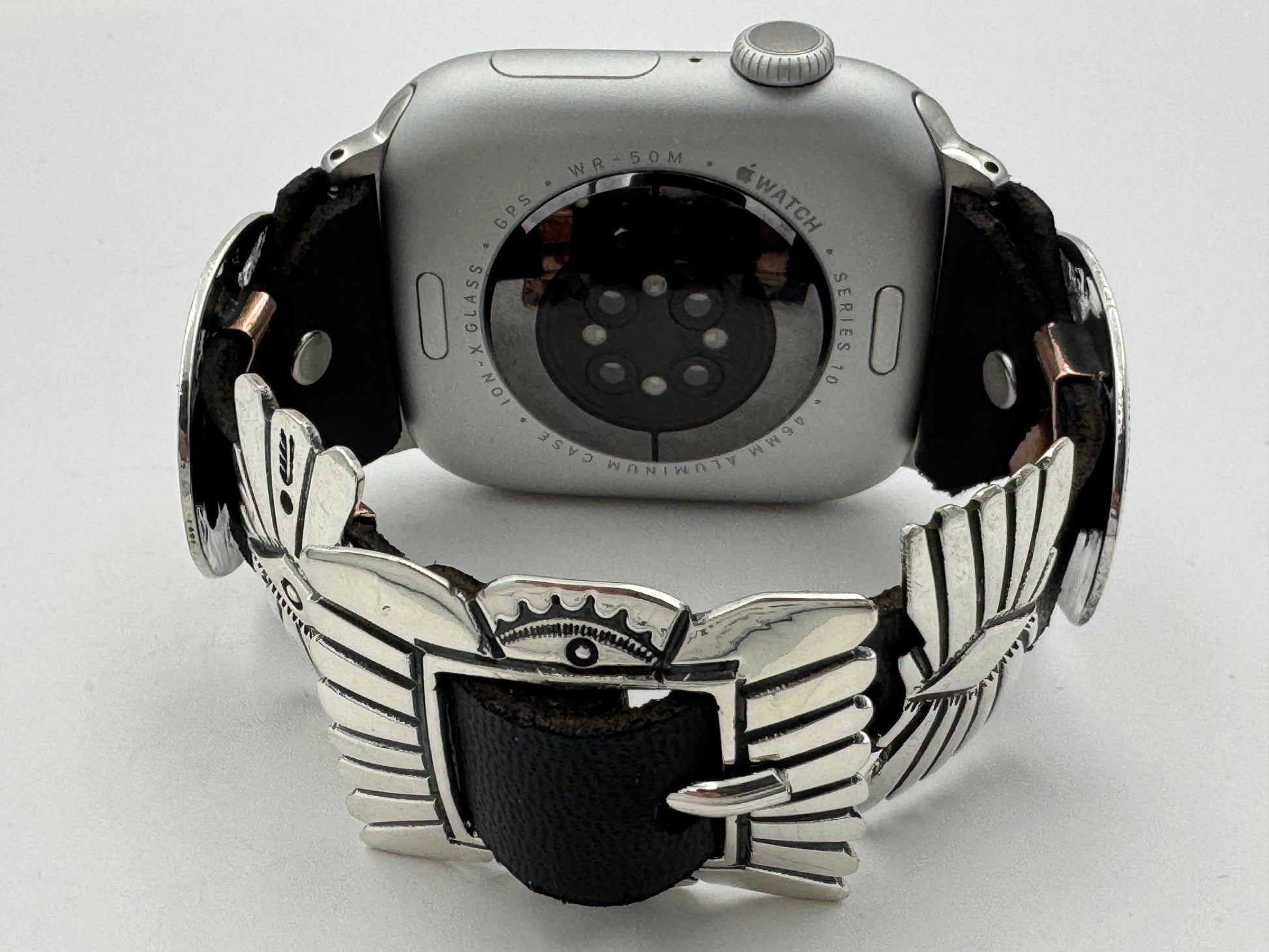 The Conchos, Butterflies and Buckle are held firmly in place with our latest adjustable Riveted black colored Leather XXS-3 band v2.0. The Leather Band comes with 42/44/45/46mm Apple Watch adaptors and can be sized to fit a small to large sized wrist. By changing the leather, we can make this band fit virtually any wrist nicely. Be sure and leave valid contact information so we can contact you to assure a nice fit. The iBand will seamlessly integrate with the Apple Watch 42mm Series 1 thru 46mm Series 10. Slip your Apple WATCH onto the band, buckle up and slide the Conchos and Butterflies around to get a perfect arrangement and comfortable fit for your wrist. We can convert this to a 38/40/41/42mm if you have the smaller Watch. Different colors of leather are available upon request.