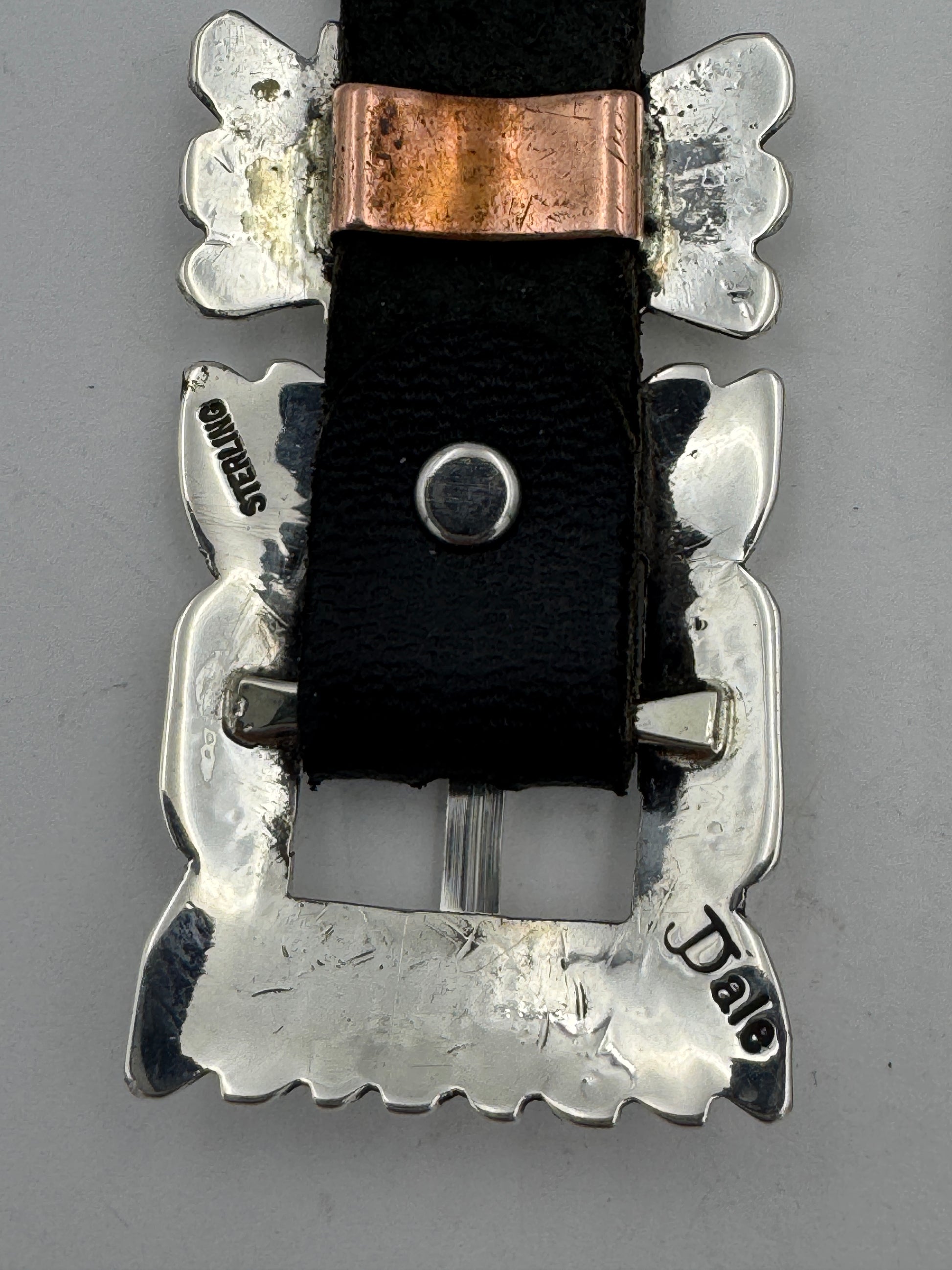 The Silverwork, which is done by Navajo Silversmith Jeanette Dale from Tocito, New Mexico, includes two oval silver Conchos, two silver butterflies and a buckle on a leather band. The Buckle has the Jeanette "Dale" authentication artist Stamp and a Sterling mark. The Conchos and butterflies are hand stamped with a traditional symbols design.