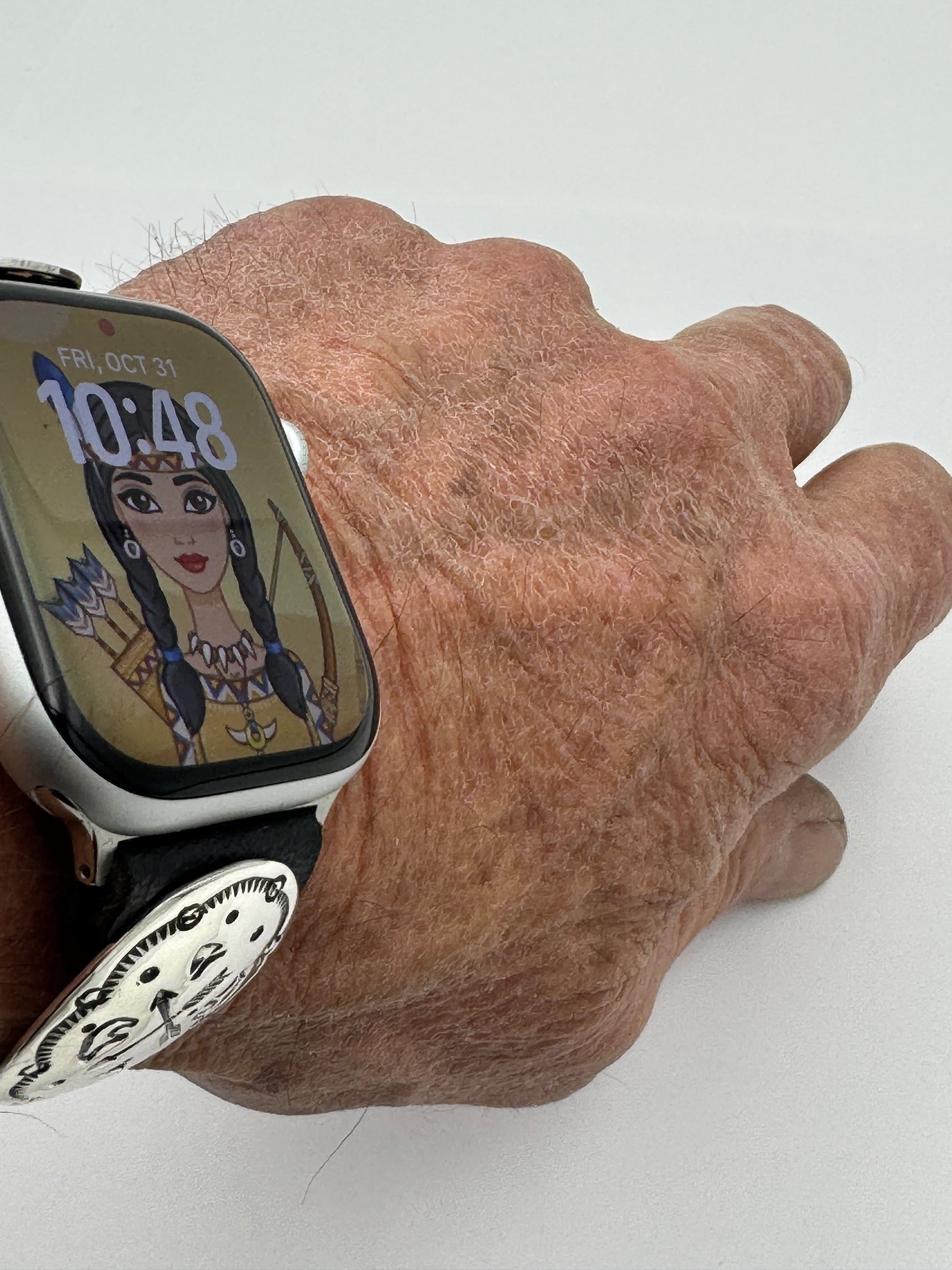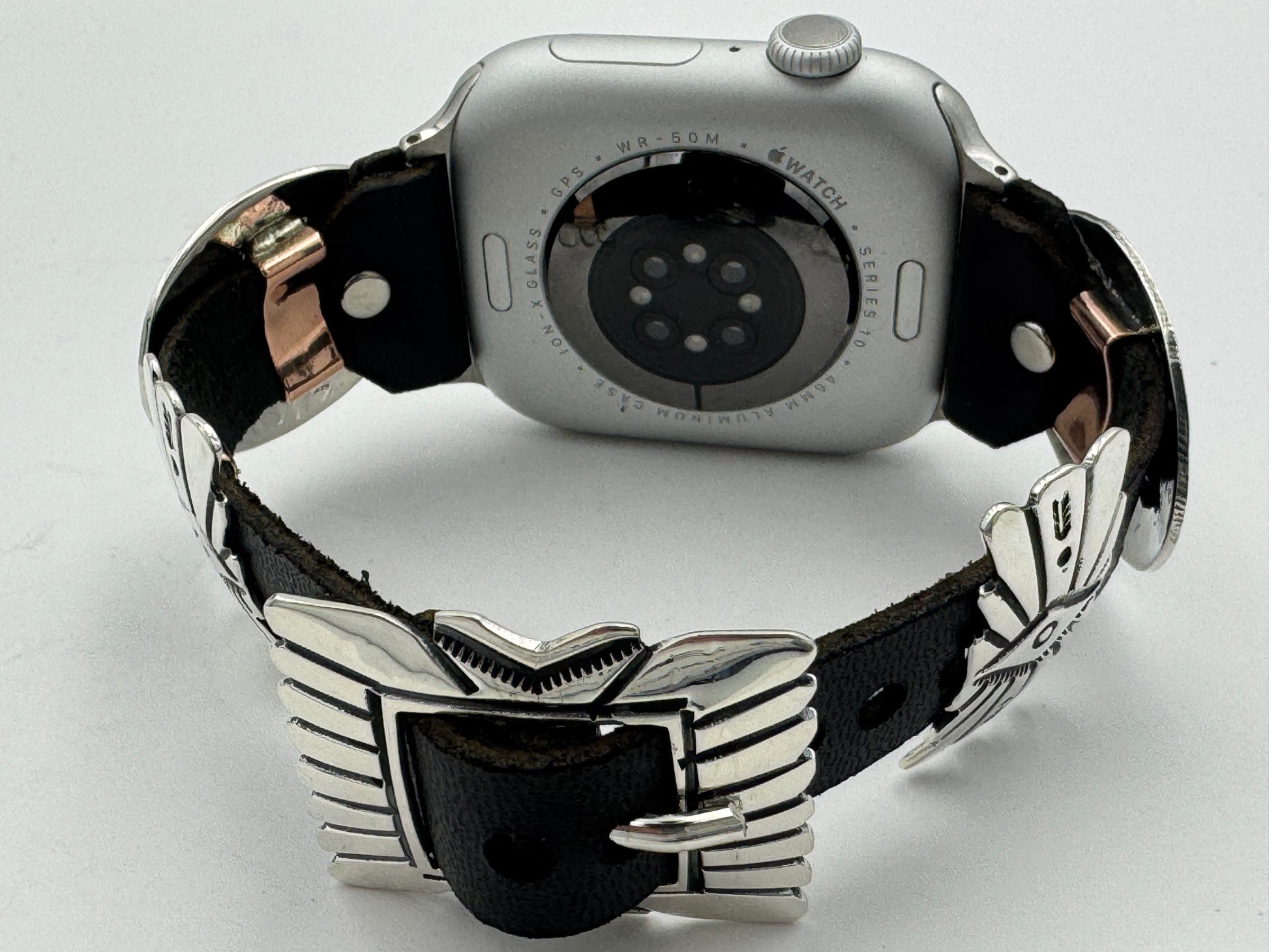 The Conchos, Butterflies and Buckle are held firmly in place with our latest adjustable Riveted black colored Leather S/M-6 band v2.0. The Leather Band comes with 42/44/45/46mm Apple Watch adaptors and can be sized to fit a small to large sized wrist. By changing the leather, we can make this band fit virtually any wrist nicely. Be sure and leave valid contact information so we can contact you to assure a nice fit. The iBand will seamlessly integrate with the Apple Watch 42mm Series 1 thru 46mm Series 10. Slip your Apple WATCH onto the band, buckle up and slide the Conchos and Butterflies around to get a perfect arrangement and comfortable fit for your wrist. We can convert this to a 38/40/41/42mm if you have the smaller Watch. Different colors of leather are available upon request.