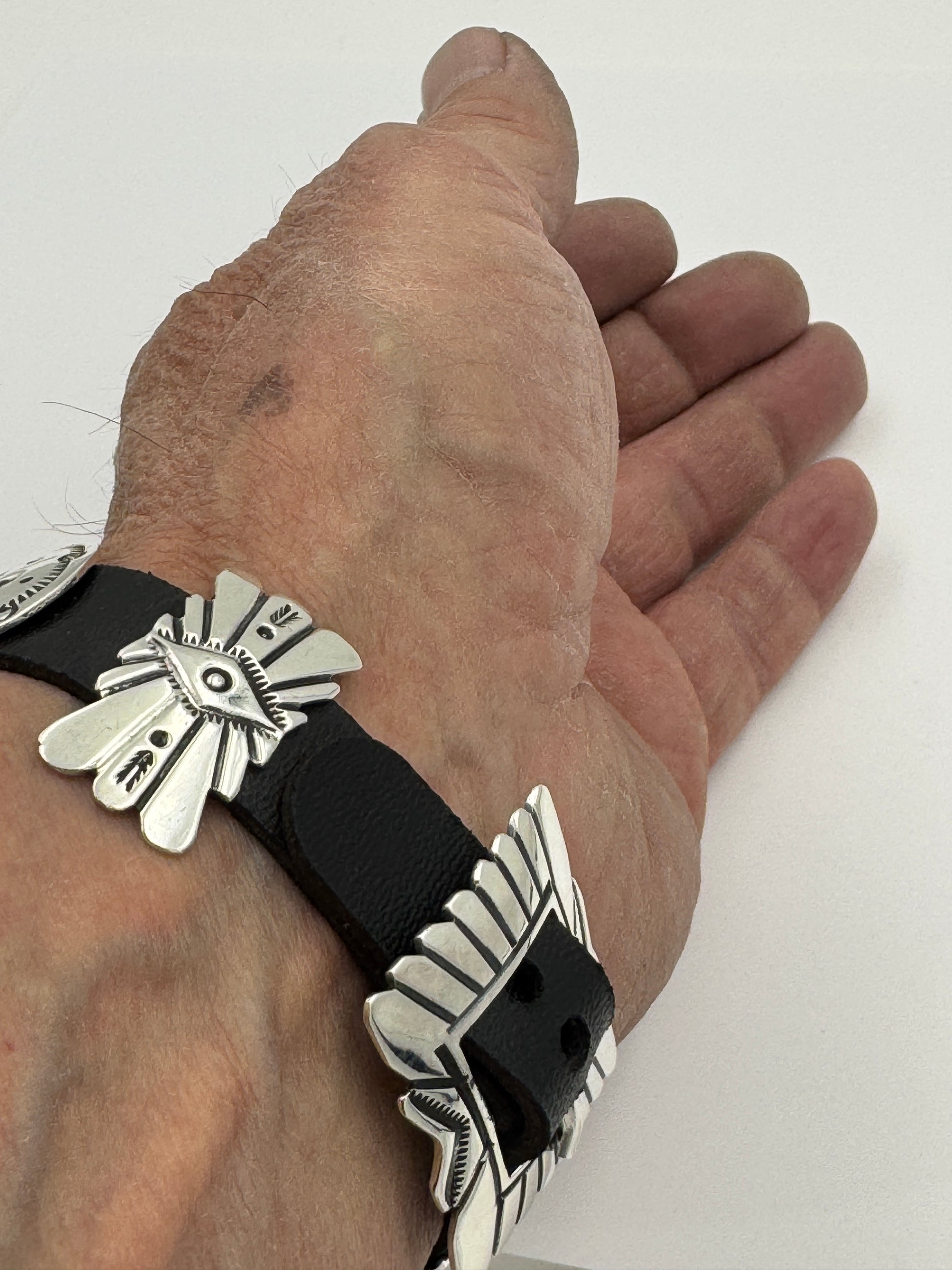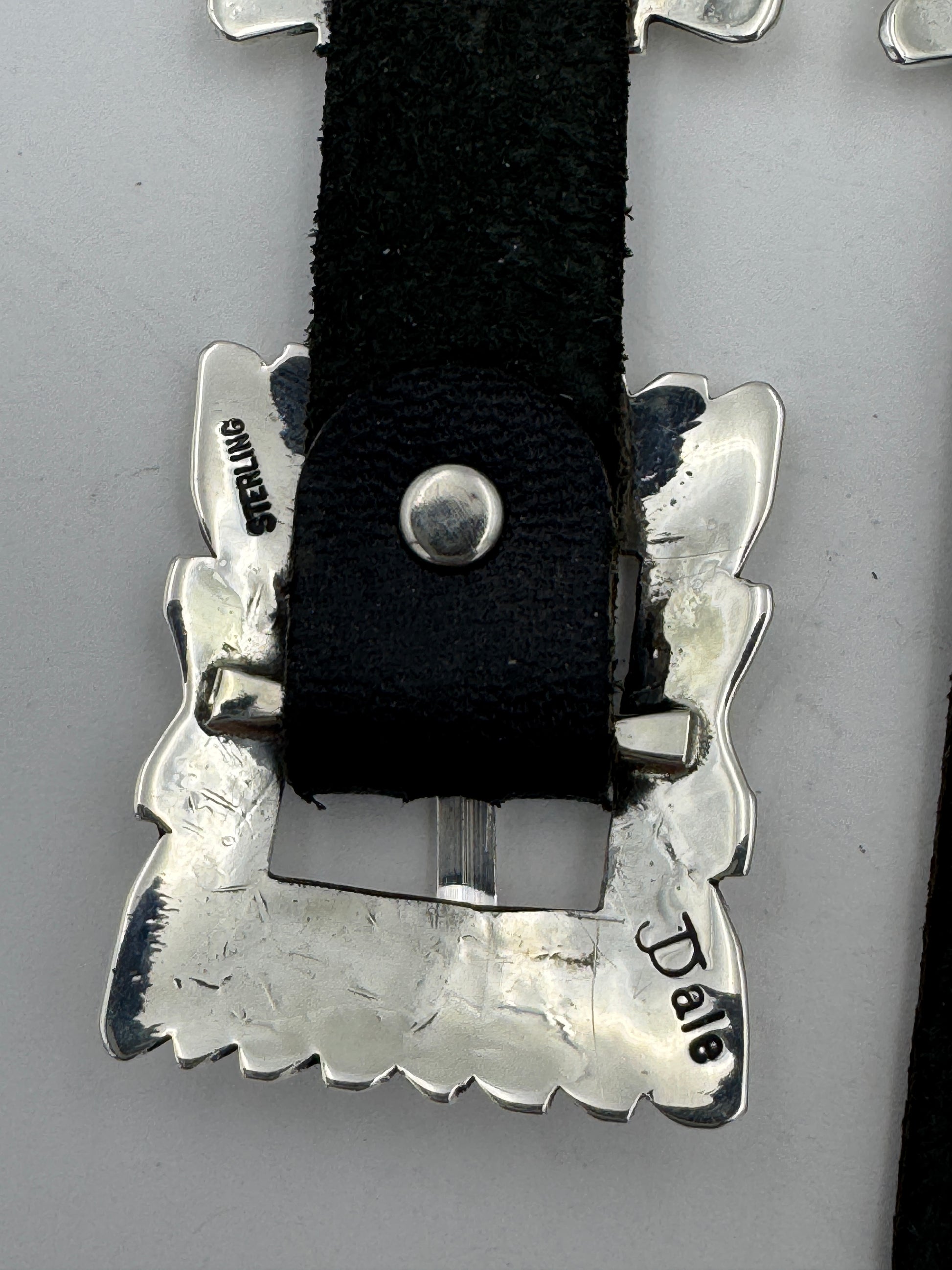 The Silverwork, which is done by Navajo Silversmith Jeanette Dale from Tocito, New Mexico, includes two oval silver Conchos, two silver butterflies and a buckle on a leather band. The Buckle has the Jeanette "Dale" authentication artist Stamp and a Sterling mark. The Conchos and butterflies are hand stamped with a traditional symbols design.