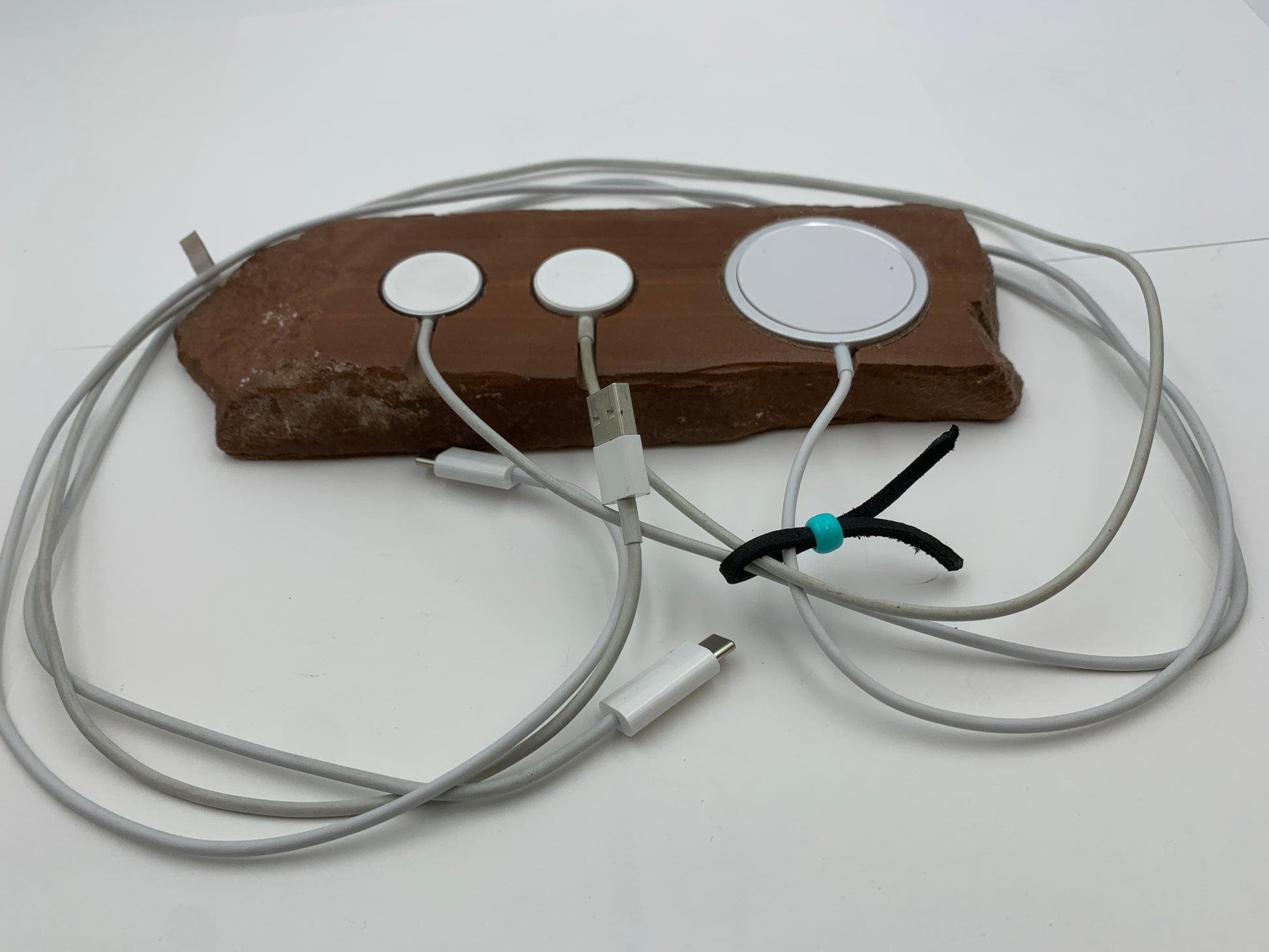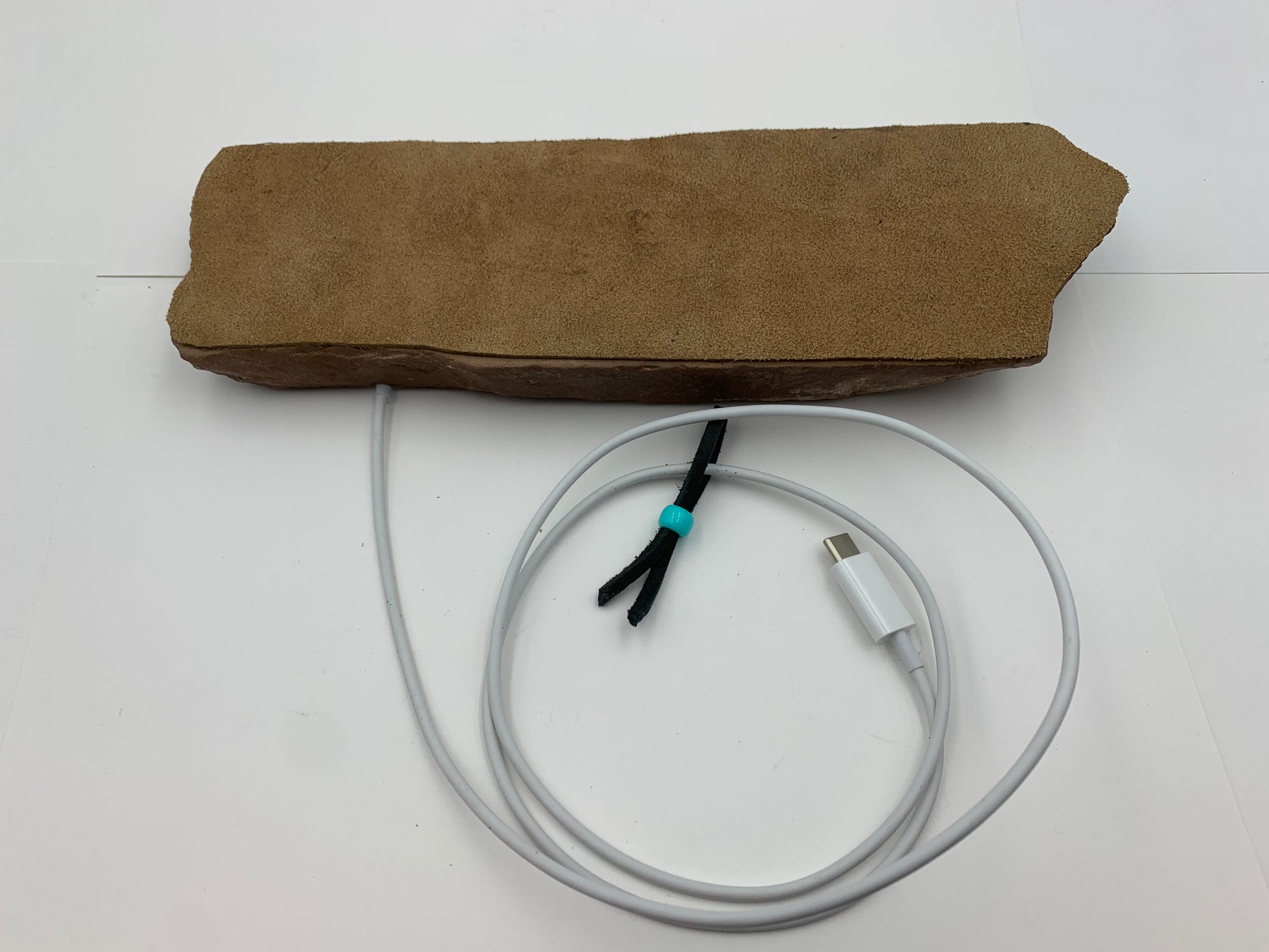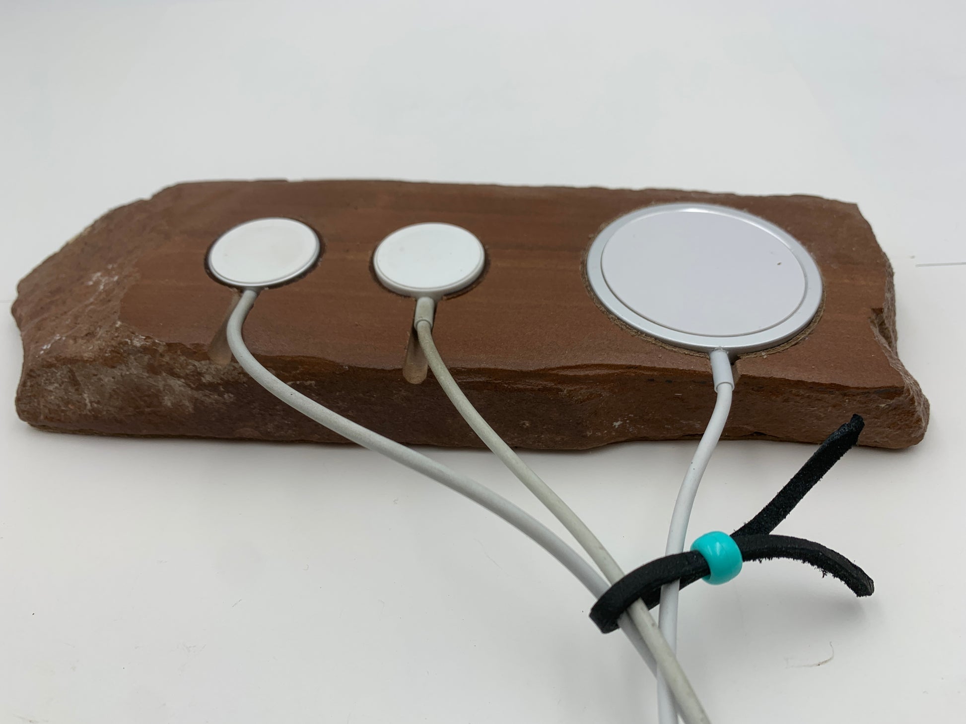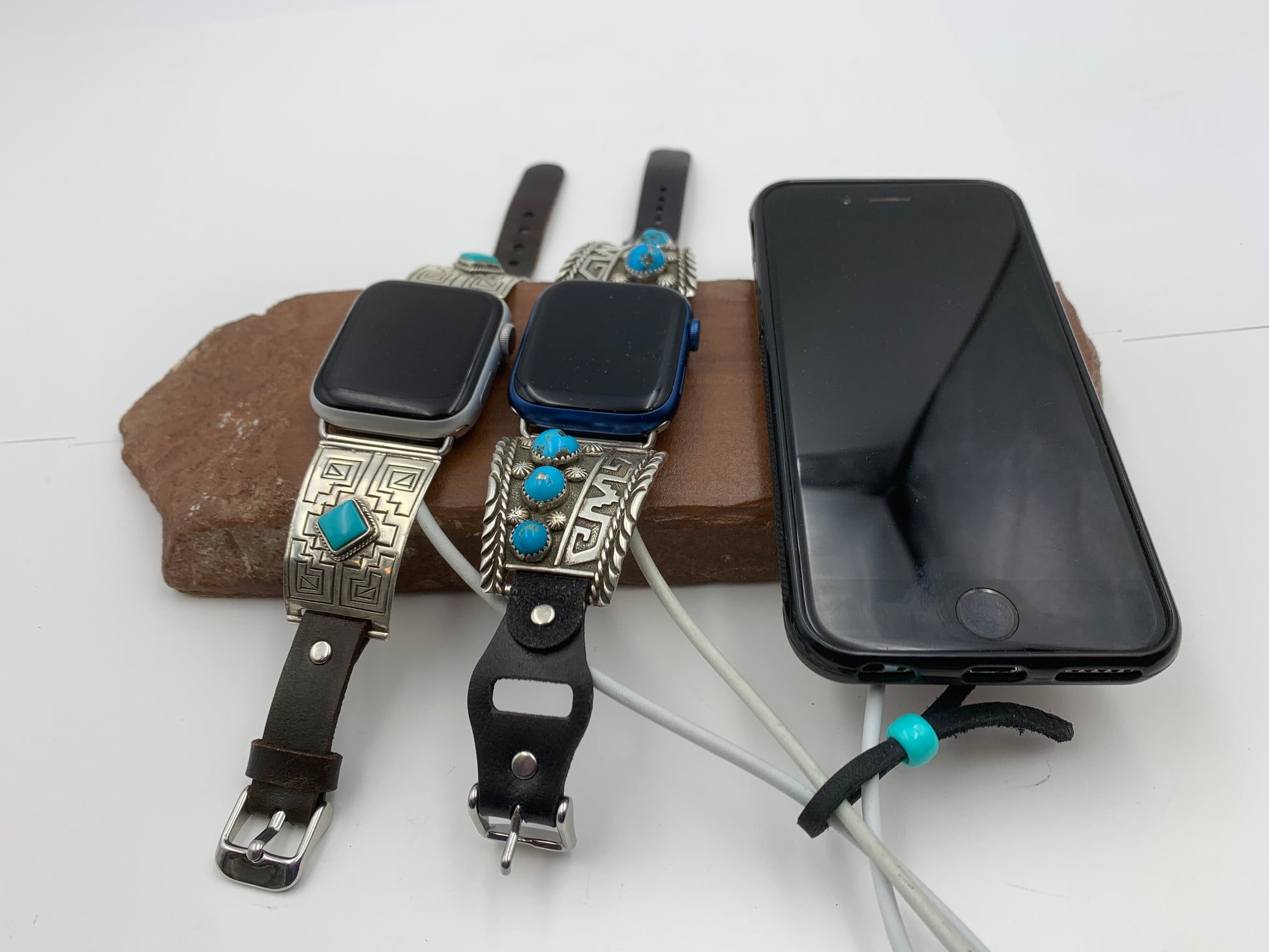 This Apple WATCH Charging Stone is handcrafted by Jordan Toledo of the Navajo Nation. The Stone is a one-piece carving made of alabaster and has a 2 apple Watch Charging Adapter holes and a wireless iPhone charger included. The Charging Adapter holes have a leather surrounding that will firmly hold an Apple Lighting Cable while your Apple WATCH safely charges. There is a round laser cut piece of leather on the inside bottom of the charging holes with a native American design. There is also a wireless 10w Apple iPhone charger which is included. Light brown suede leather is attached along the bottom to prevent scratching surfaces. A piece of leather with a bead is included to help manage the wires. Just pull the bead along the leather to loosen and tighten around the cables. The charging Stone will work with most 38/40/41mm, 42/44/45mm and the new 49mm Ultra Apple WATCH bands. Wireless charger compatible with most wireless charging iPhones.