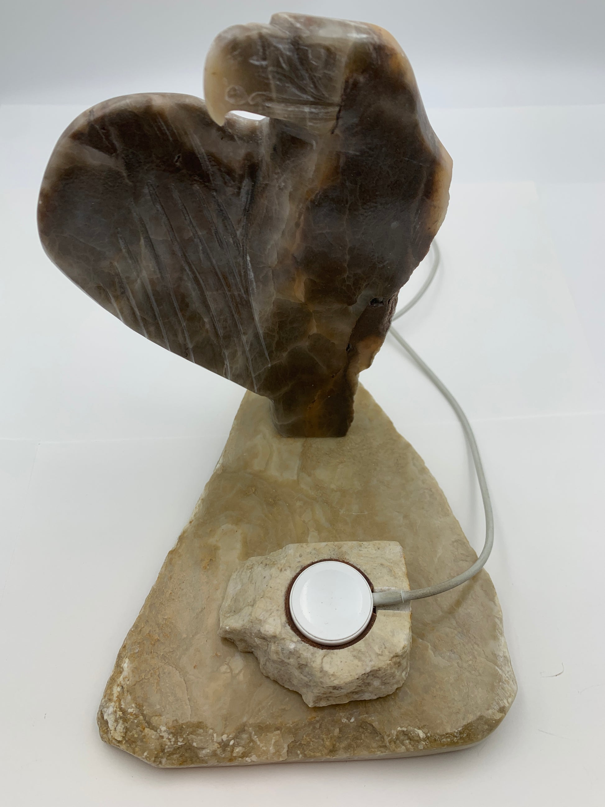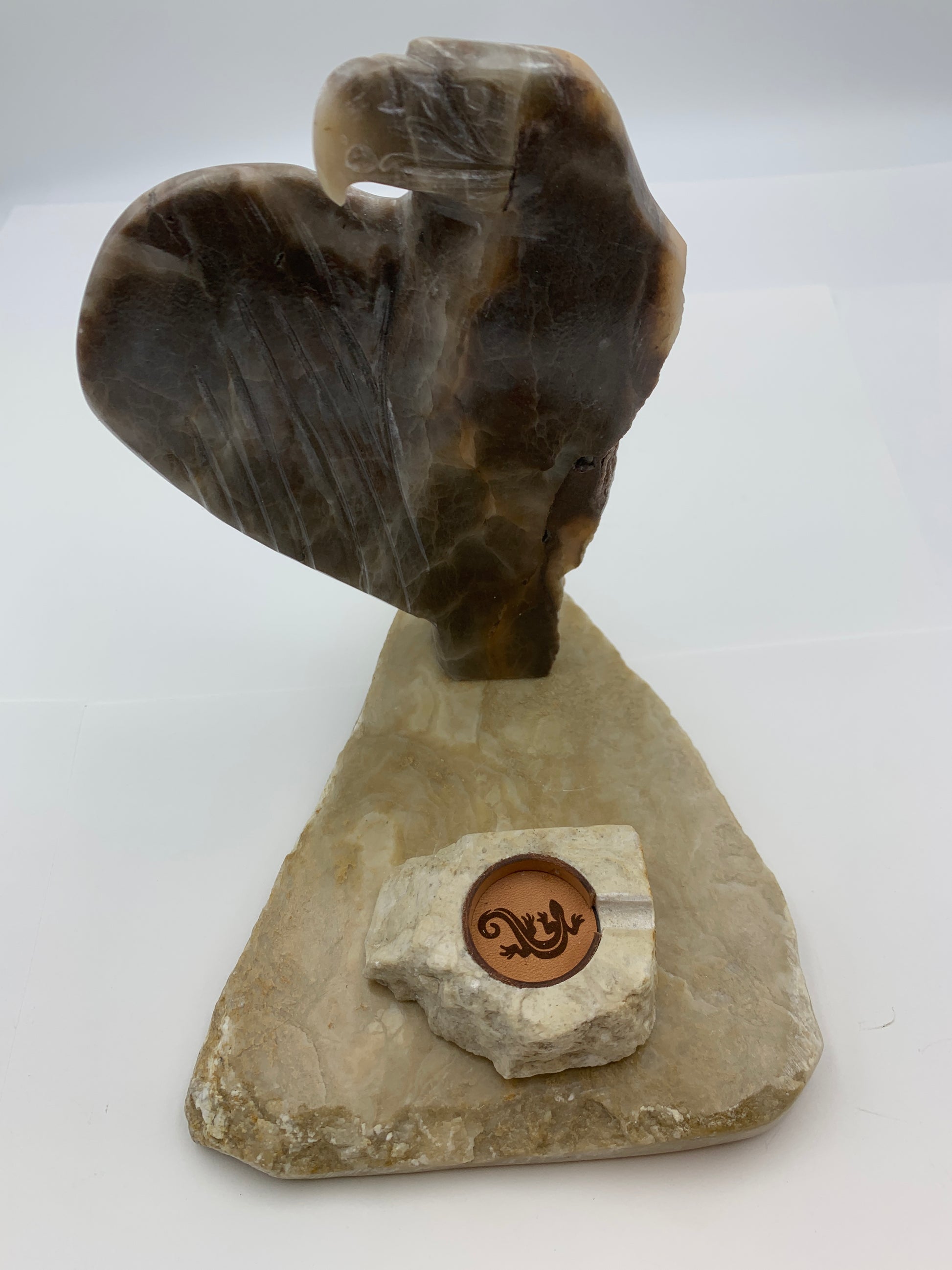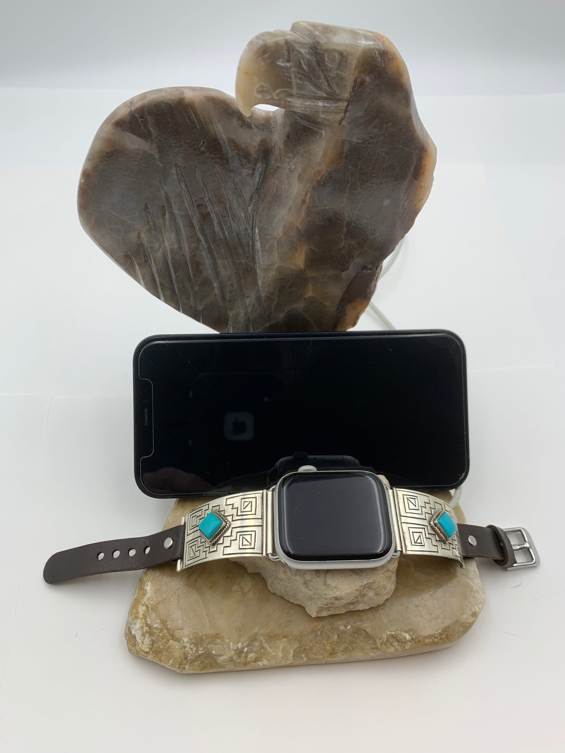 This Eagle Apple WATCH Charging Station is handcrafted by Jordan Toledo of the Navajo Nation. The stone carvings are made of alabaster and have a firm stone base with a WATCH Charging Adapter stone. The Charging Adapter stone has an inner leather surrounding that will firmly hold an Apple Lighting Cable while your Apple WATCH safely charges. There is also round laser cut leather with a Gecko symbol at the bottom of the WATCH hole. Thick suede leather is attached along the bottom to prevent scratching surfaces. The Eagle charging Station will work with most 38/40/41mm or 42/44/45mm Series 1 thru 9 and 49mm Ultra Apple WATCH bands. And will also hold an Apple iPhone for charging or viewing.