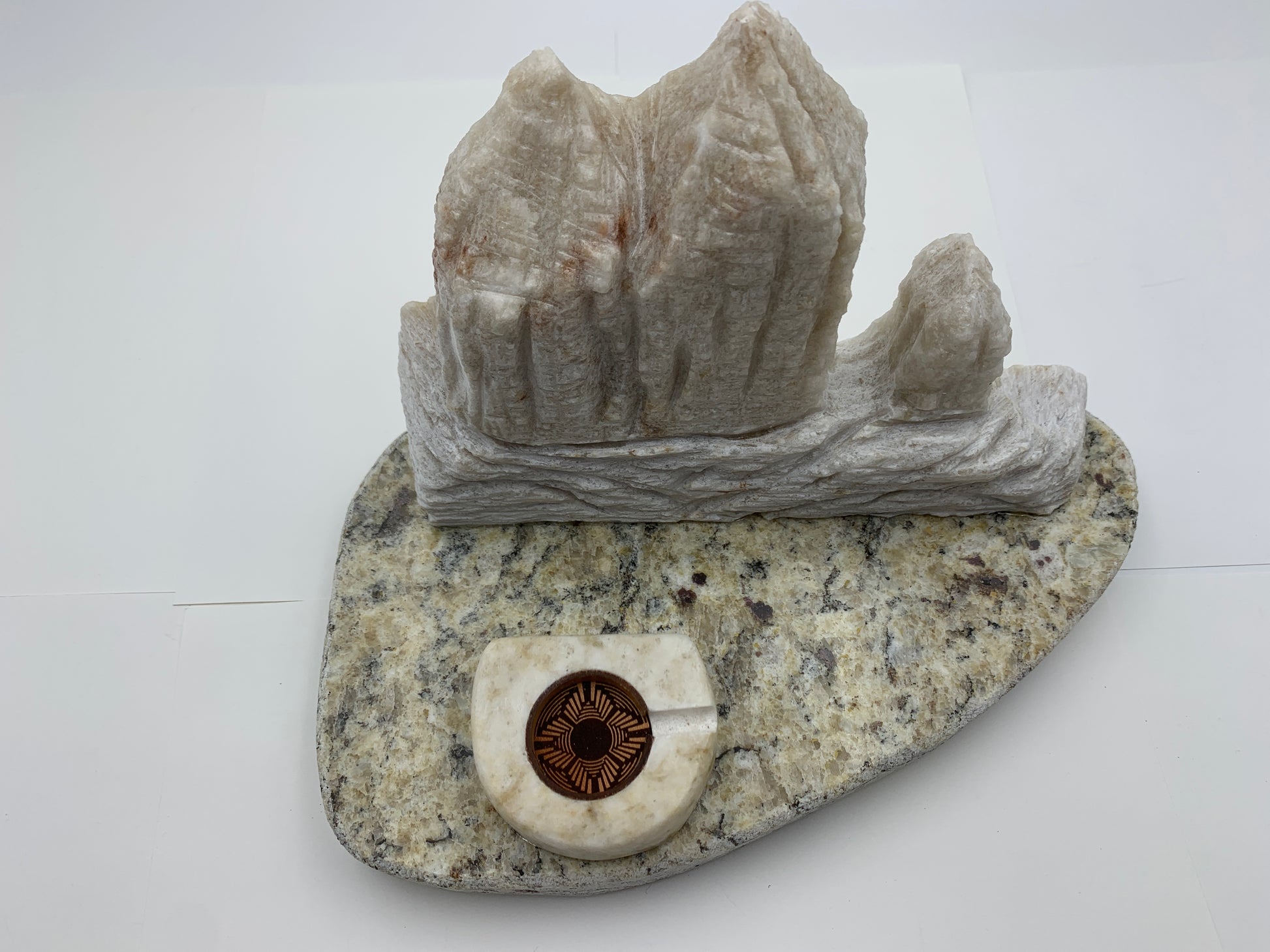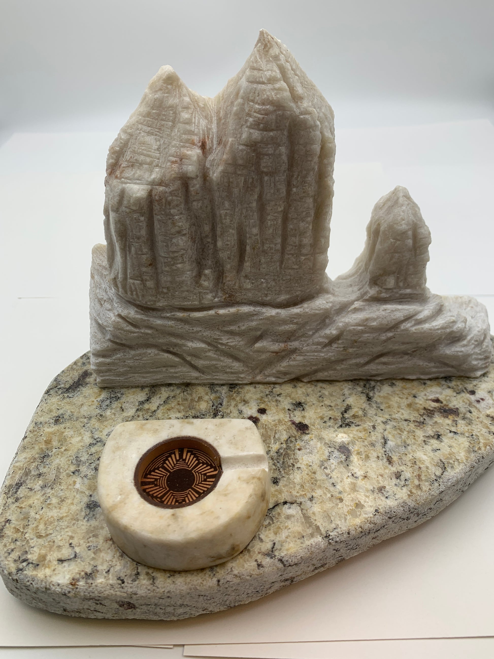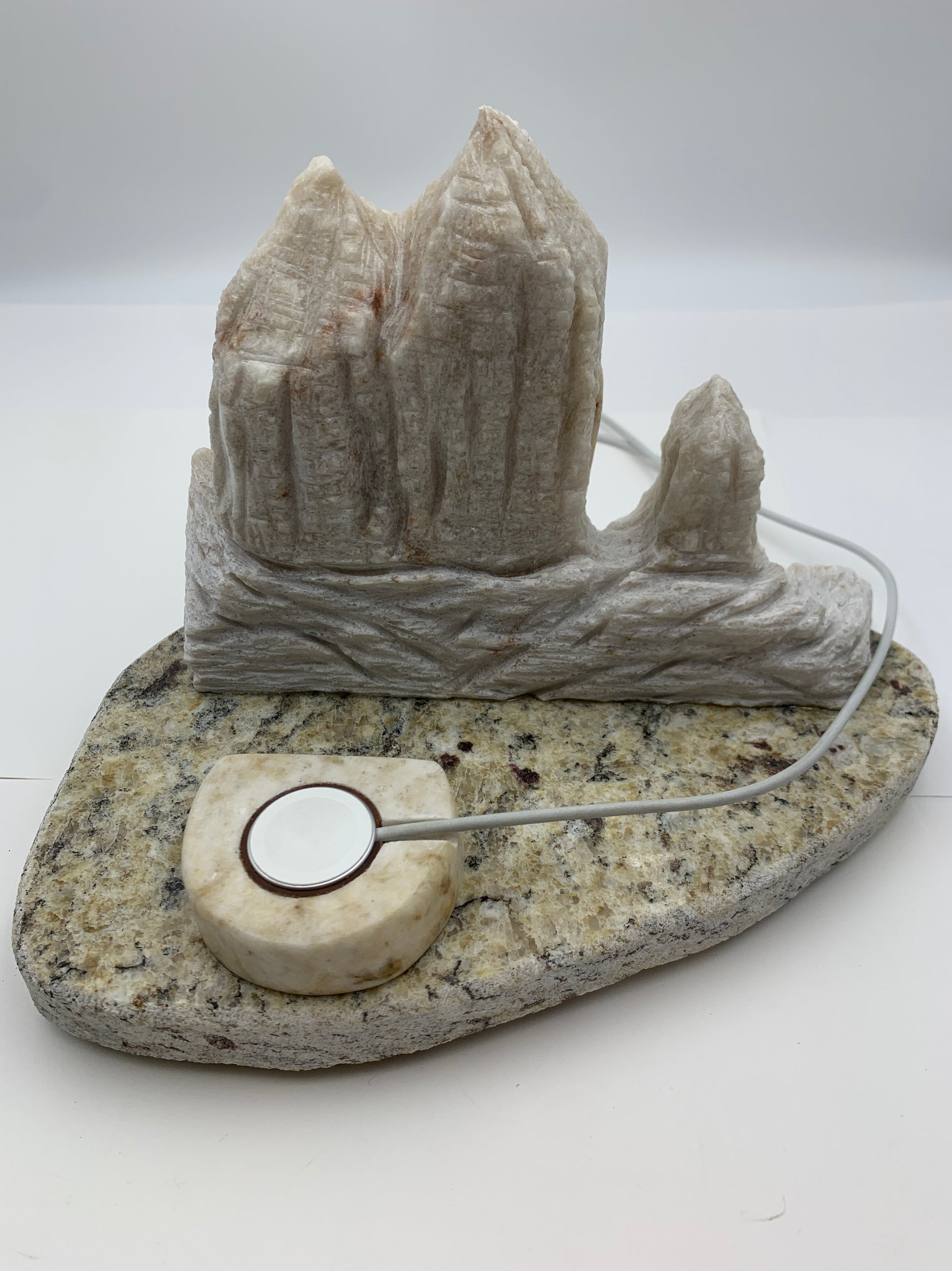 This Shiprock Apple WATCH Charging Station is handcrafted by Jordan Toledo of the Navajo Nation. The stone carvings are made of alabaster and have a firm stone base with a Charging Adapter stone. The Charging Adapter stone has an inner leather surrounding that will firmly hold an Apple Lighting Cable while your Apple WATCH safely charges. There is laser cut round leather with a Native American design at the bottom of the WATCH hole. Circular non-scratch felt pads are attached along the bottom. The Shiprock charging Station will work with most 38/40/41mm or 42/44/45mm Series 1 thru 9 and 49mm Ultra Apple WATCH bands and will also hold an Apple iPhone for charging or viewing.