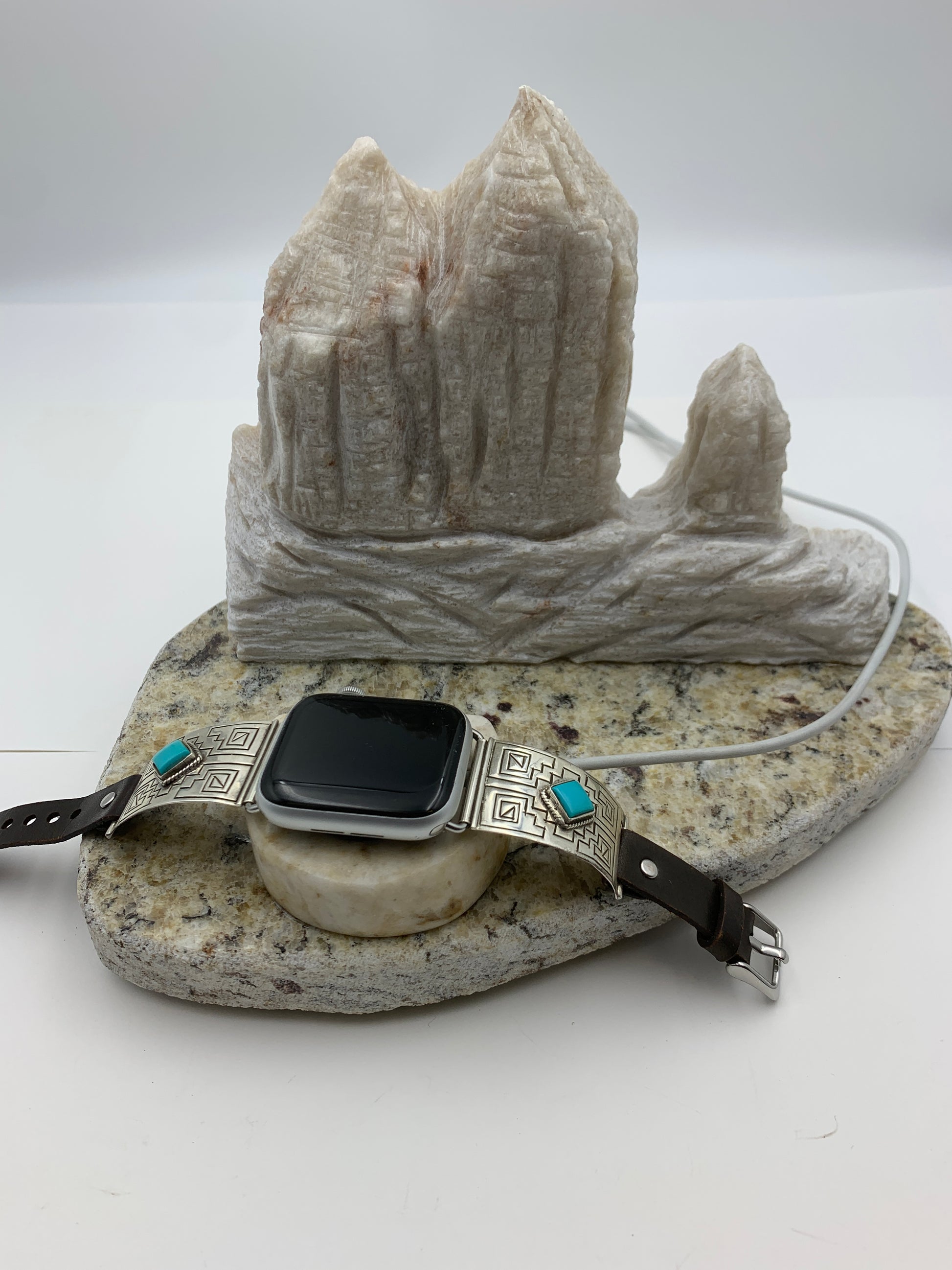 This purchase includes a Native American Shiprock Apple WATCH Charging Station as shown. Apple WATCH, Bilasaana Turquoise and Silver iBand nor Apple Lightning Charging Cables included in this purchase.