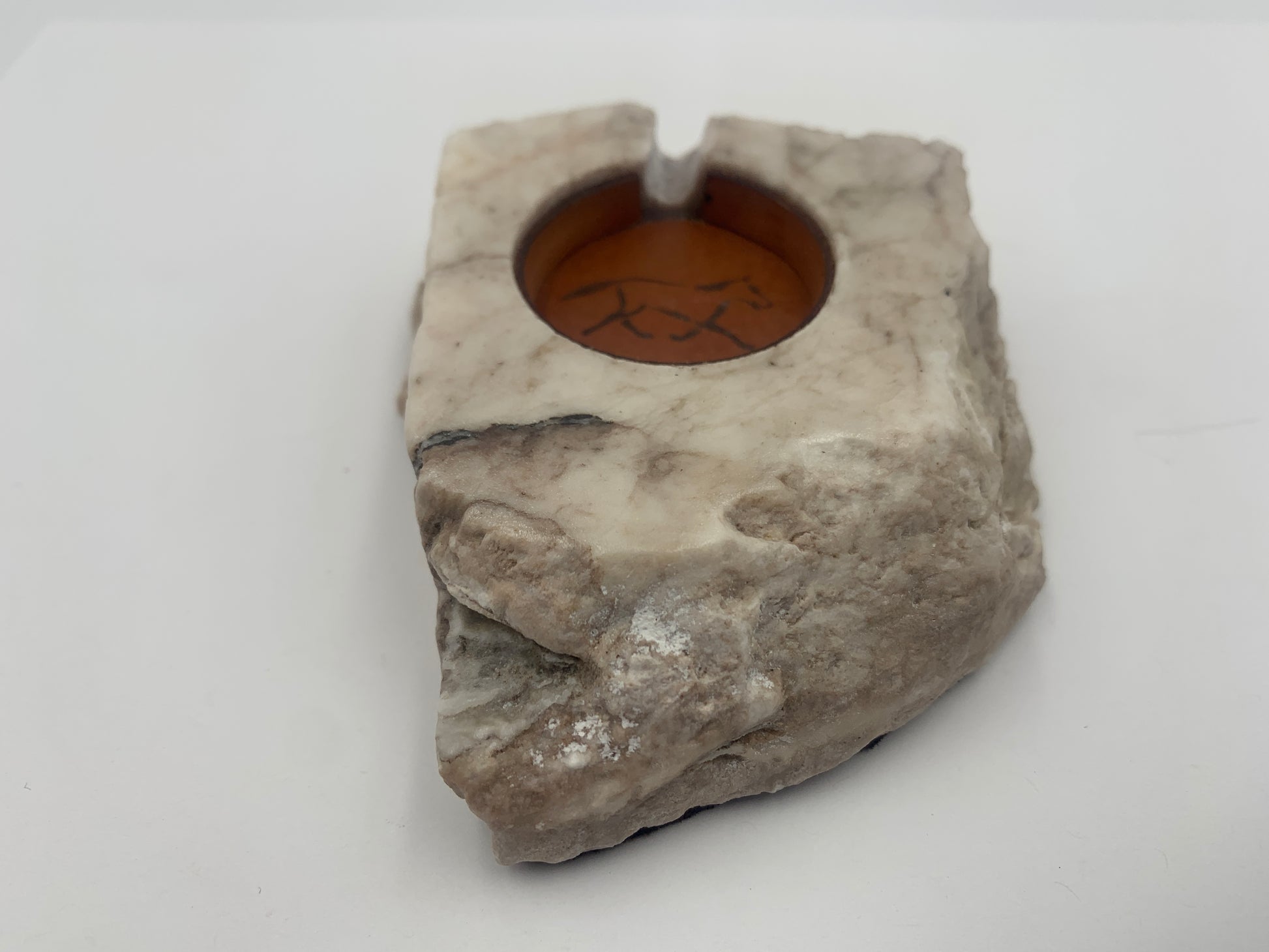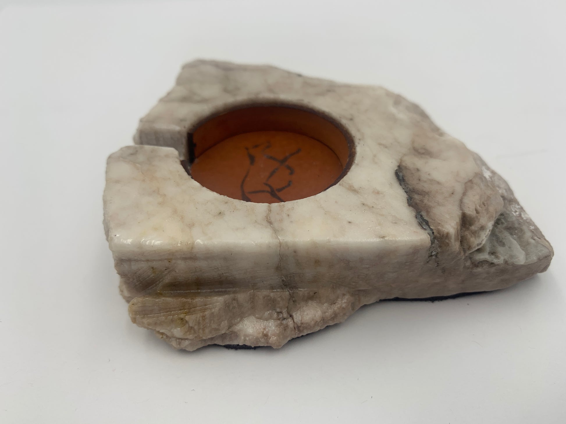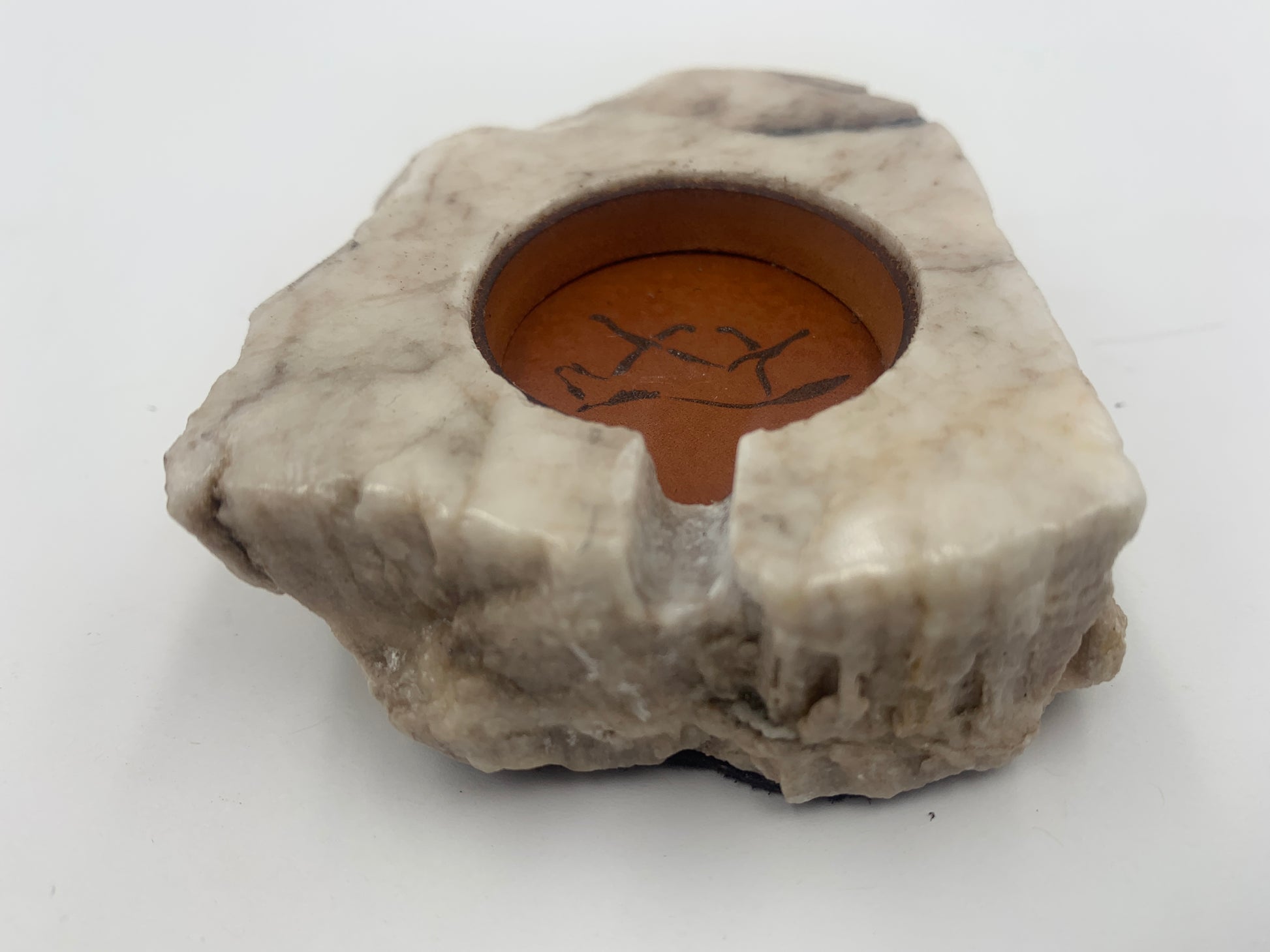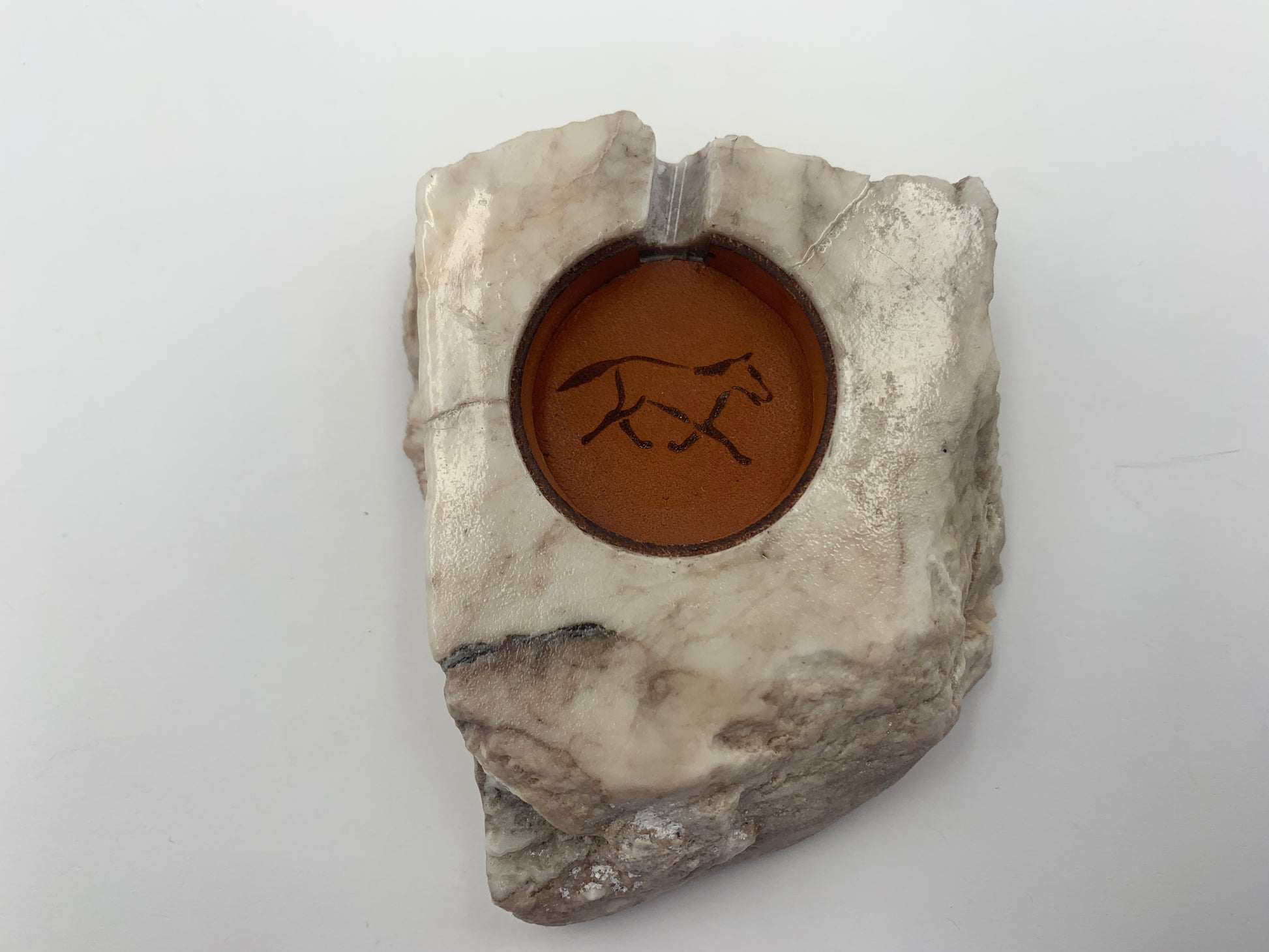 This Samsung Watch Charging Stone is handcrafted by Jordan Toledo of the Navajo Nation. The Stone is a one-piece carving made of alabaster and has a Charging Adapter hole. The Charging Adapter hole has a leather surrounding that will firmly hold a Samsung Watch charging Cable while your Samsung Watch safely charges. There is a laser cut leather charging hole cover with a running horse image. Dark brown suede leather is attached along the bottom to prevent scratching surfaces. The charging Stone will work with most 41mm or 45mm Samsung watches.