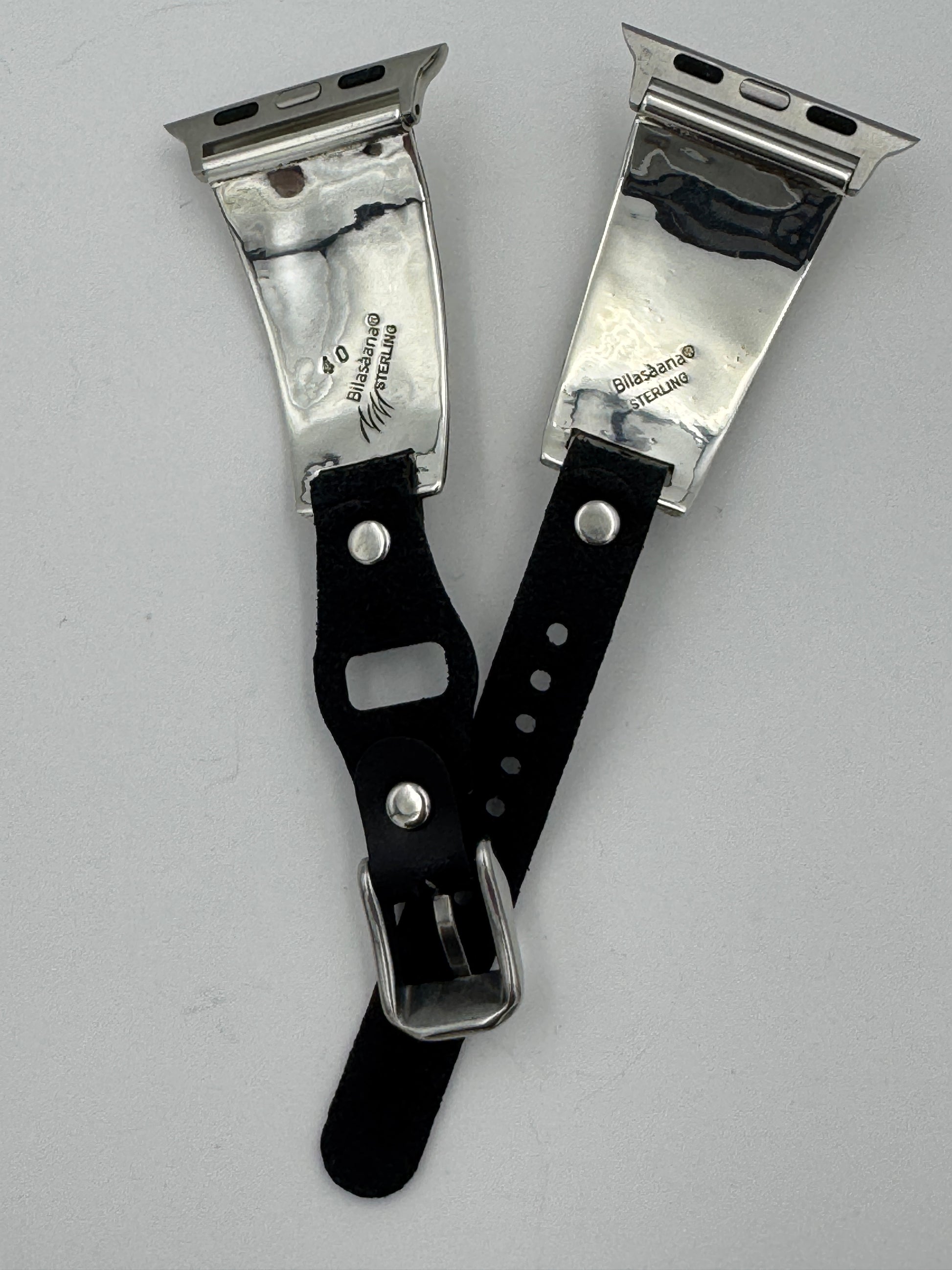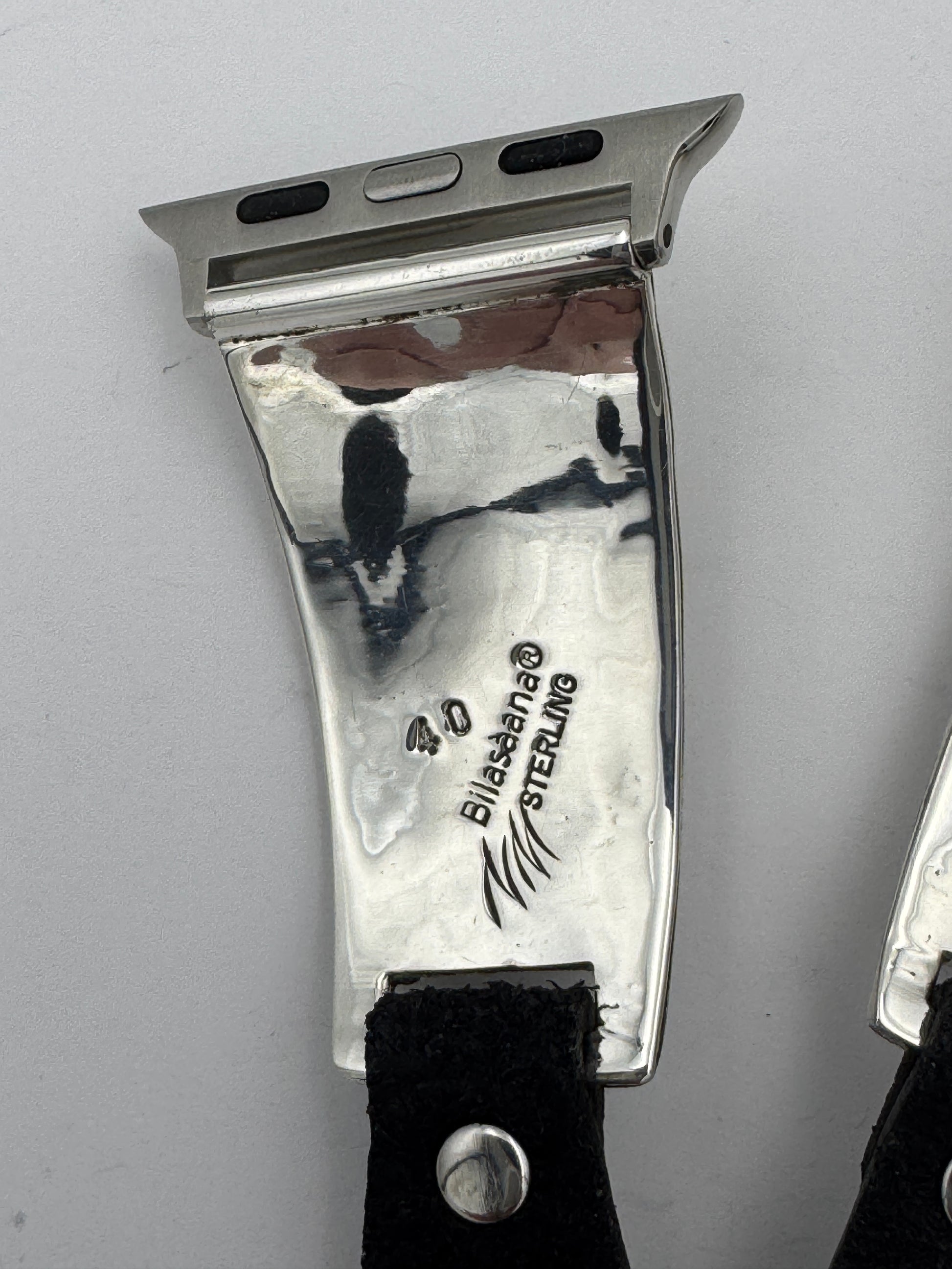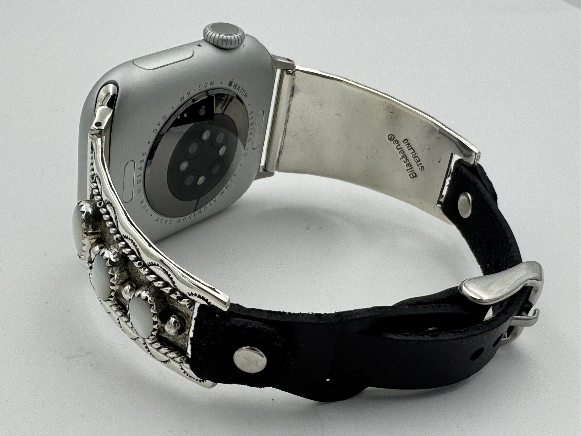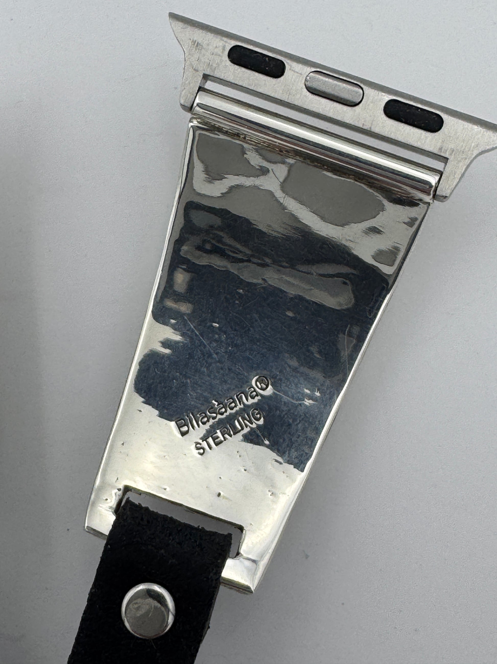 This is Nelson Morgan's 40th Bilasáana piece offered. The iBand consists of two Sterling Silver Tips with 38/40/41mm WATCH adapters and a Laser Cut Leather Band. The Sterling Silver Tips are Handcrafted by Nelson Morgan of the Navajo Nation and have an authentic Navajo Stamp, Twisted Wire and Bead Design with 3 Mother of Pearl stones on each side. On the inside of one Tip is the official Bilasáana Trademark, the serial number 40, a Sterling mark and Nelson's NM authenticity mark. The other tip has Bilasaana and Sterling marks.
