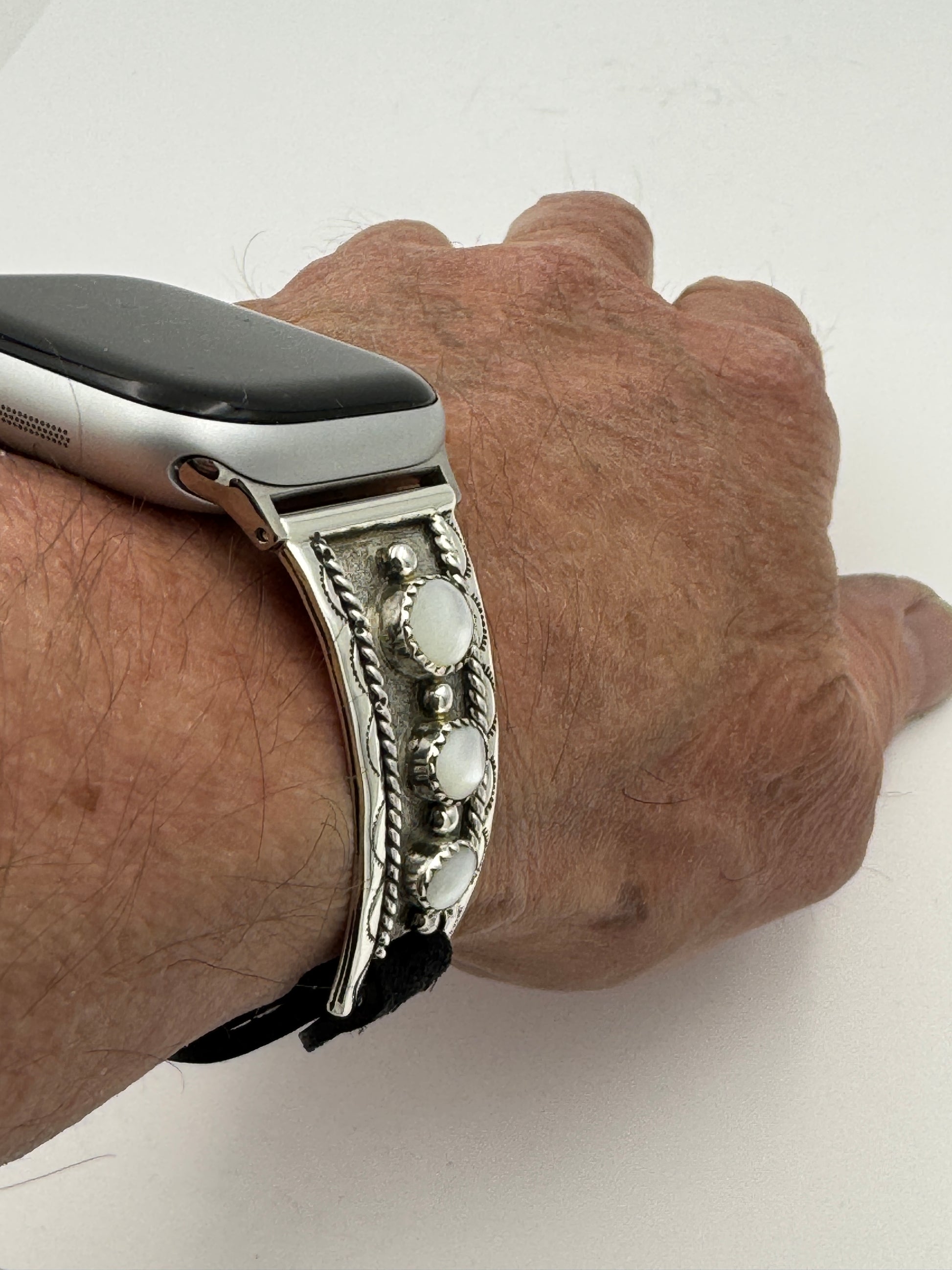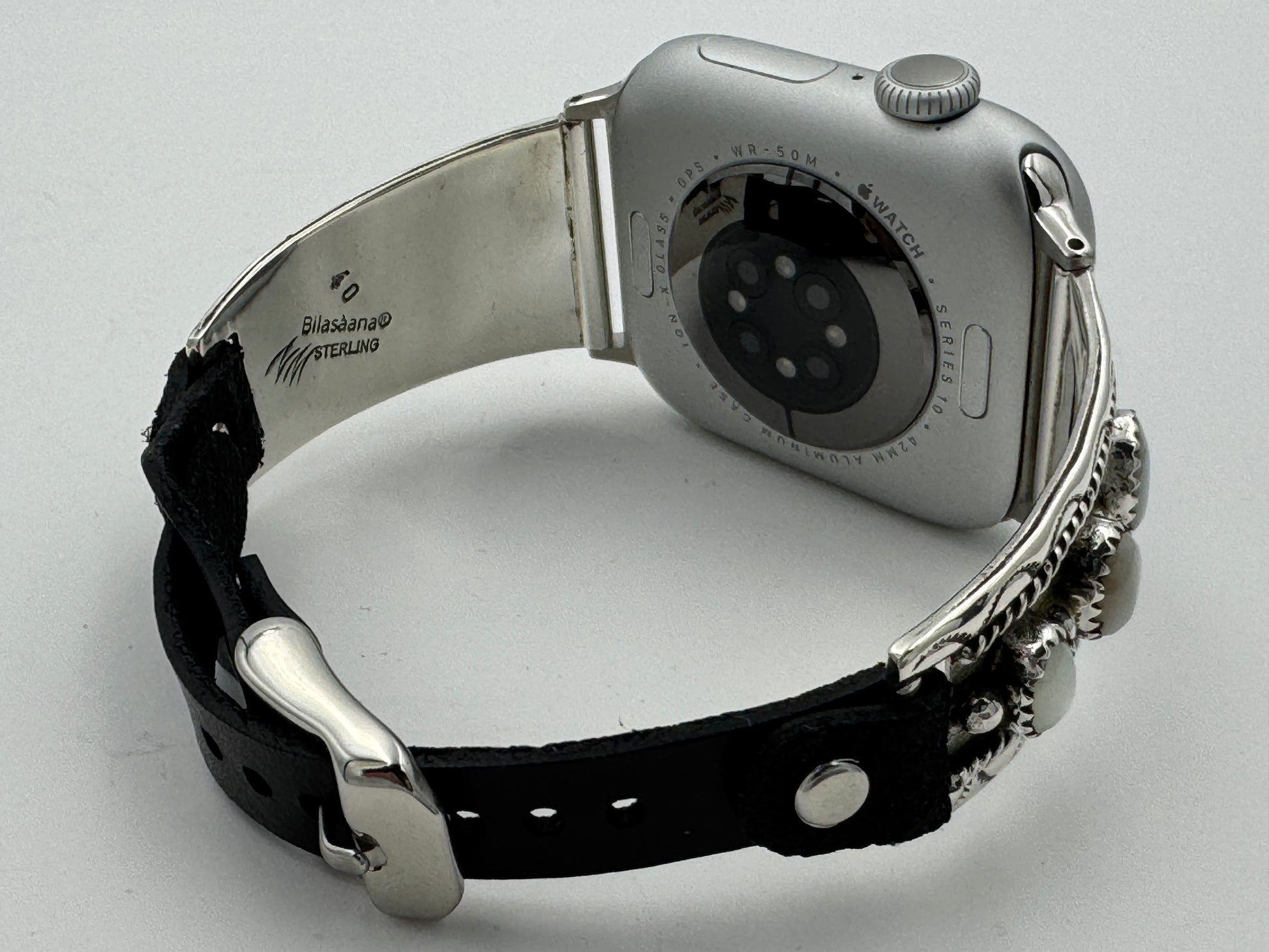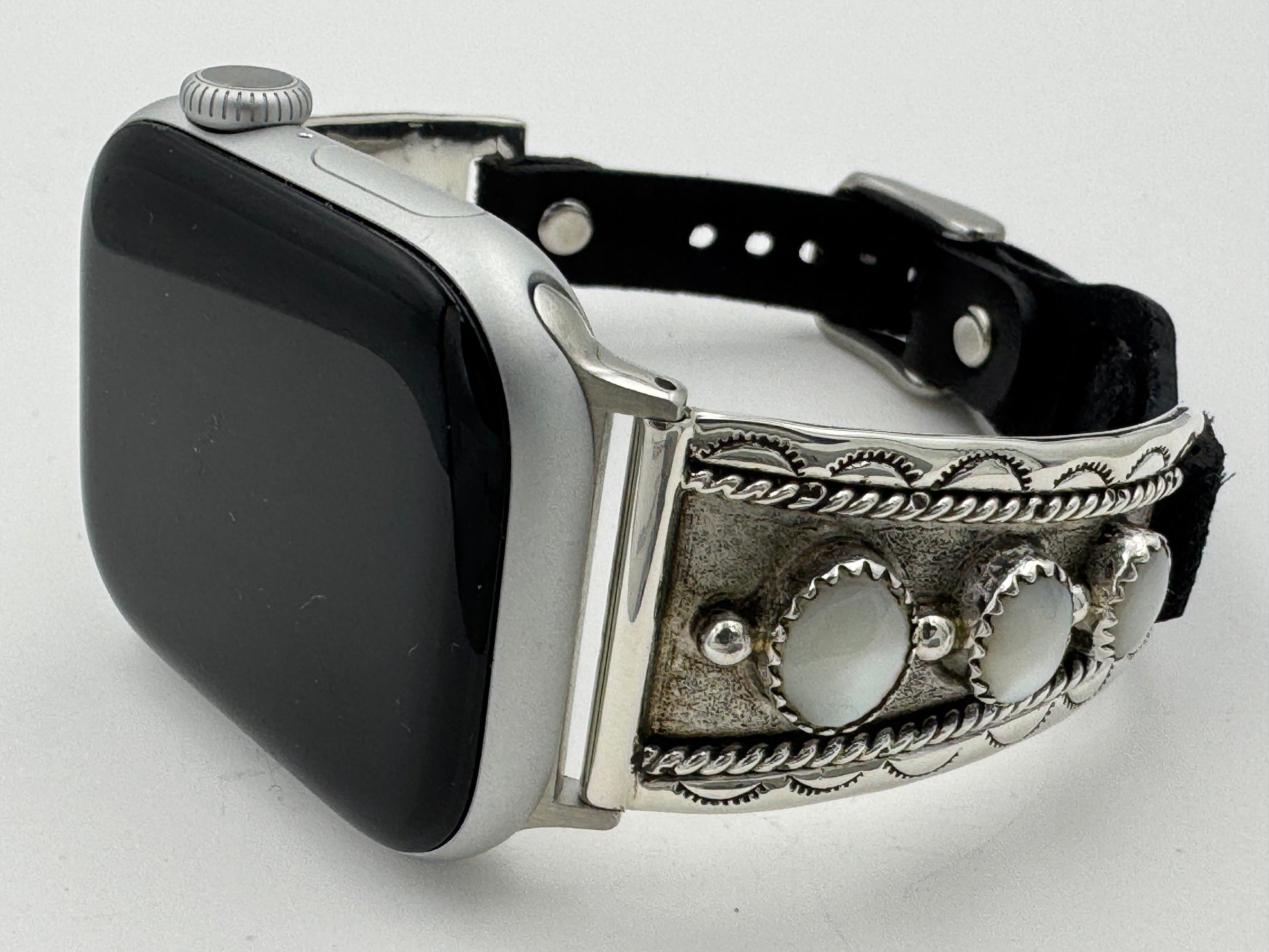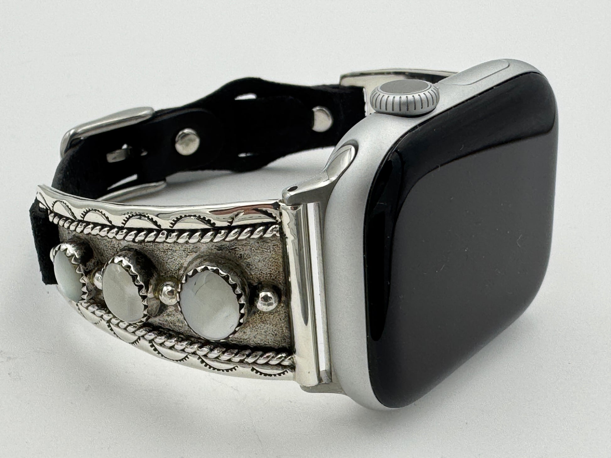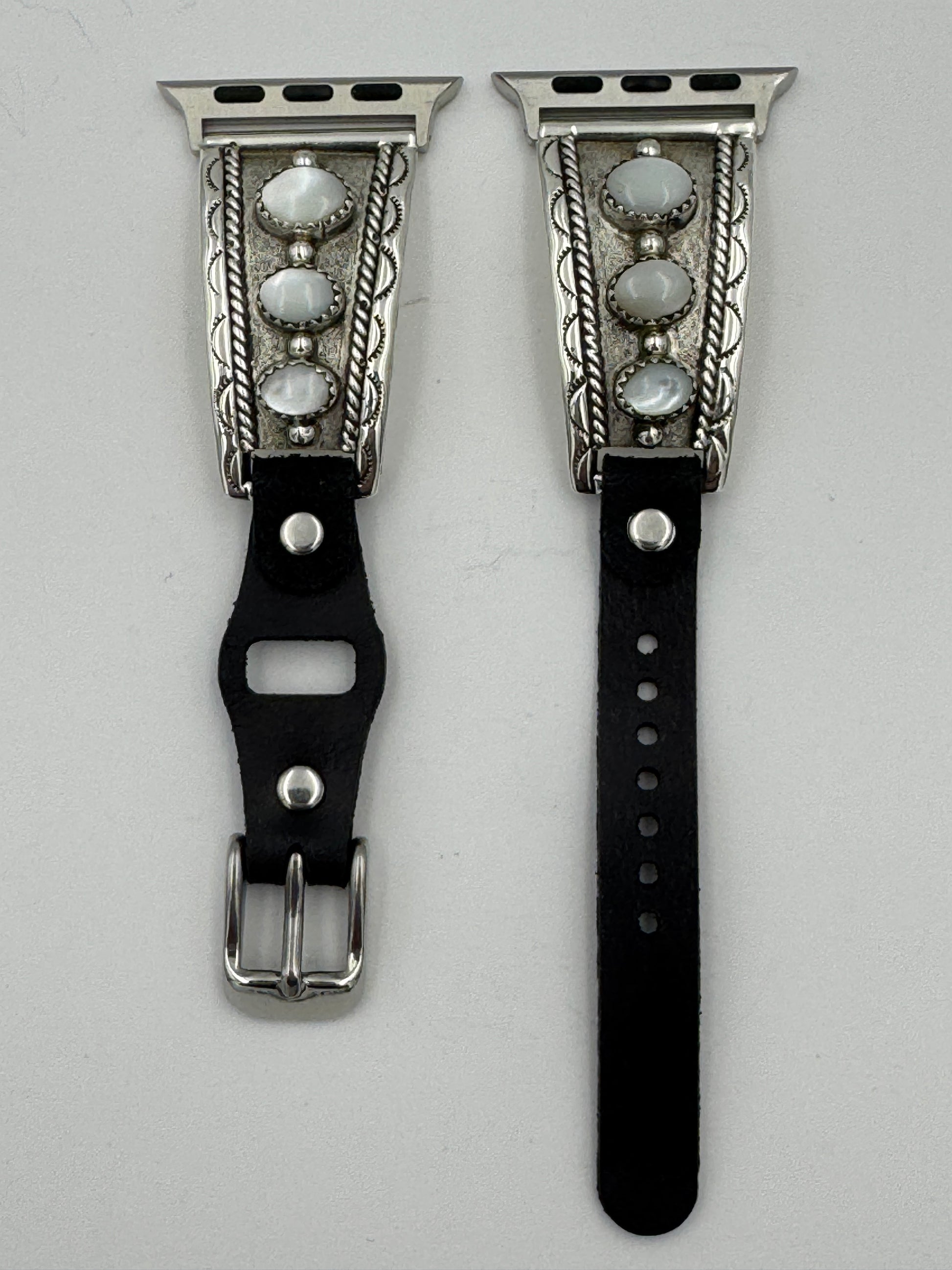 This is Nelson Morgan's 40th Bilasáana piece offered. The iBand consists of two Sterling Silver Tips with 38/40/41mm WATCH adapters and a Laser Cut Leather Band. The Sterling Silver Tips are Handcrafted by Nelson Morgan of the Navajo Nation and have an authentic Navajo Stamp, Twisted Wire and Bead Design with 3 Mother of Pearl stones on each side. On the inside of one Tip is the official Bilasáana Trademark, the serial number 40, a Sterling mark and Nelson's NM authenticity mark. The other tip has Bilasaana and Sterling marks.