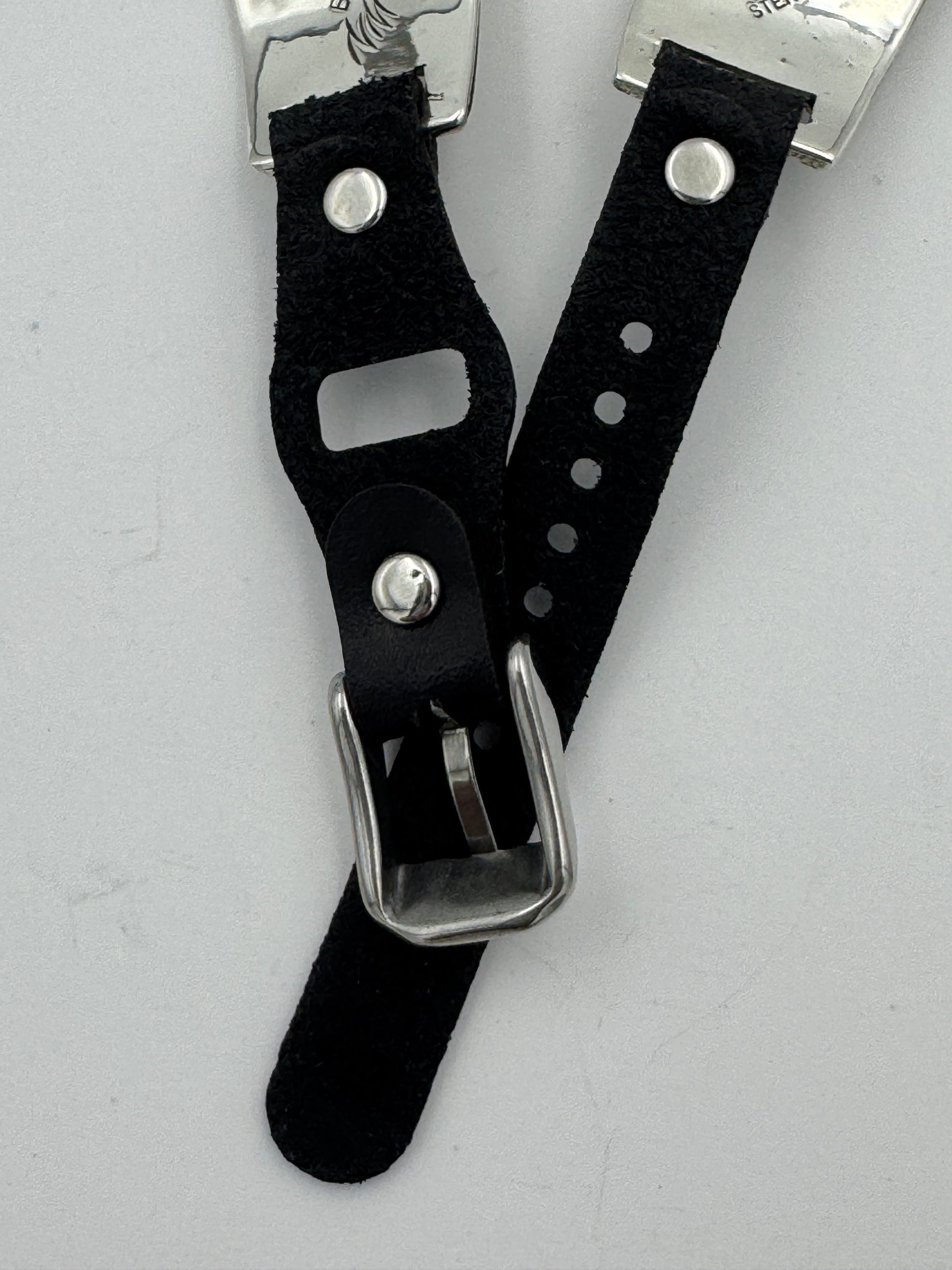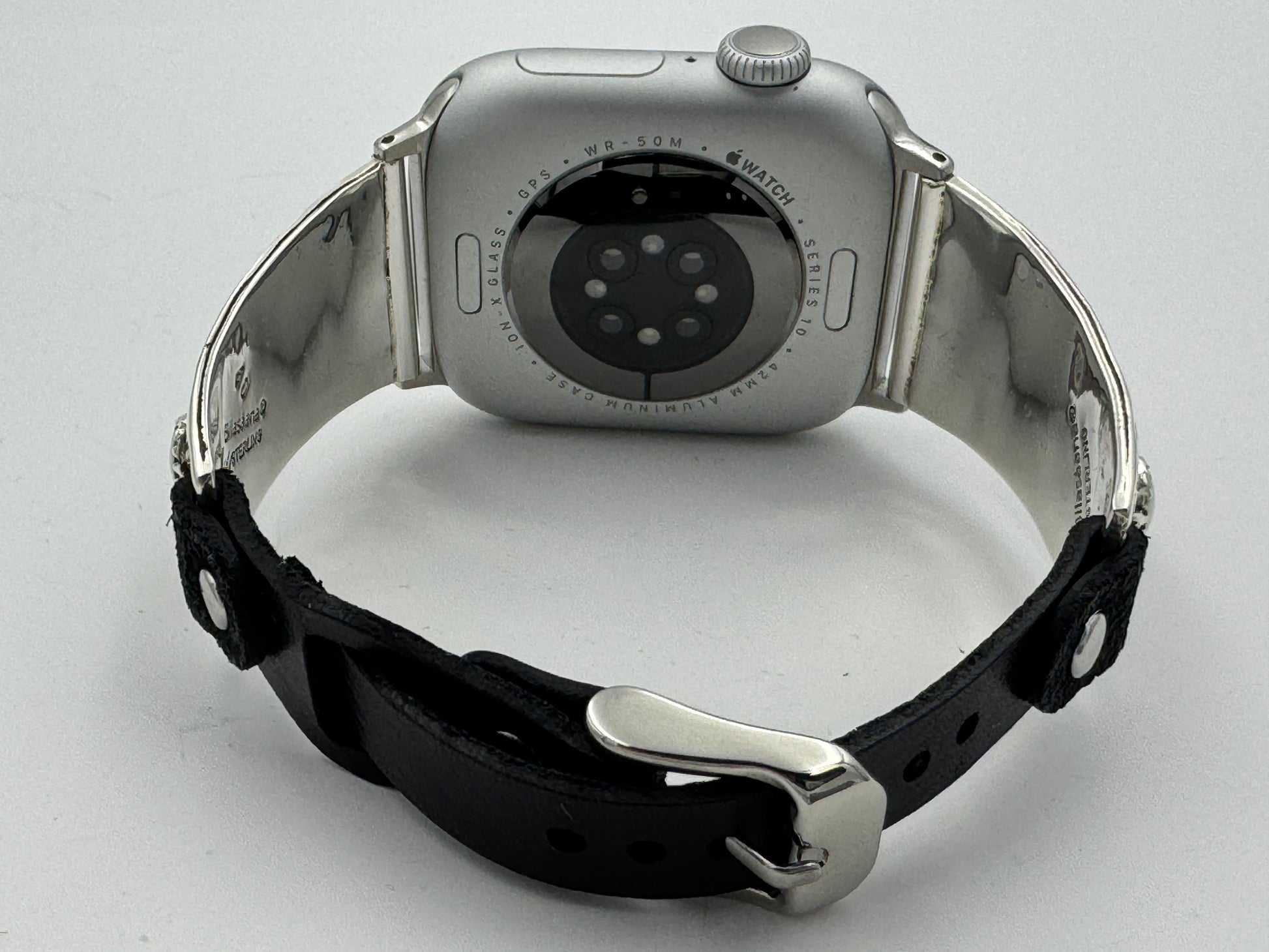The iBand comes with a choice of our new Laser Cut Riveted bands in a variety of colors and styles. We can do a button band or a buckle band in a variety of colors and sizes. This band shown has our latest ladies S/M black buckle no loop band v6.0 UB. This buckle band has smaller holes which should last longer and gives a more precise fit. This is a great piece for a small to medium size wrist. By changing the leather band we can make this band fit virtually any wrist nicely. Choose your band size at checkout and we will contact you to assure a nice fit. The iBand will seamlessly integrate with the Apple 38mm Series 1 thru Series 9 41mm or the new series 10 42mm WATCH. Don't confuse the Series 10 42mm with earlier larger 42mm Apple Watches. We can also make this band work with the bigger 42/44/45/46/49mm Apple Watches by changing the adapters. Great band for a small wrist with the big Watch.