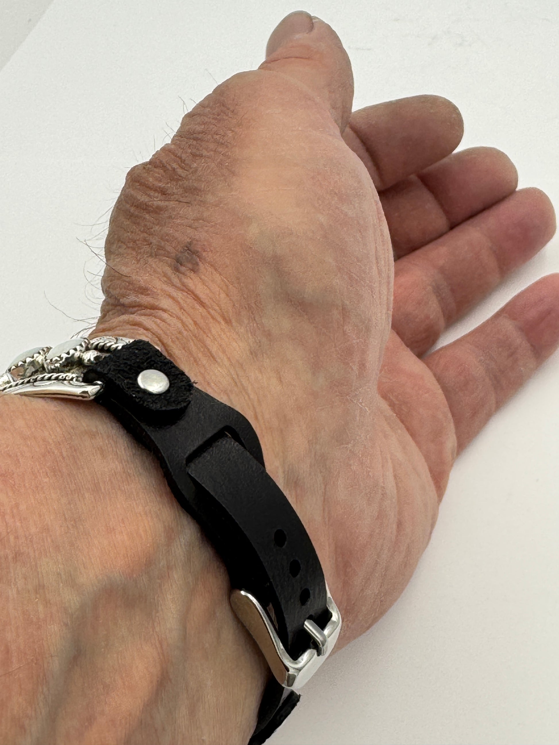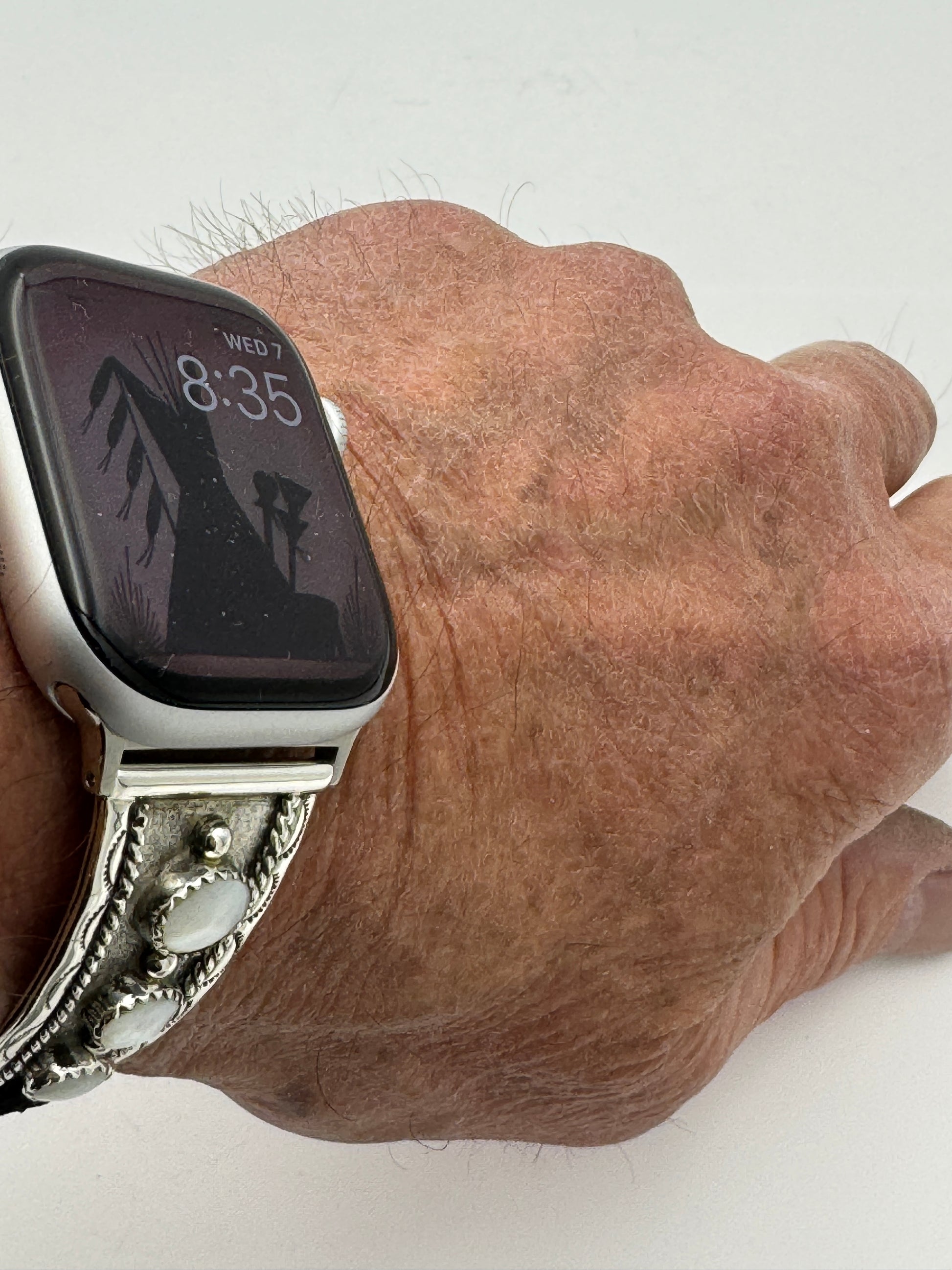 This purchase includes a Handcrafted Native American Sterling Silver Leather iBand for Apple WATCH Series 1 38mm thru Series 9 41mm. The Apple WATCH 38/40/41mm is not included.