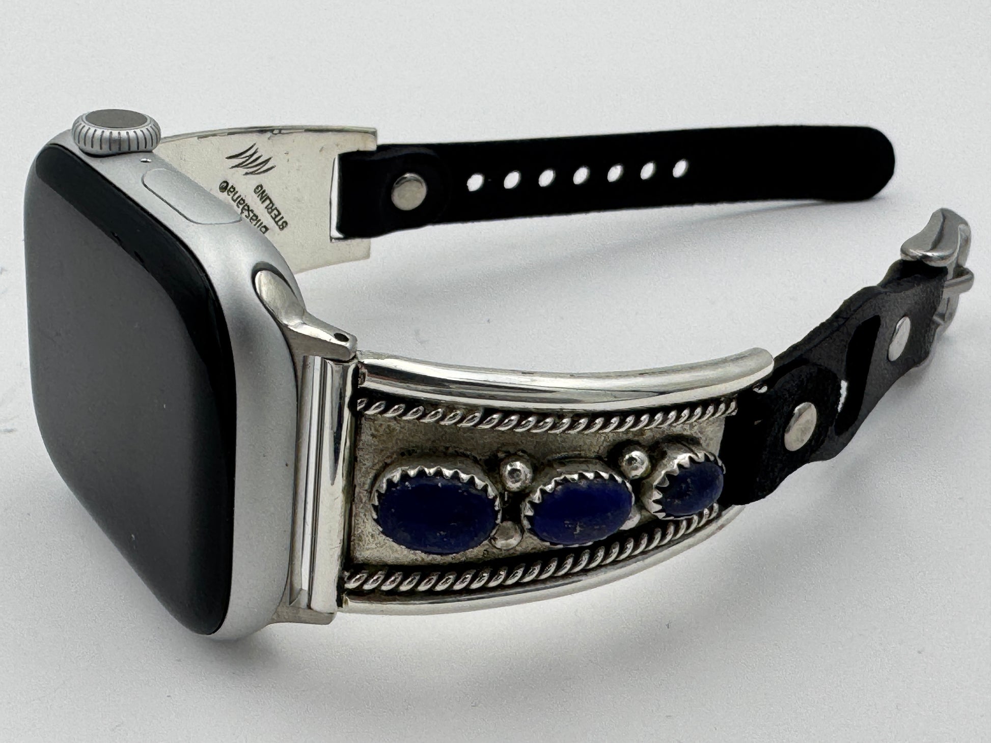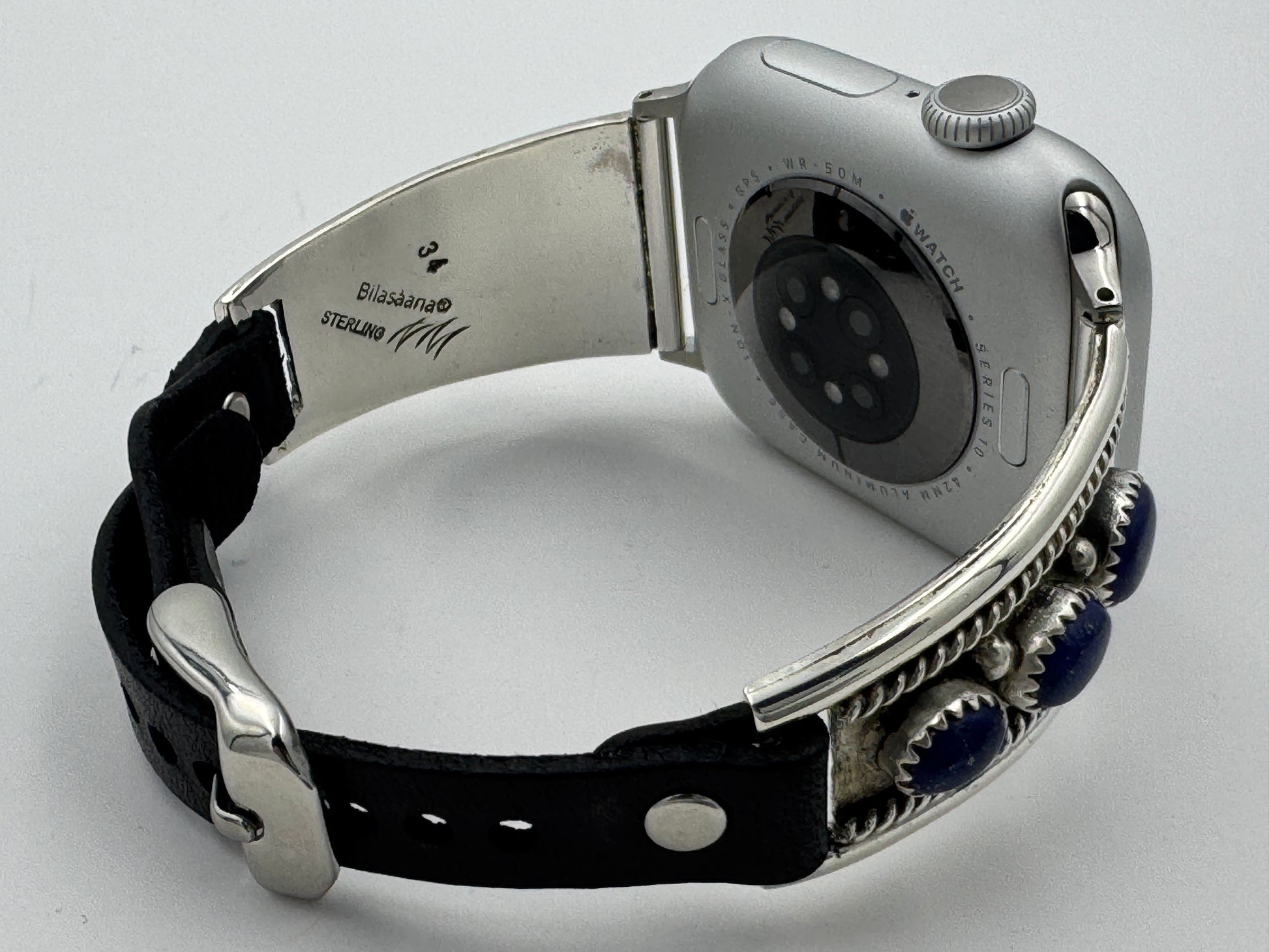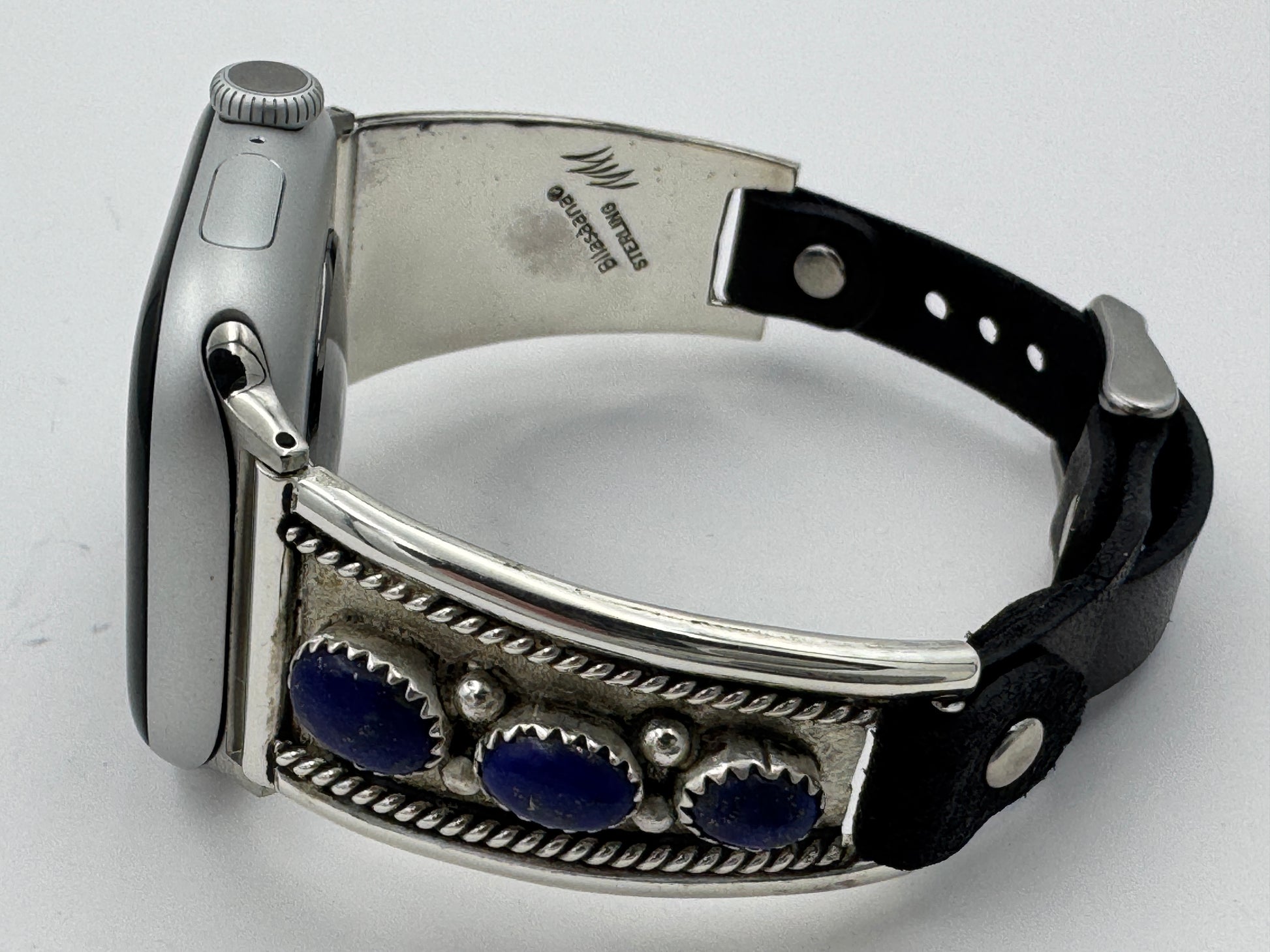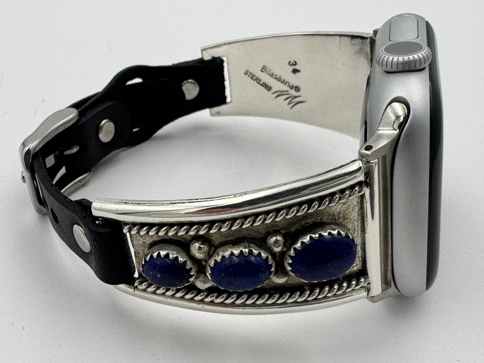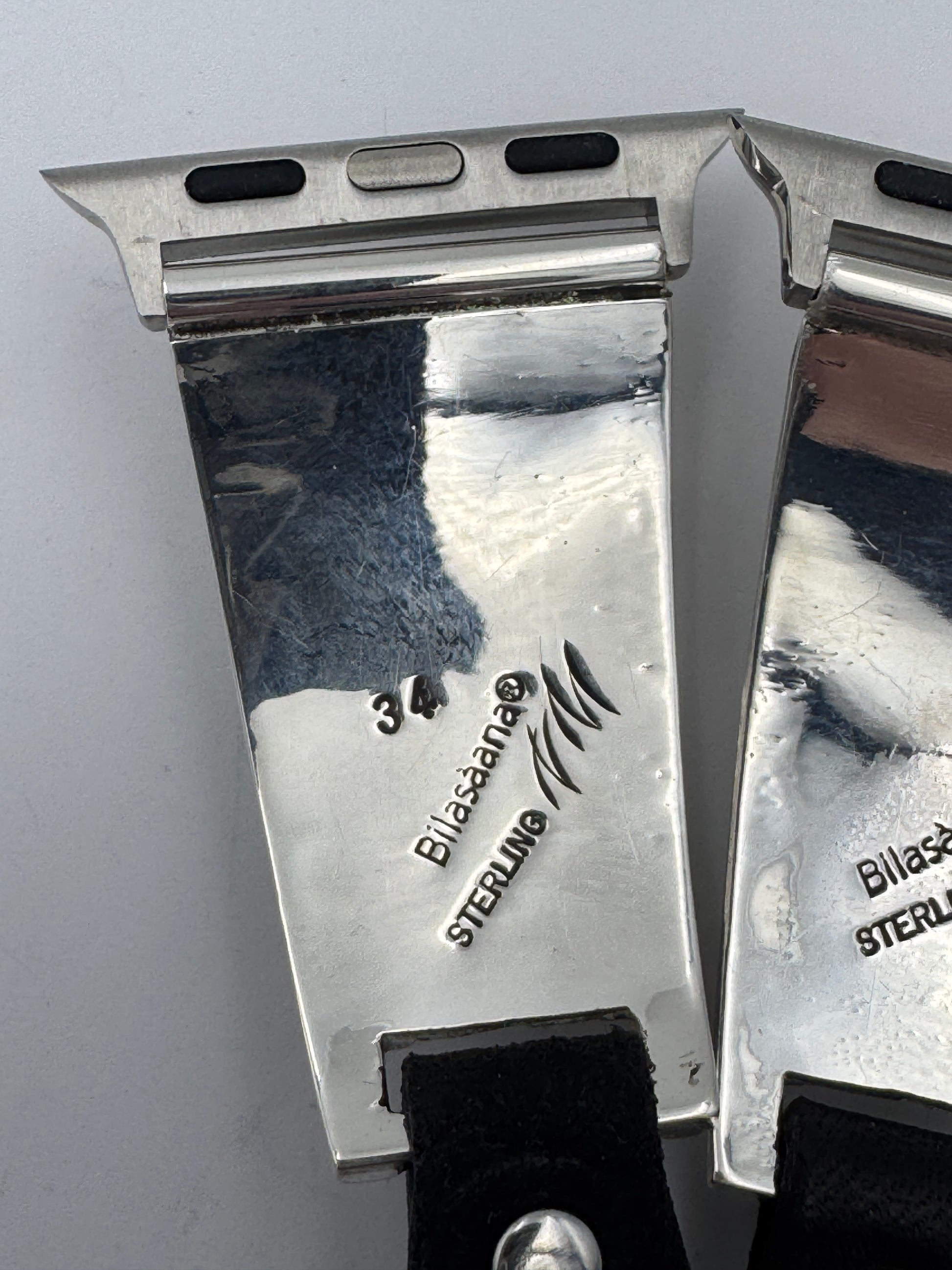 This is Nelson Morgan's 34th Bilasáana piece offered. The iBand consists of two Sterling Silver Tips with 38/40/41mm WATCH adapters and a Laser Cut Leather Band. The Sterling Silver Tips are Handcrafted by Nelson Morgan of the Navajo Nation and have an authentic Navajo Stamp and Bead Design with Blue Lapis stones on each side. On the inside of one Tip is the official Bilasáana Trademark, the serial number 34, a Sterling mark and Nelson's NM authenticity mark. The other tip has Sterling, Bilasaana and Nelson's marks.