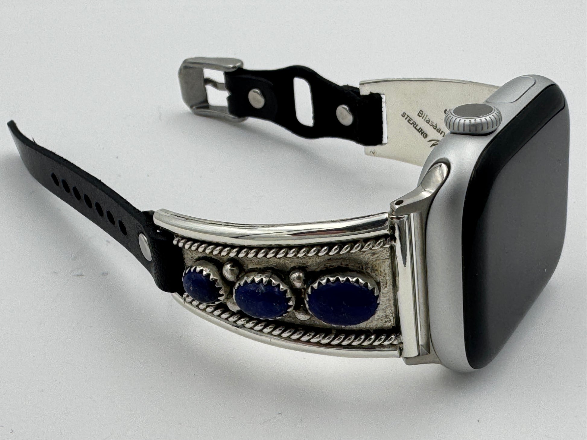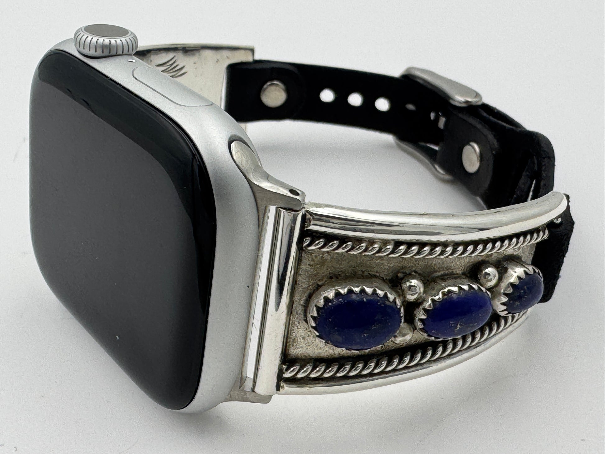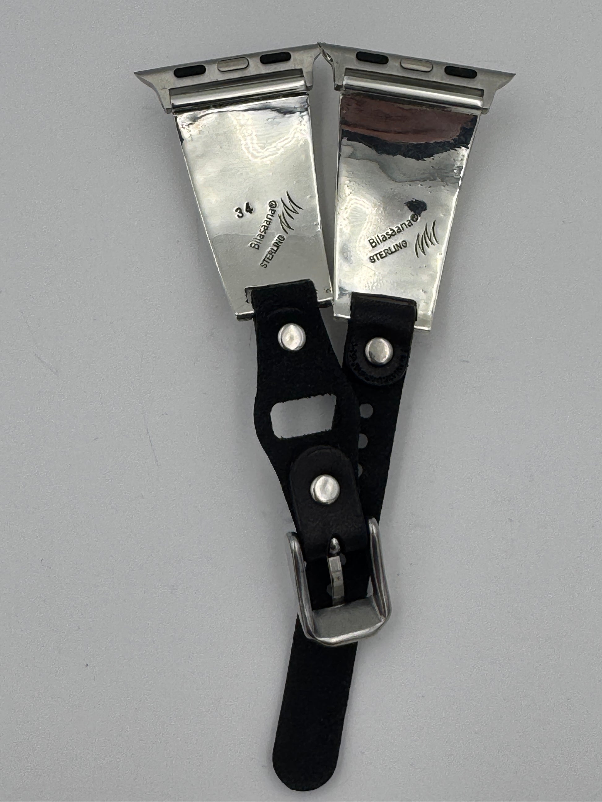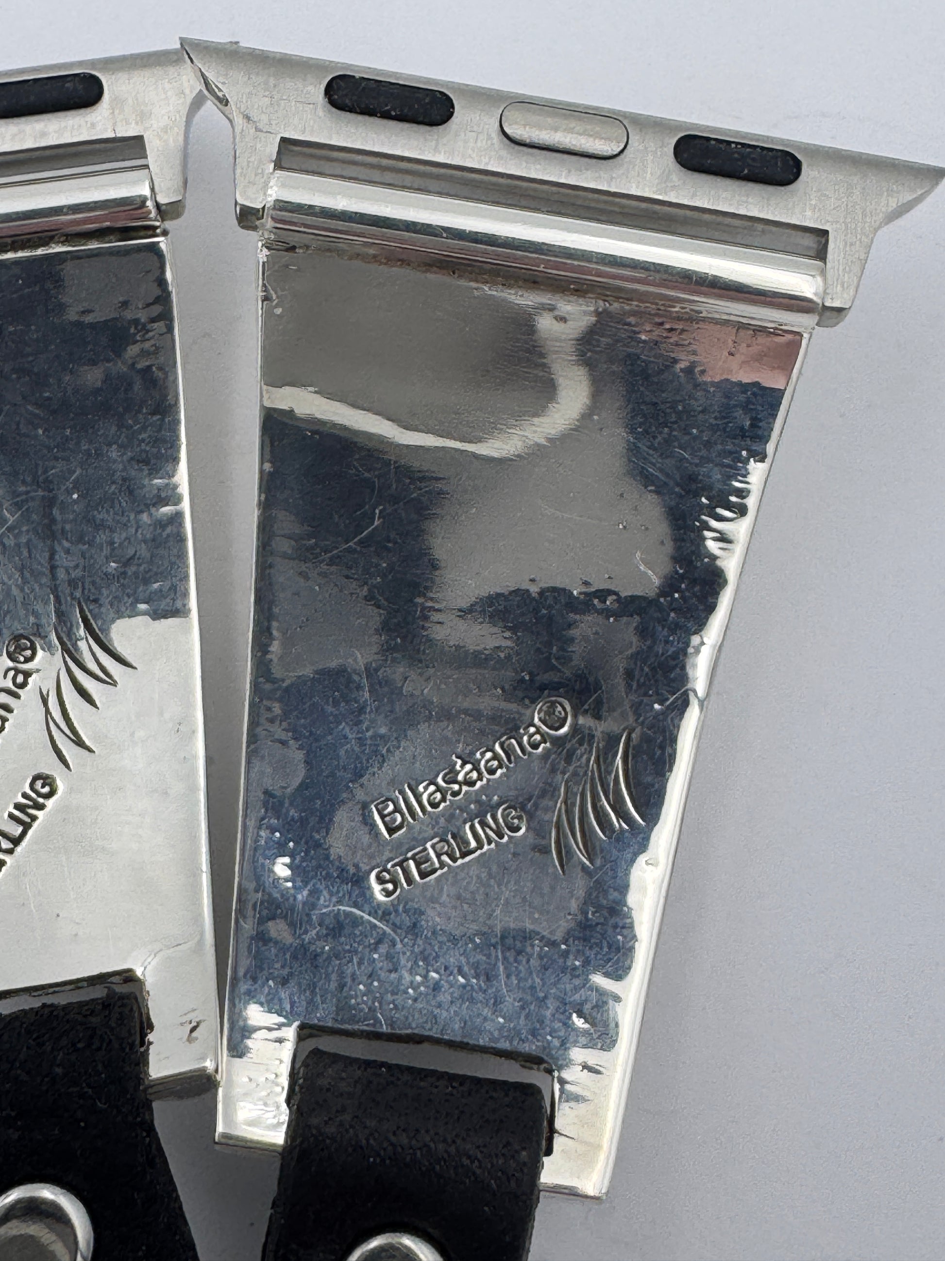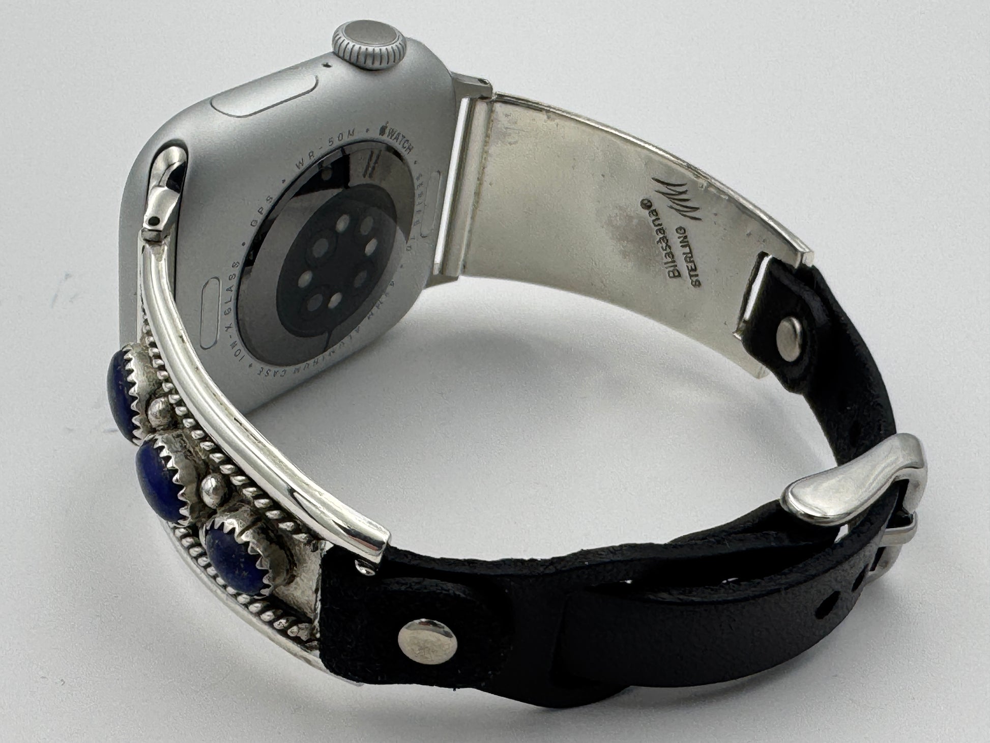 This is Nelson Morgan's 34th Bilasáana piece offered. The iBand consists of two Sterling Silver Tips with 38/40/41mm WATCH adapters and a Laser Cut Leather Band. The Sterling Silver Tips are Handcrafted by Nelson Morgan of the Navajo Nation and have an authentic Navajo Stamp and Bead Design with Blue Lapis stones on each side. On the inside of one Tip is the official Bilasáana Trademark, the serial number 34, a Sterling mark and Nelson's NM authenticity mark. The other tip has Sterling, Bilasaana and Nelson's marks.