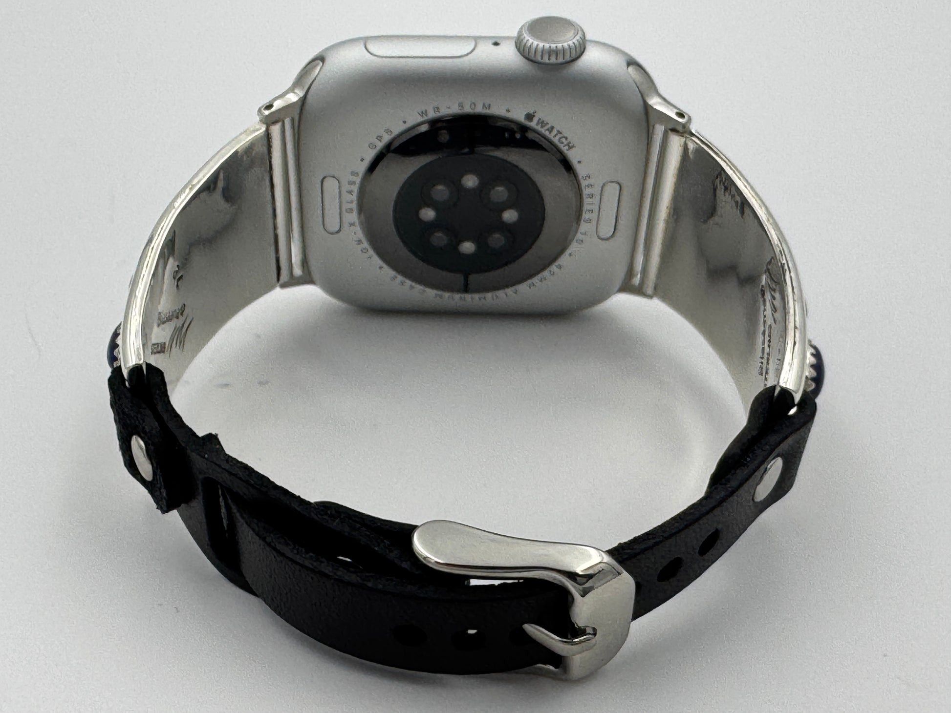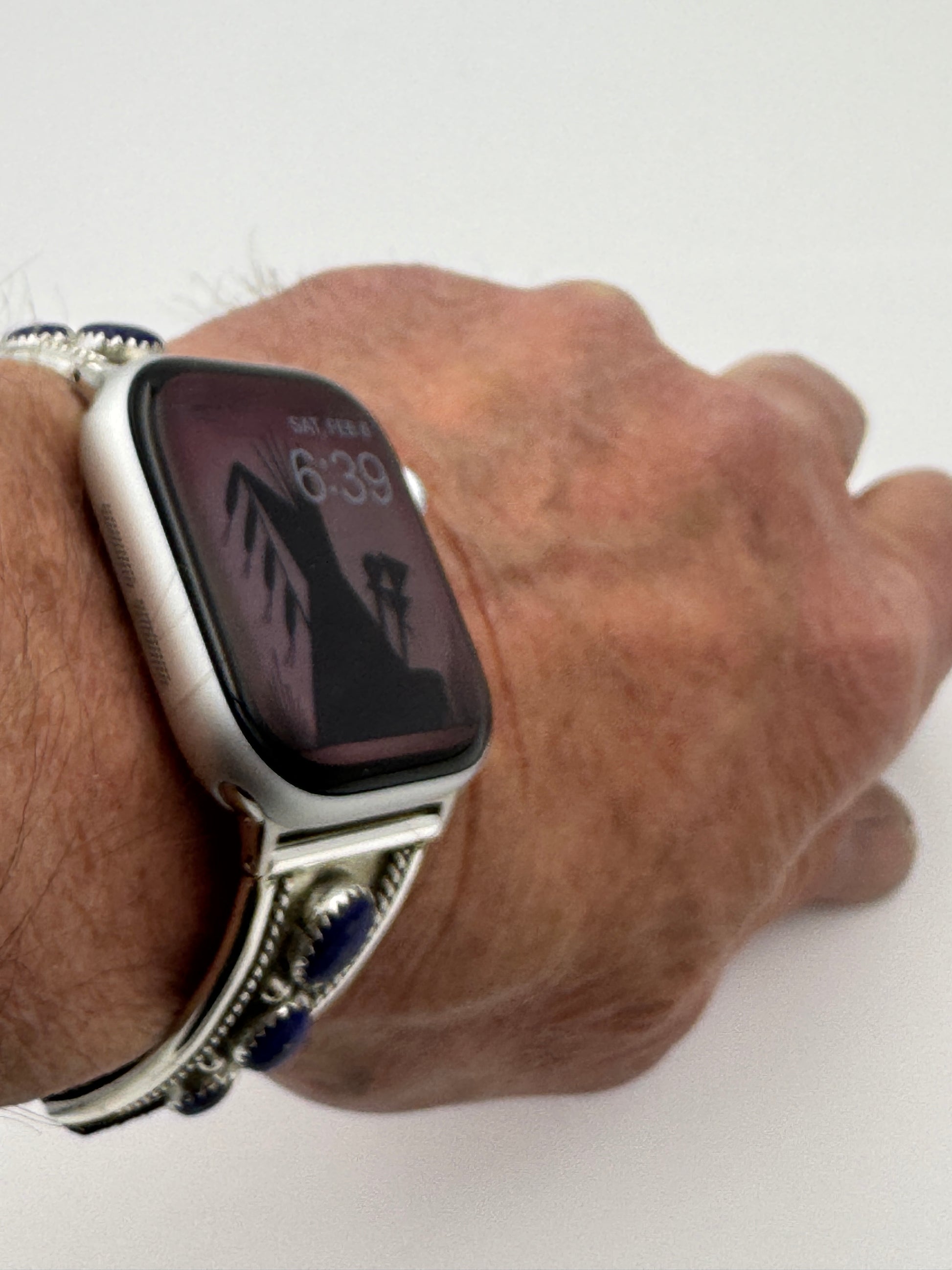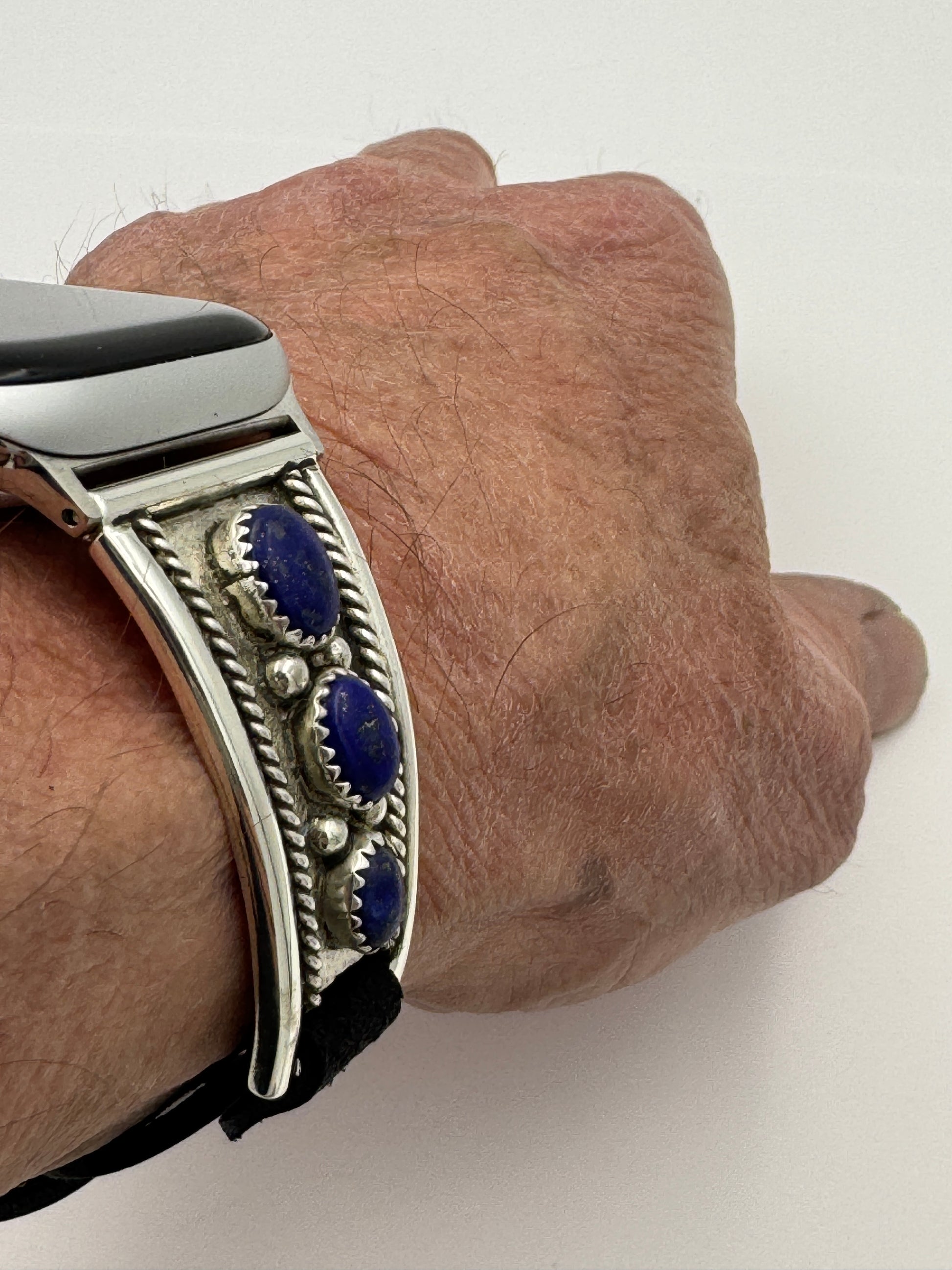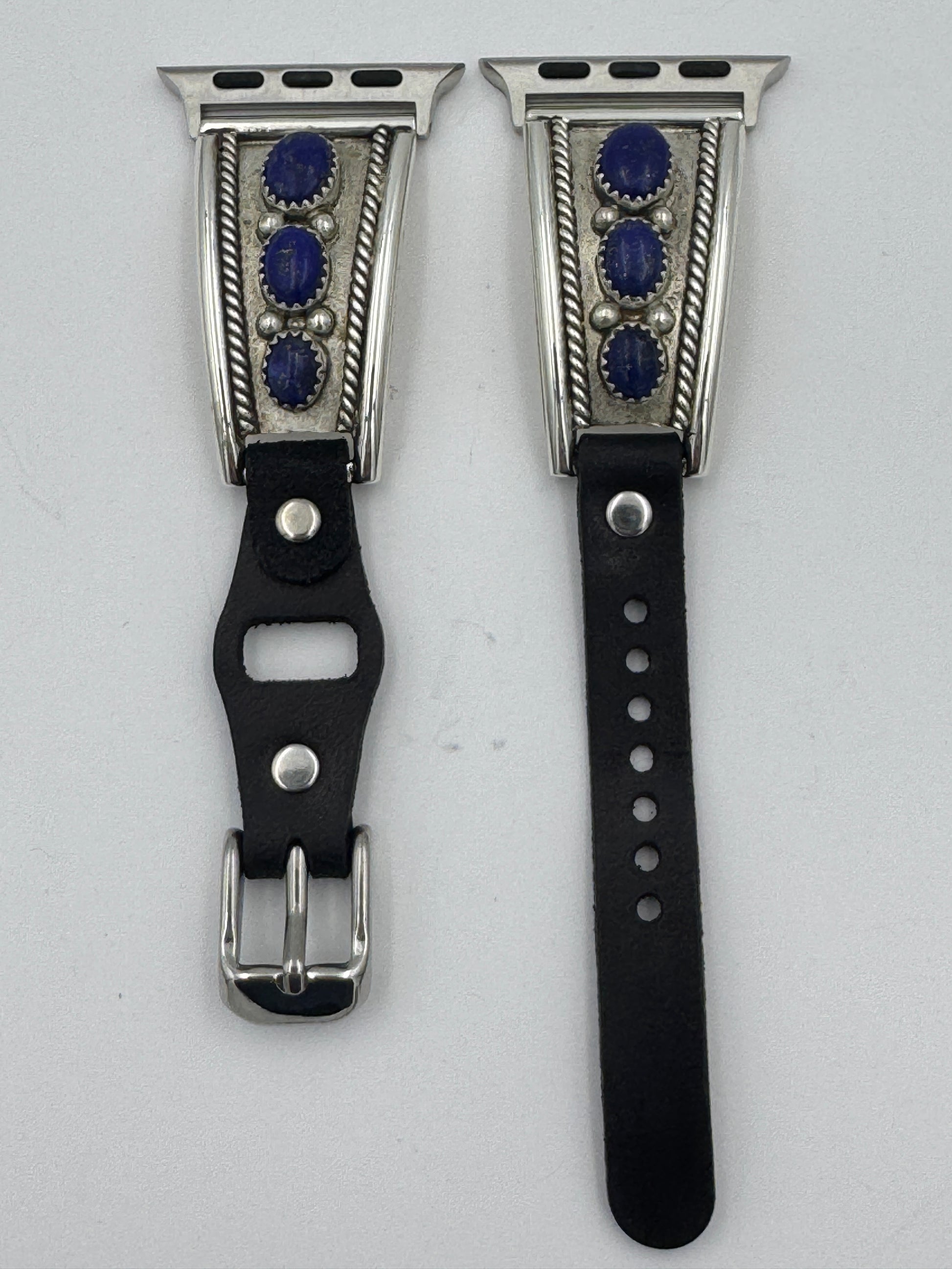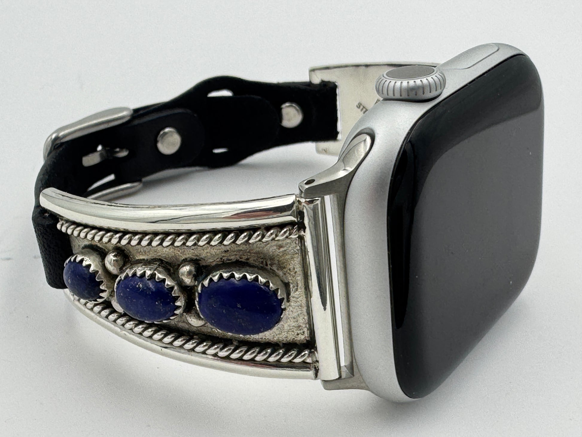 This is Nelson Morgan's 34th Bilasáana piece offered. The iBand consists of two Sterling Silver Tips with 38/40/41mm WATCH adapters and a Laser Cut Leather Band. The Sterling Silver Tips are Handcrafted by Nelson Morgan of the Navajo Nation and have an authentic Navajo Stamp and Bead Design with Blue Lapis stones on each side. On the inside of one Tip is the official Bilasáana Trademark, the serial number 34, a Sterling mark and Nelson's NM authenticity mark. The other tip has Sterling, Bilasaana and Nelson's marks.
