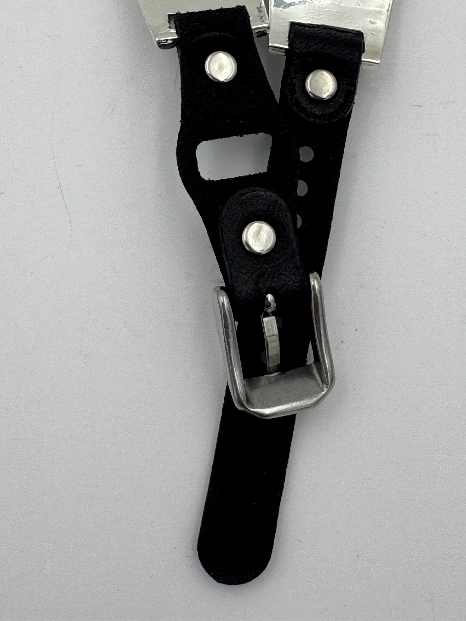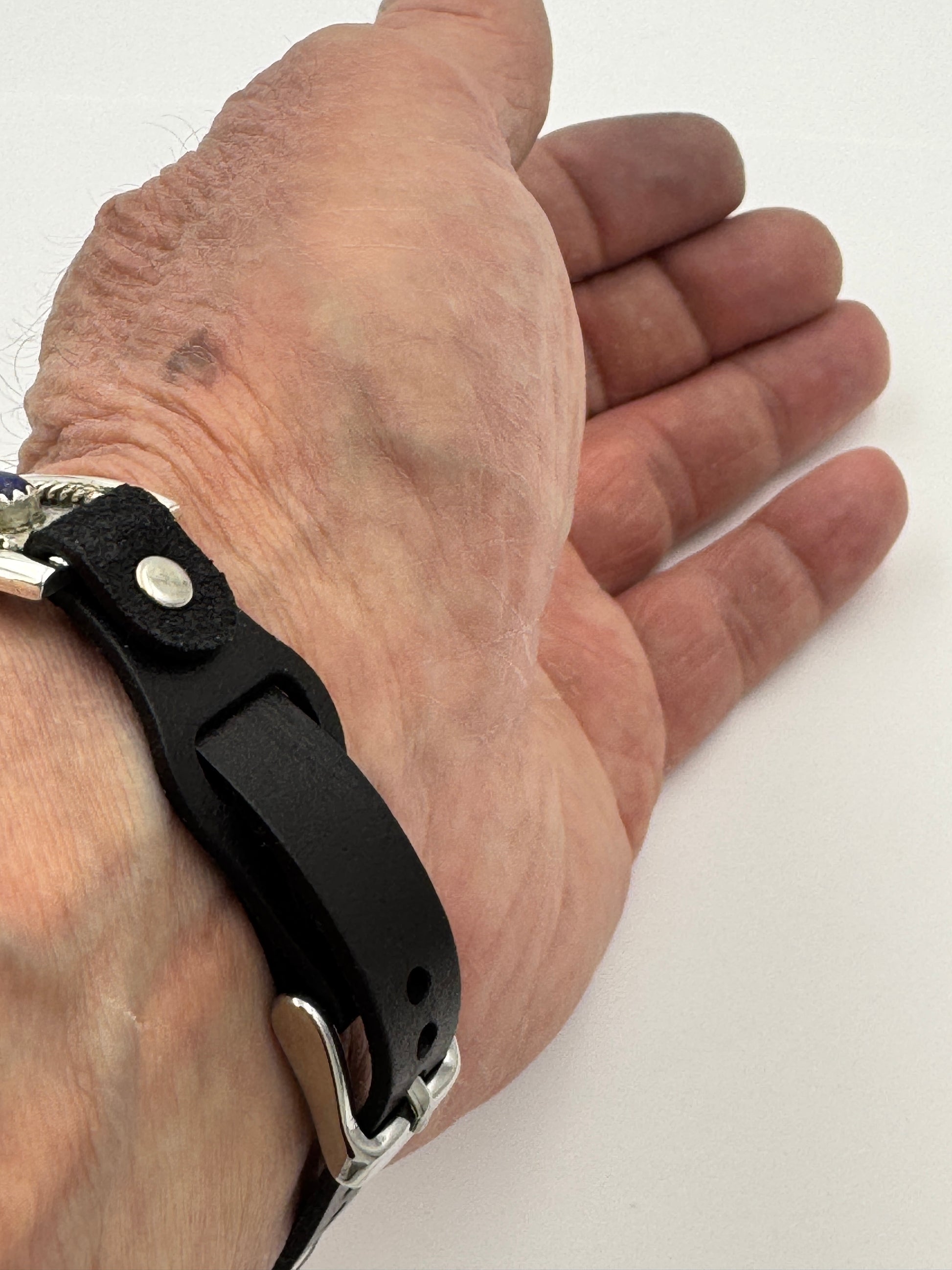The iBand comes with a choice of our new Laser Cut Riveted bands in a variety of colors and styles. We can do a button band or a buckle band in a variety of colors and sizes. This band shown has our latest ladies S/M black buckle no loop band v6.0 UB. This buckle band has smaller holes which should last longer and gives a more precise fit. This is a great piece for a small to medium size wrist. By changing the leather band we can make this band fit virtually any wrist nicely. Choose your band size at checkout and we will contact you to assure a nice fit. The iBand will seamlessly integrate with the Apple 38mm Series 1 thru Series 9 41mm or the new series 10 42mm WATCH. We can also make this band work with the bigger 42/44/45/46/49mm Apple Watches by changing the adapters. Great band for a small wrist with the big Watch.