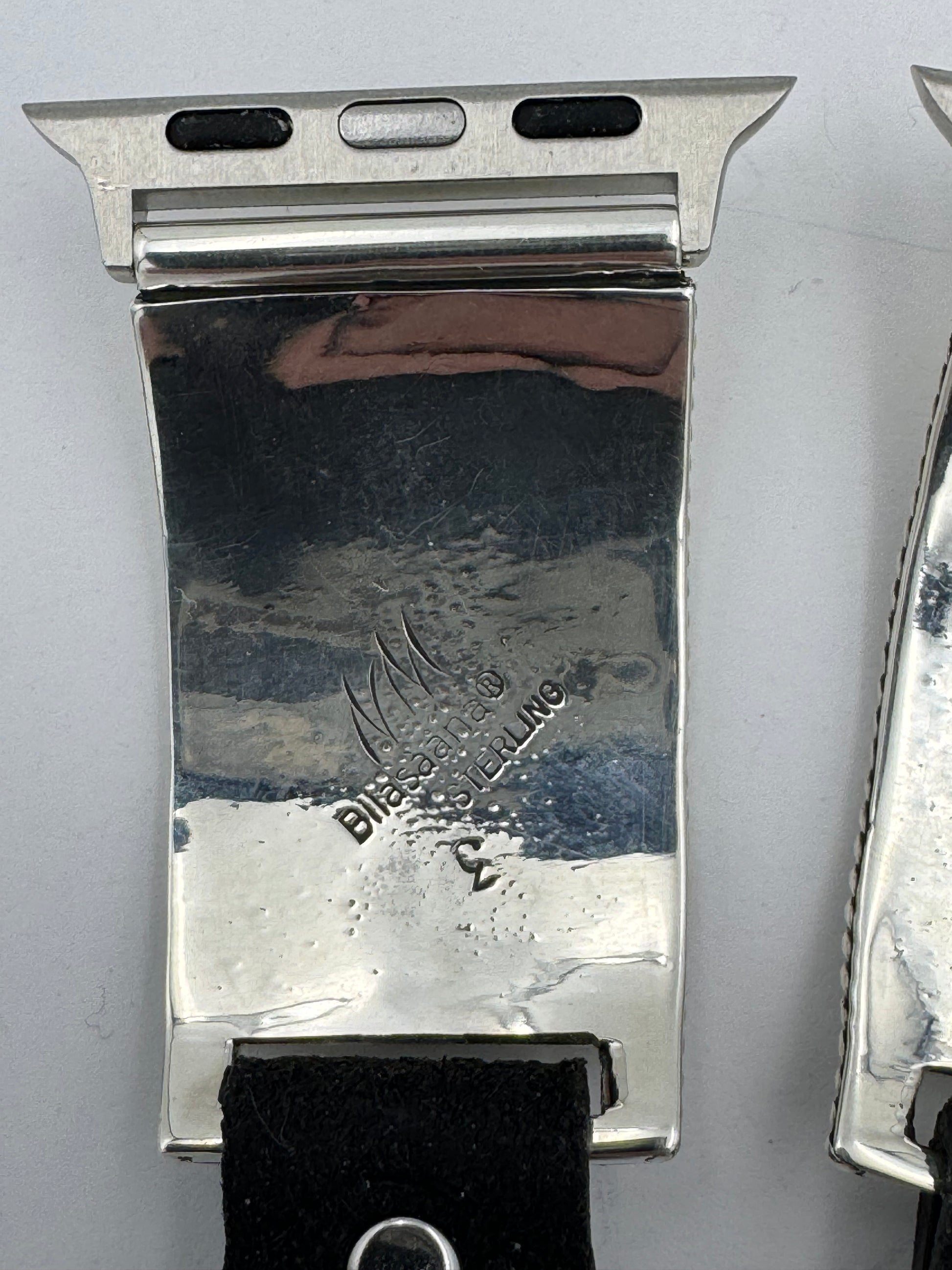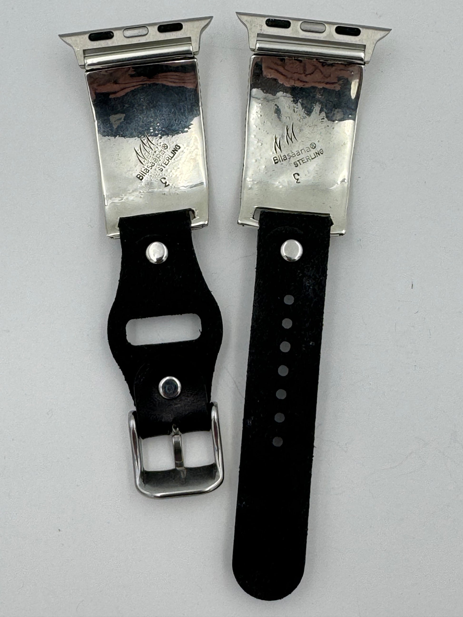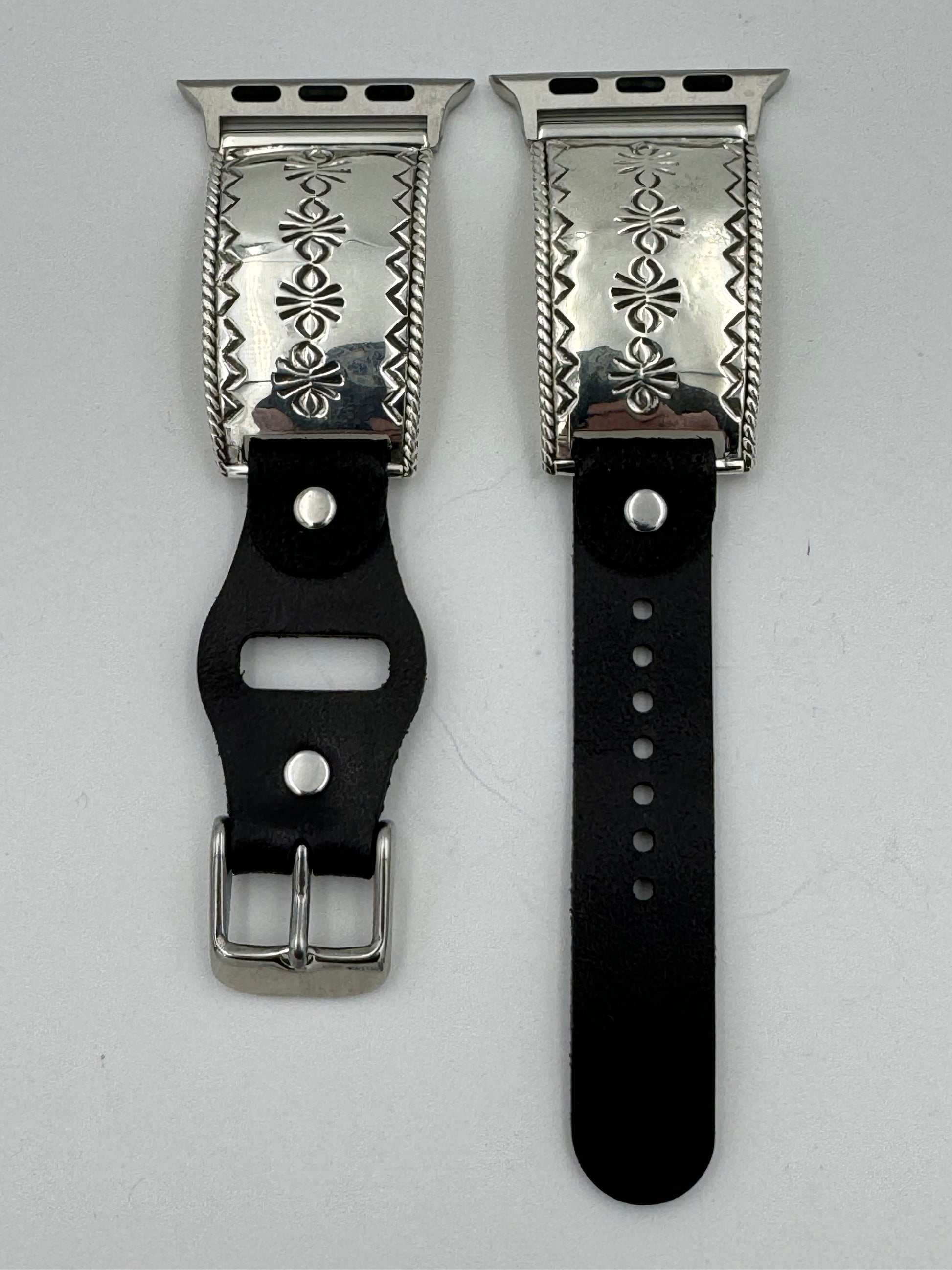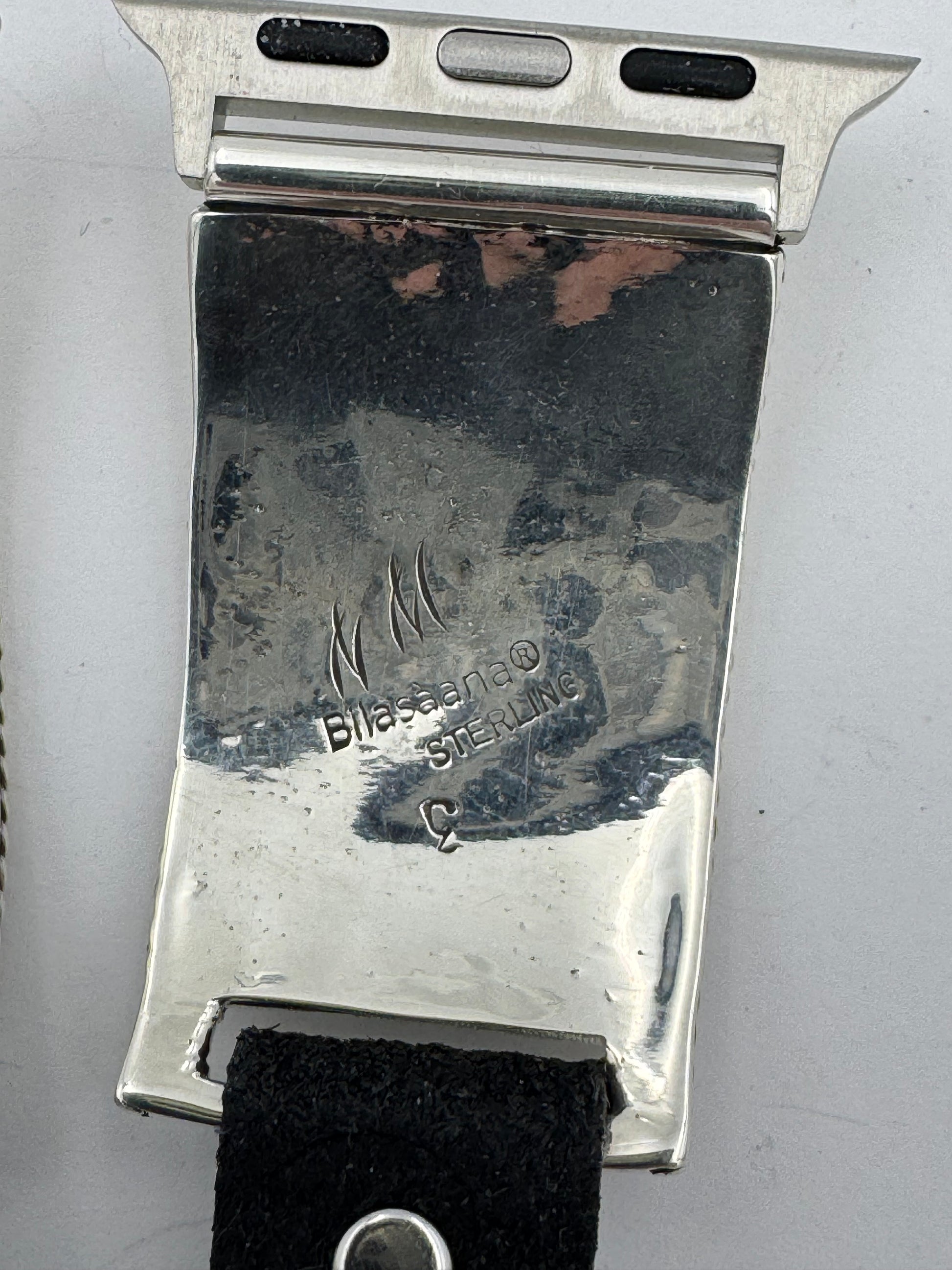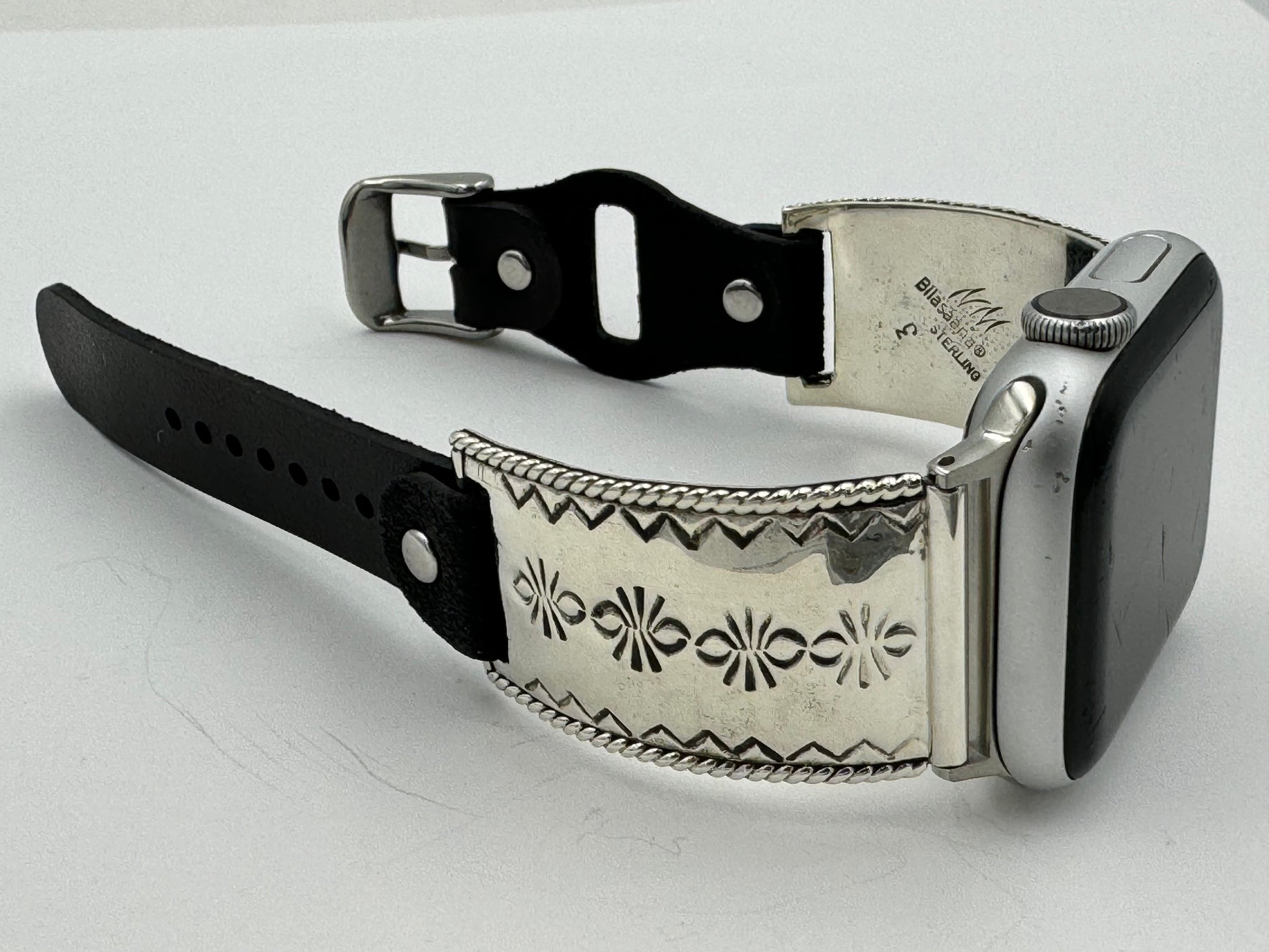 This is the 3rd Bilasáana Nelson Morgan piece offered. The iBand consists of two Sterling Silver Tips with 38/40/41mm WATCH adapters and a leather band. The Sterling Silver Tips are Handcrafted by Nelson Morgan of the Navajo Nation and have an authentic Navajo stamped and cutout design. On the inside of one Tip is the official Bilasáana Trademark, Nelson's mark, a Sterling mark and a serial #3. The other tip has the official Bilasaana® mark, Nelson's authenticity Stamp, a Sterling mark and serial #3.