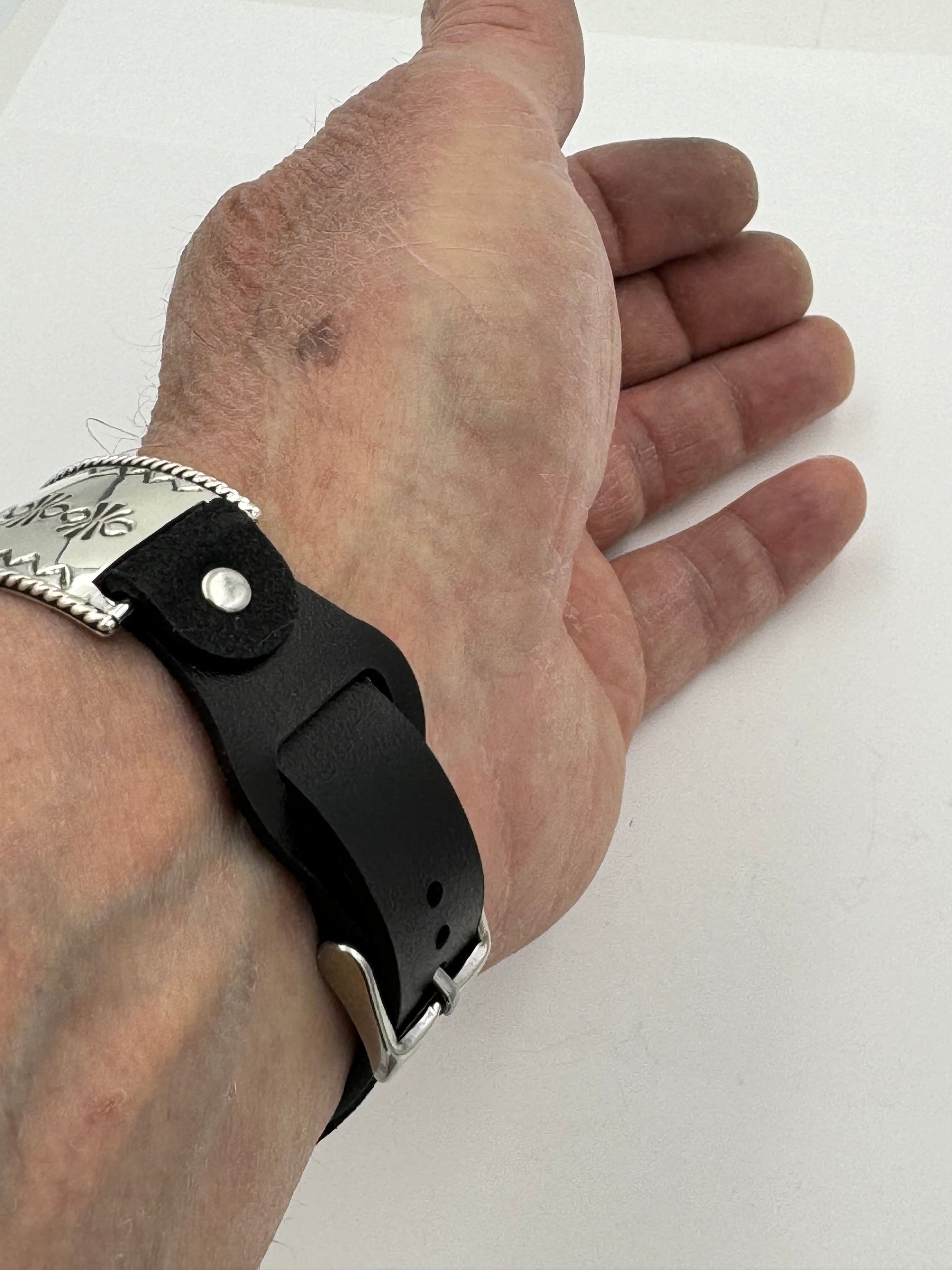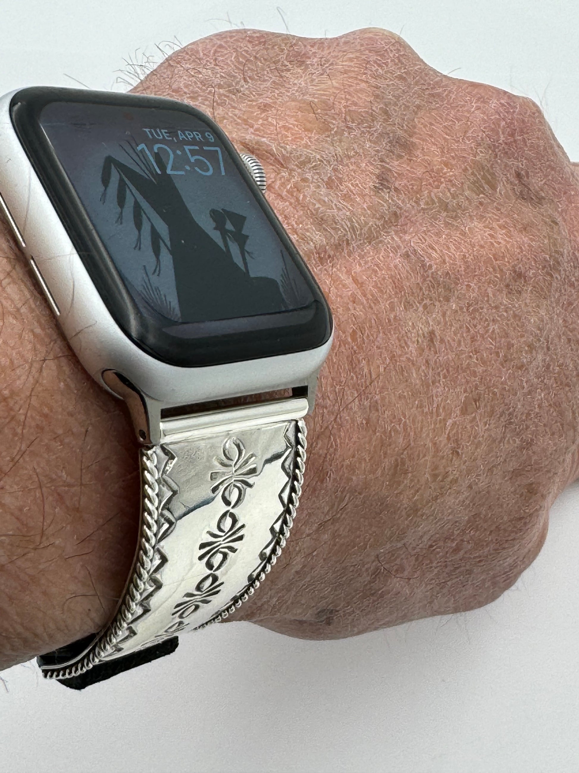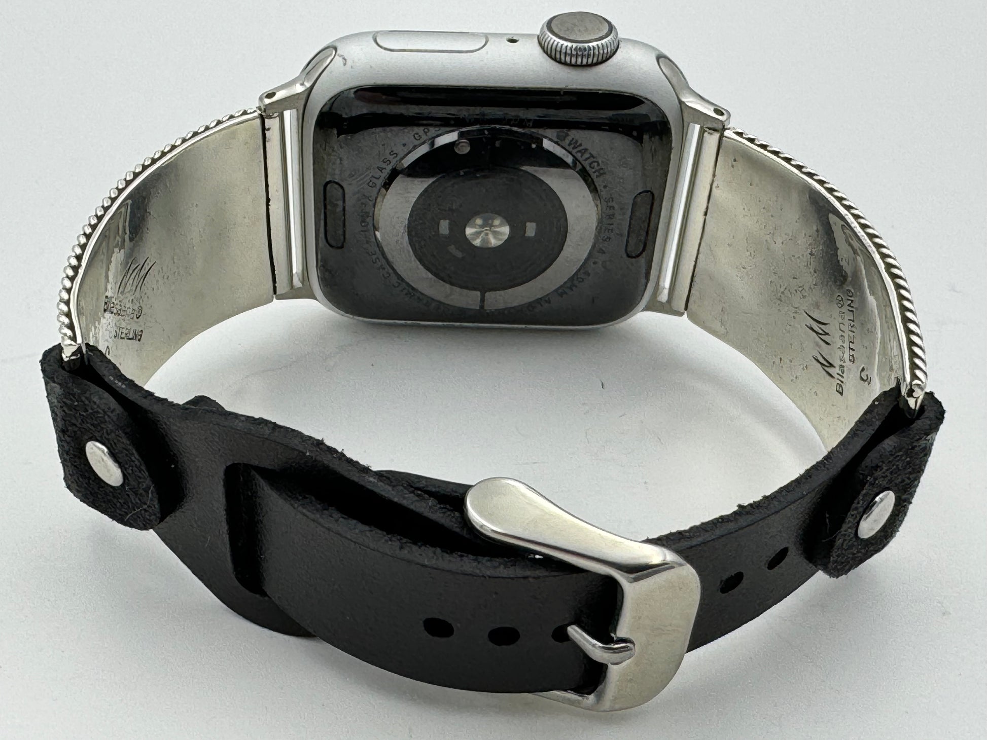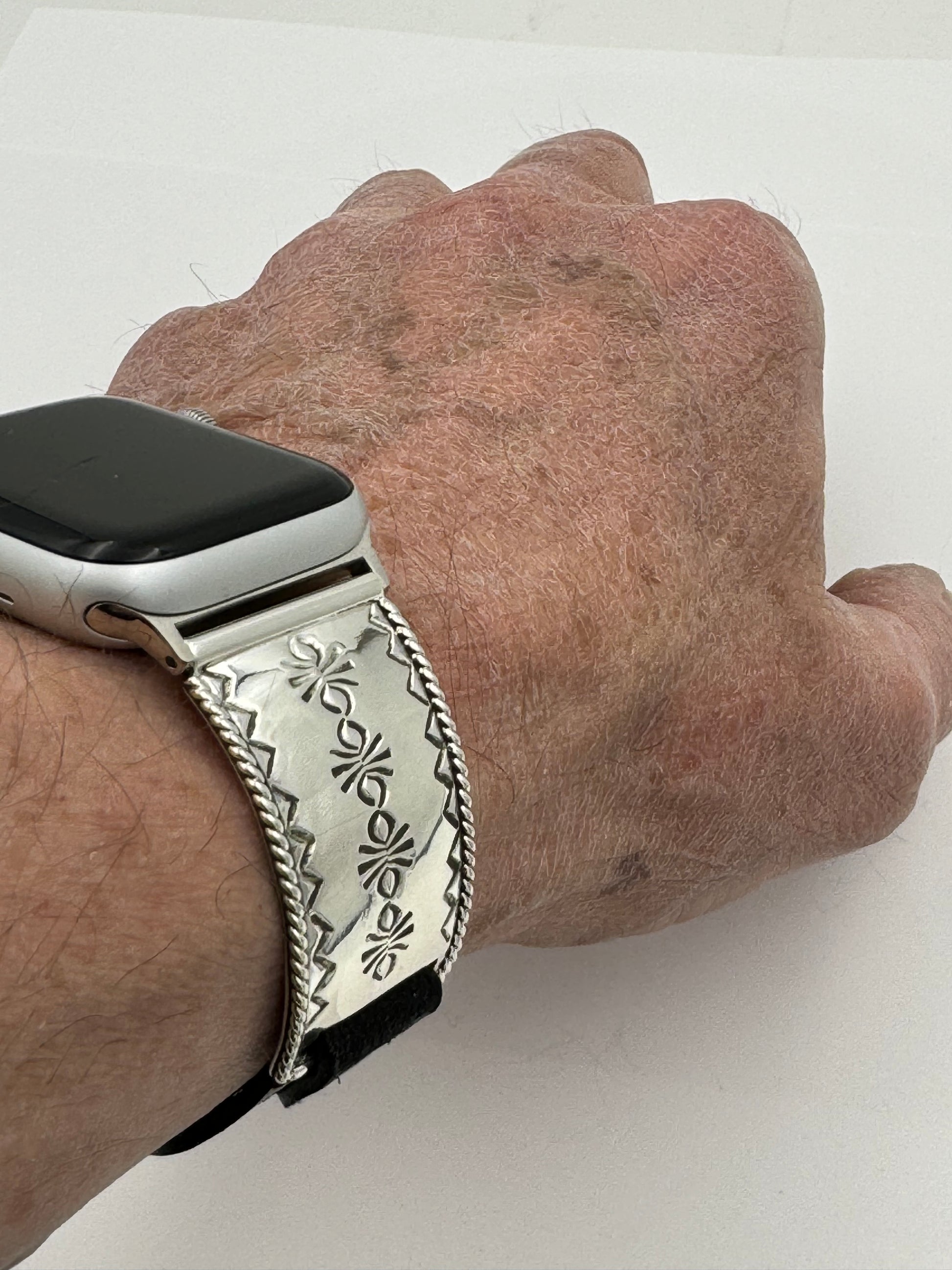 This purchase includes a Handcrafted Native American Sterling Silver Leather iBand for Apple WATCH Series 1 38mm thru Series 9 41mm. The Apple WATCH 38/40/41mm is not included.