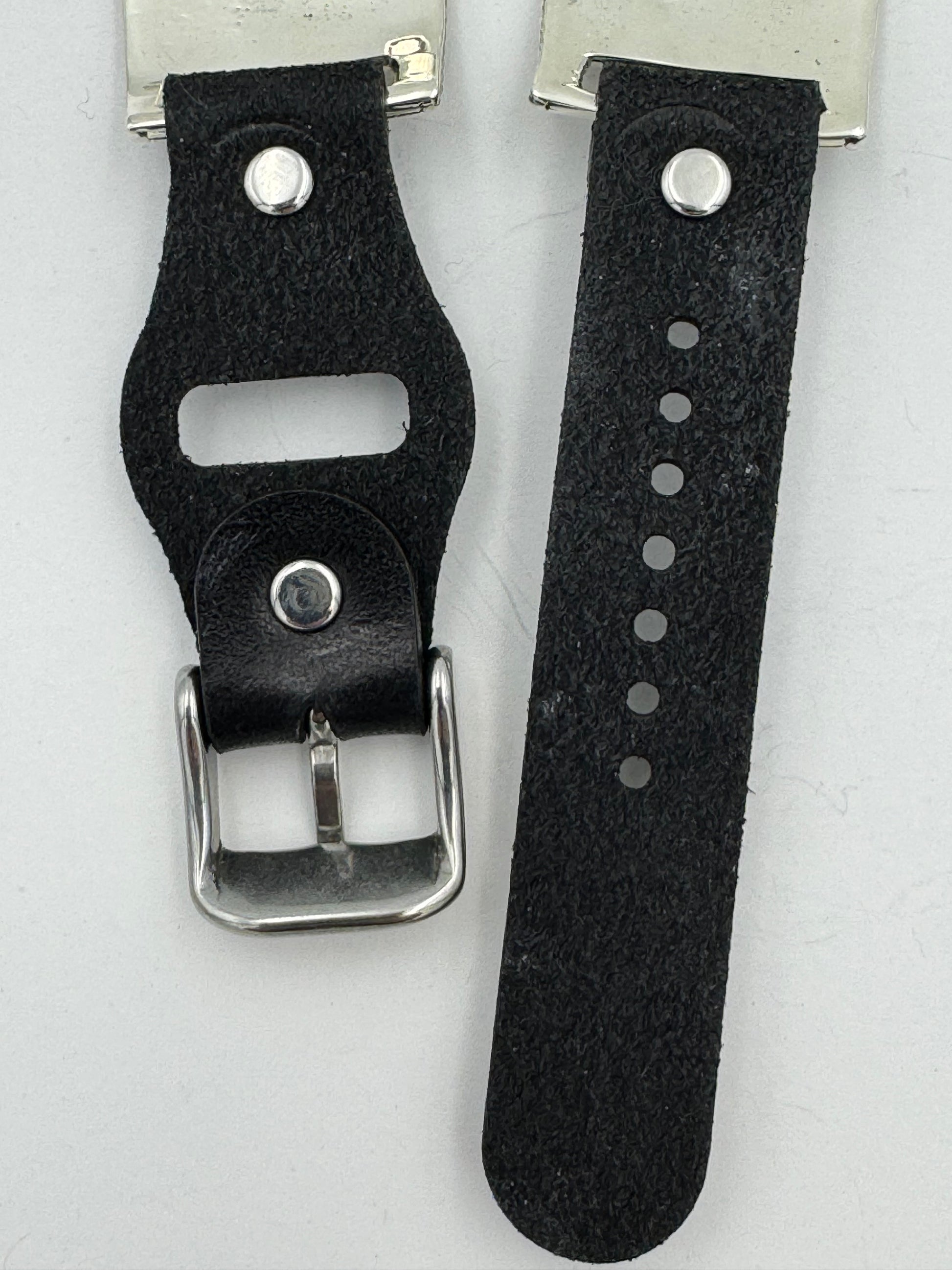 The iBand comes with our Laser Cut Riveted Universal Leather Buckle Band v6.0 as shown. The leather band comes in two sizes S/M and M/L. The iBand shown has a Black S/M band attached. This is a great piece for a small to a medium size wrist. We can size this band to fit virtually any wrist. Choose the available size at check out and we will contact you to assure a nice fit. We can also do the leather band in a variety of styles and colors including dark brown and black, buckle and button. The iBand will seamlessly integrate with the Apple 38mm Series 1 thru Series 9 41mm WATCH. We can also make this band work with the 42/44/45/49mm Apple Watches by changing the adapters. Great band for a small wrist with the big Watch.