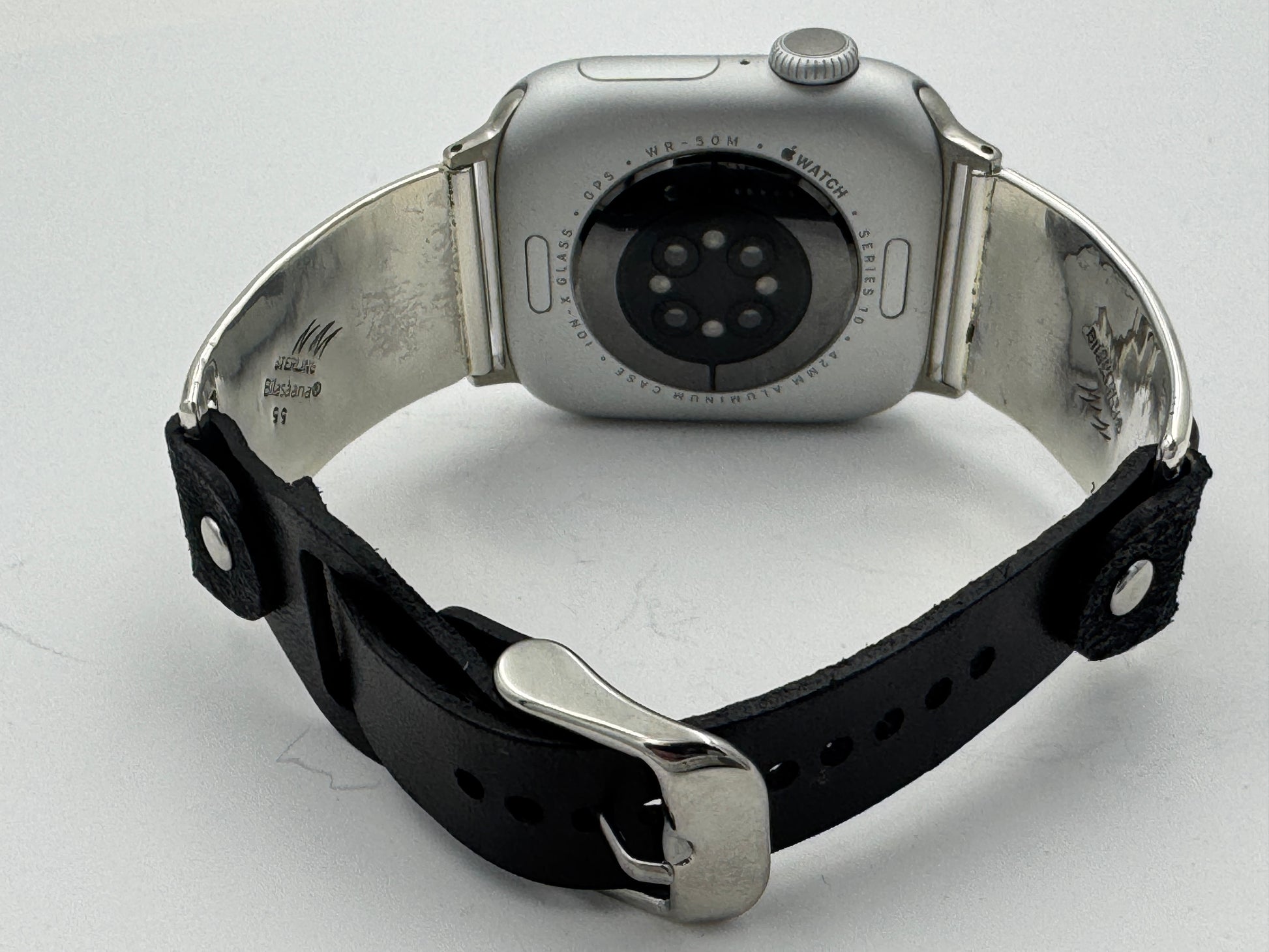 The iBand comes with our Laser Cut Riveted Universal buckle Leather Band v6.0 with no loop as shown. The leather band comes in two sizes S/M and M/L. The iBand shown has a Black colored M/L band attached. This is a great piece for a small to a medium size wrist. We can size this band to fit virtually any wrist. Choose the available size at check out and we will contact you to assure a nice fit. We can also do the leather band in a variety of styles and colors including dark brown, buckskin black and other colors. The iBand will seamlessly integrate with the Apple 38mm Series 1 thru Series 10 42mm WATCH. We can also make this band work with the bigger 42/44/45/49mm Apple Watches by changing the adapters making it a Great band for a small wrist with the small or big Watch.