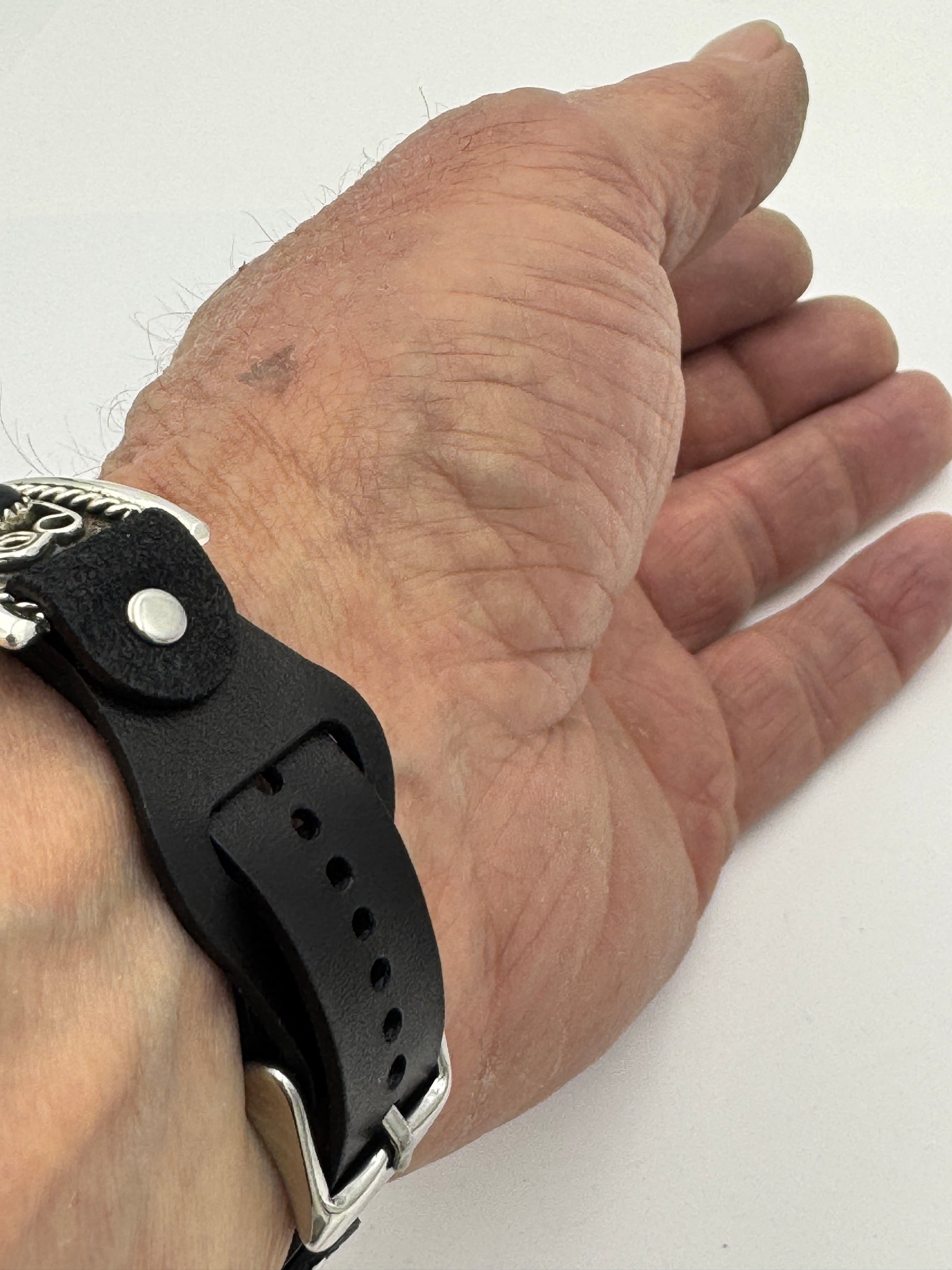 The iBand comes with our Laser Cut Riveted Universal buckle Leather Band v6.0 with no loop as shown. The leather band comes in two sizes S/M and M/L. The iBand shown has a Black colored M/L band attached. This is a great piece for a small to a medium size wrist. We can size this band to fit virtually any wrist. Choose the available size at check out and we will contact you to assure a nice fit. We can also do the leather band in a variety of styles and colors including dark brown, buckskin black and other colors. The iBand will seamlessly integrate with the Apple 38mm Series 1 thru Series 10 42mm WATCH. We can also make this band work with the bigger 42/44/45/49mm Apple Watches by changing the adapters making it a Great band for a small wrist with the small or big Watch.