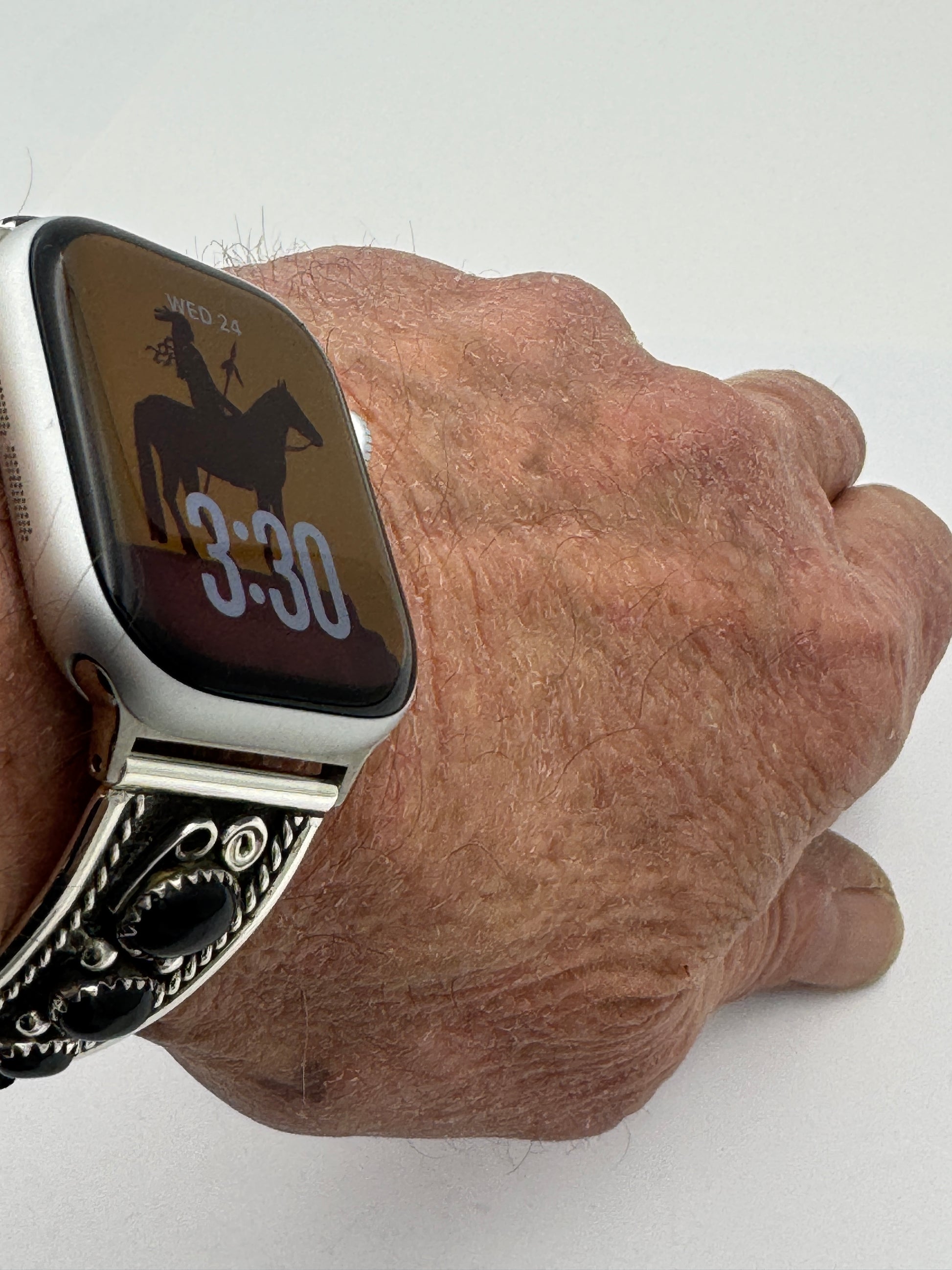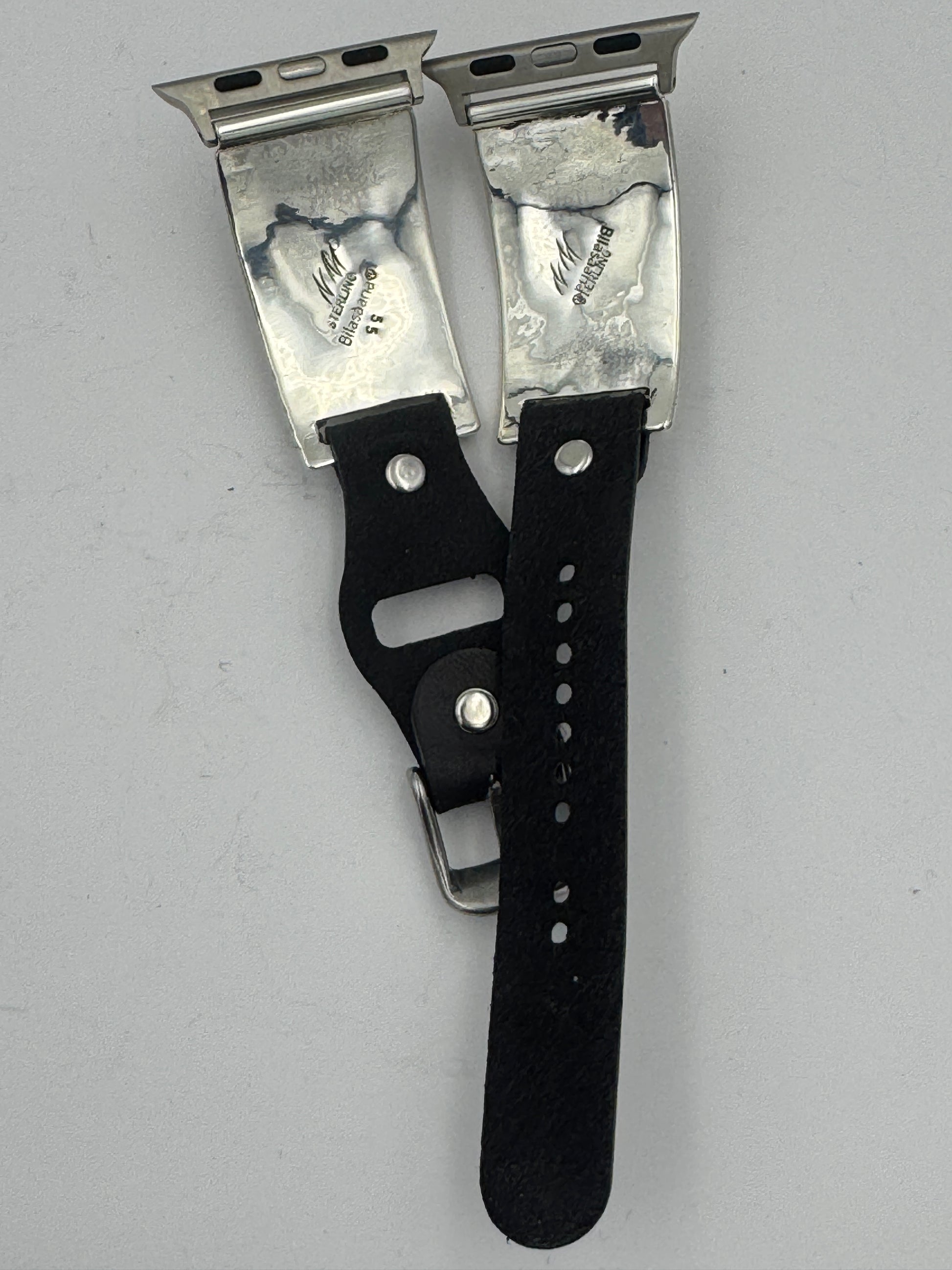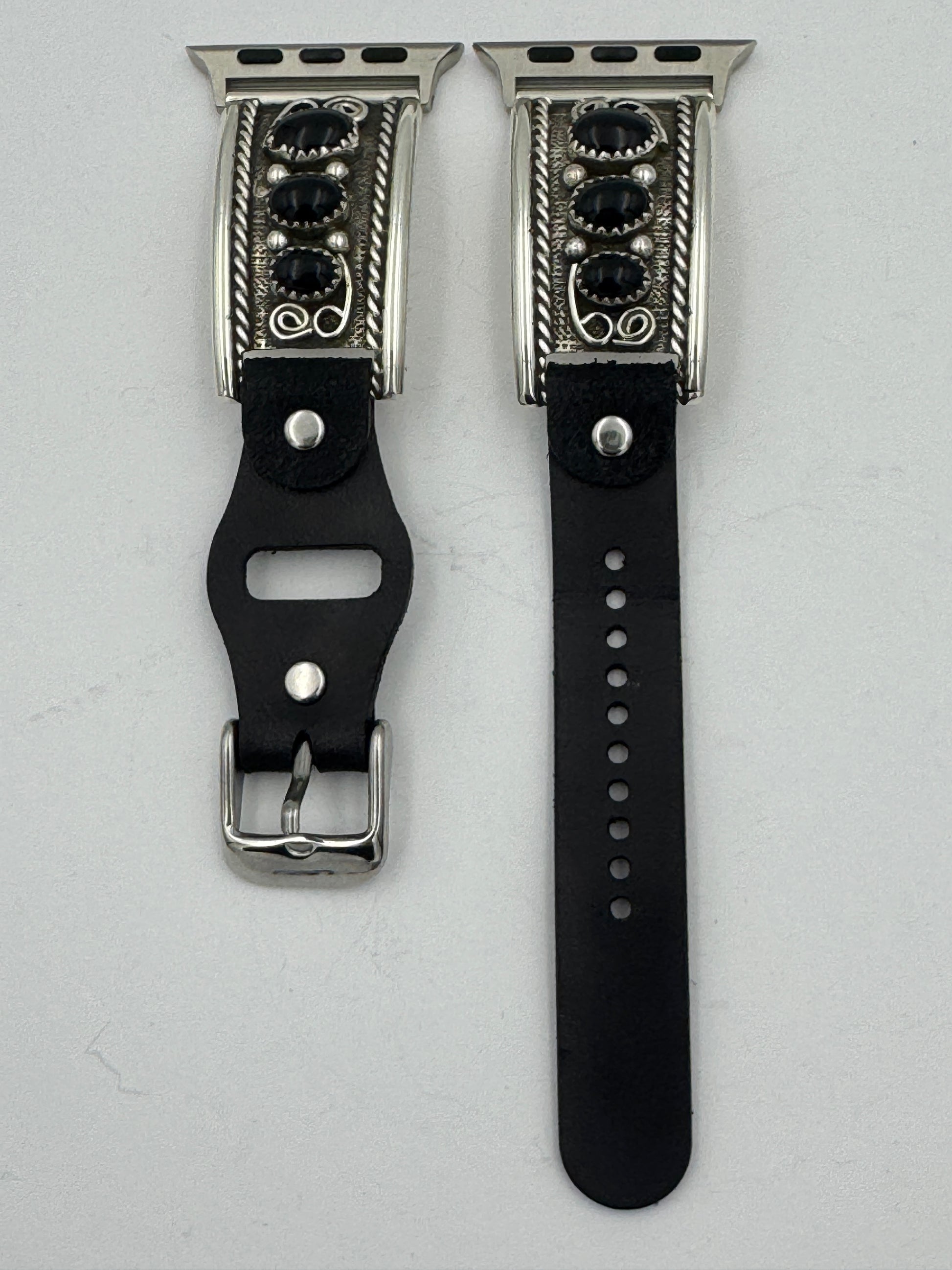 This is the 55th Bilasáana Nelson Morgan piece offered. The iBand consists of two Sterling Silver Tips with 38/40/41/42mm WATCH adapters and a leather band. The Sterling Silver Tips are Handcrafted by Nelson Morgan of the Navajo Nation and have an authentic Navajo twisted wire design with three Black Onyx stones on each side. On the inside of one Tip is the official Bilasáana Trademark, a Sterling mark and a serial #55 and Nelson's authenticity Stamp. The other tip has Nelsons stamp with Sterling and Bilasaana marks.