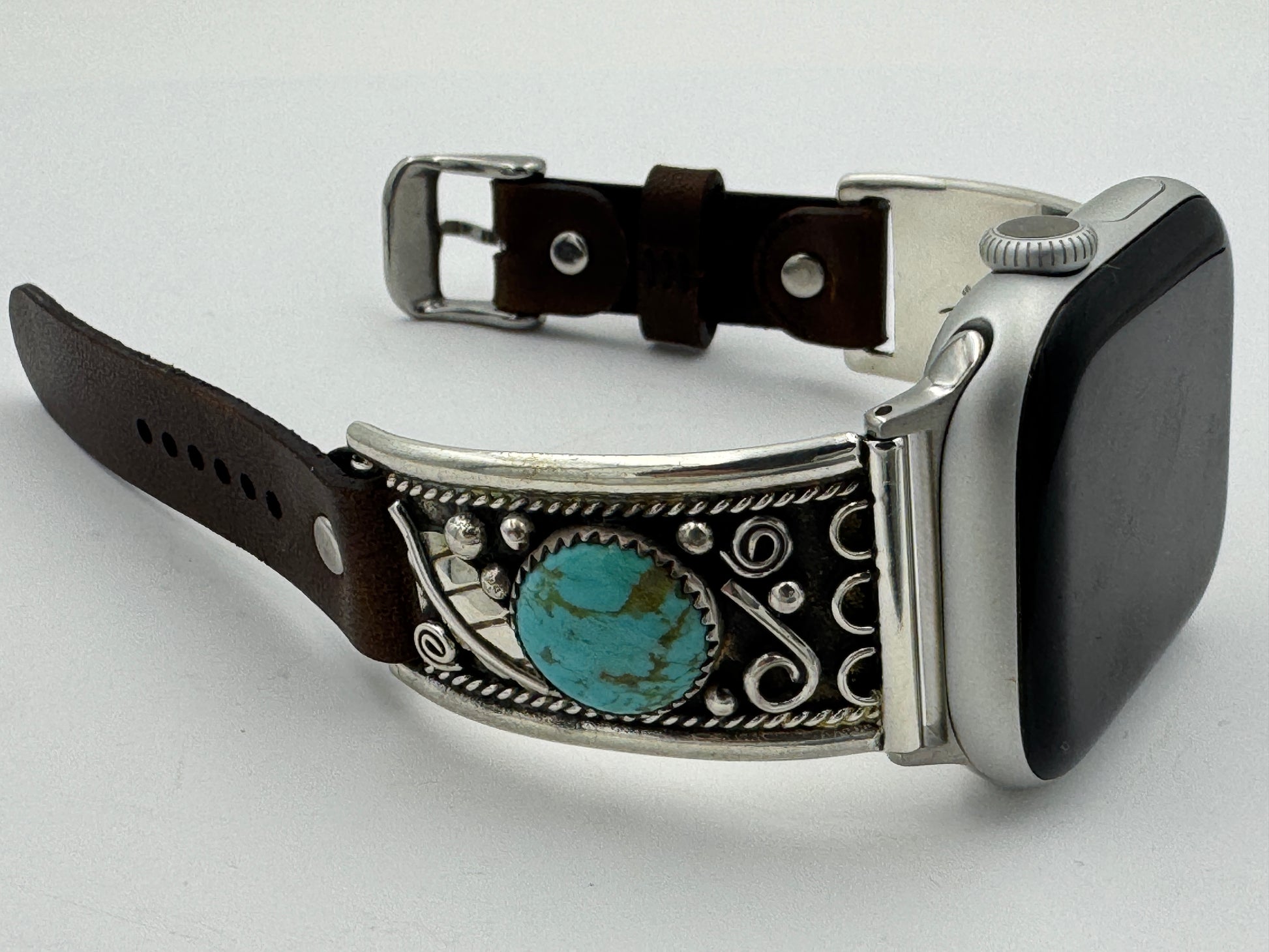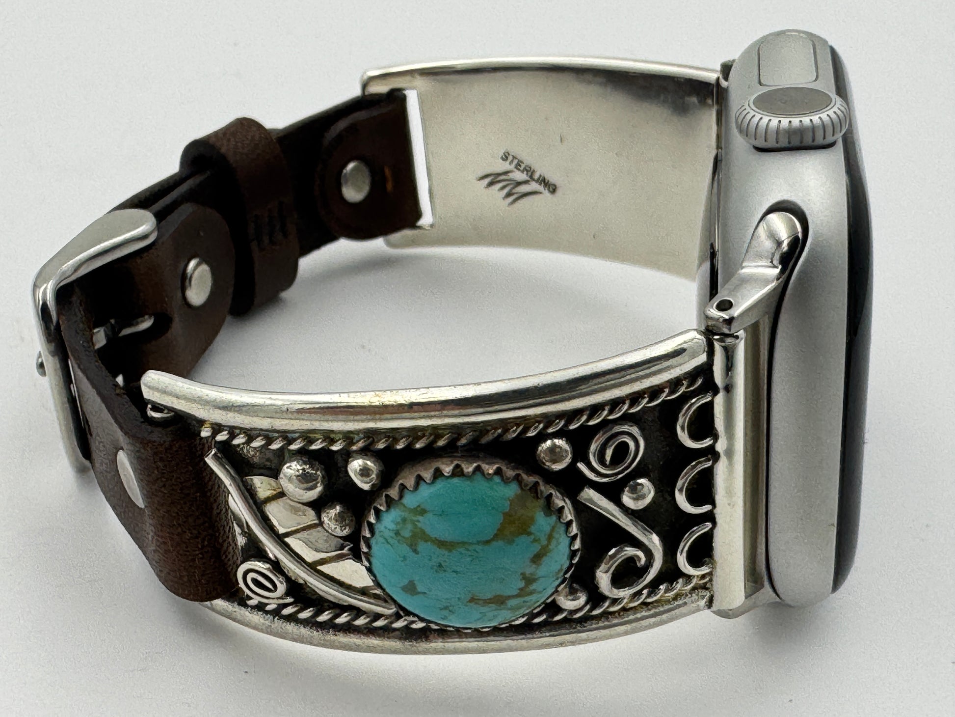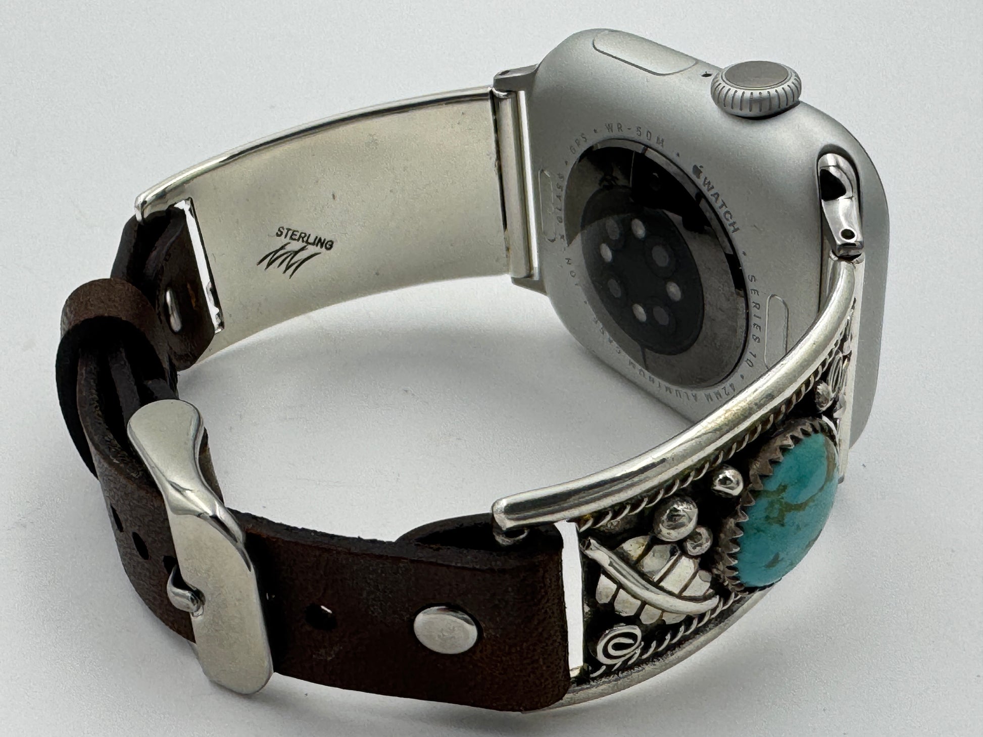 This purchase includes a Handcrafted Native American Sterling Silver Leather iBand for Apple WATCH Series 1 38mm thru Series 10 42mm. The Apple WATCH 38/40/41/42mm is not included.