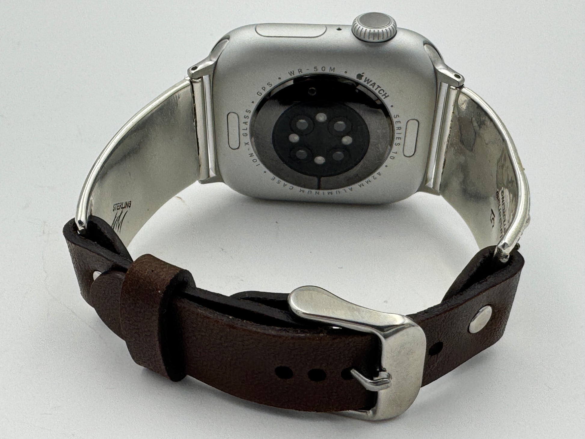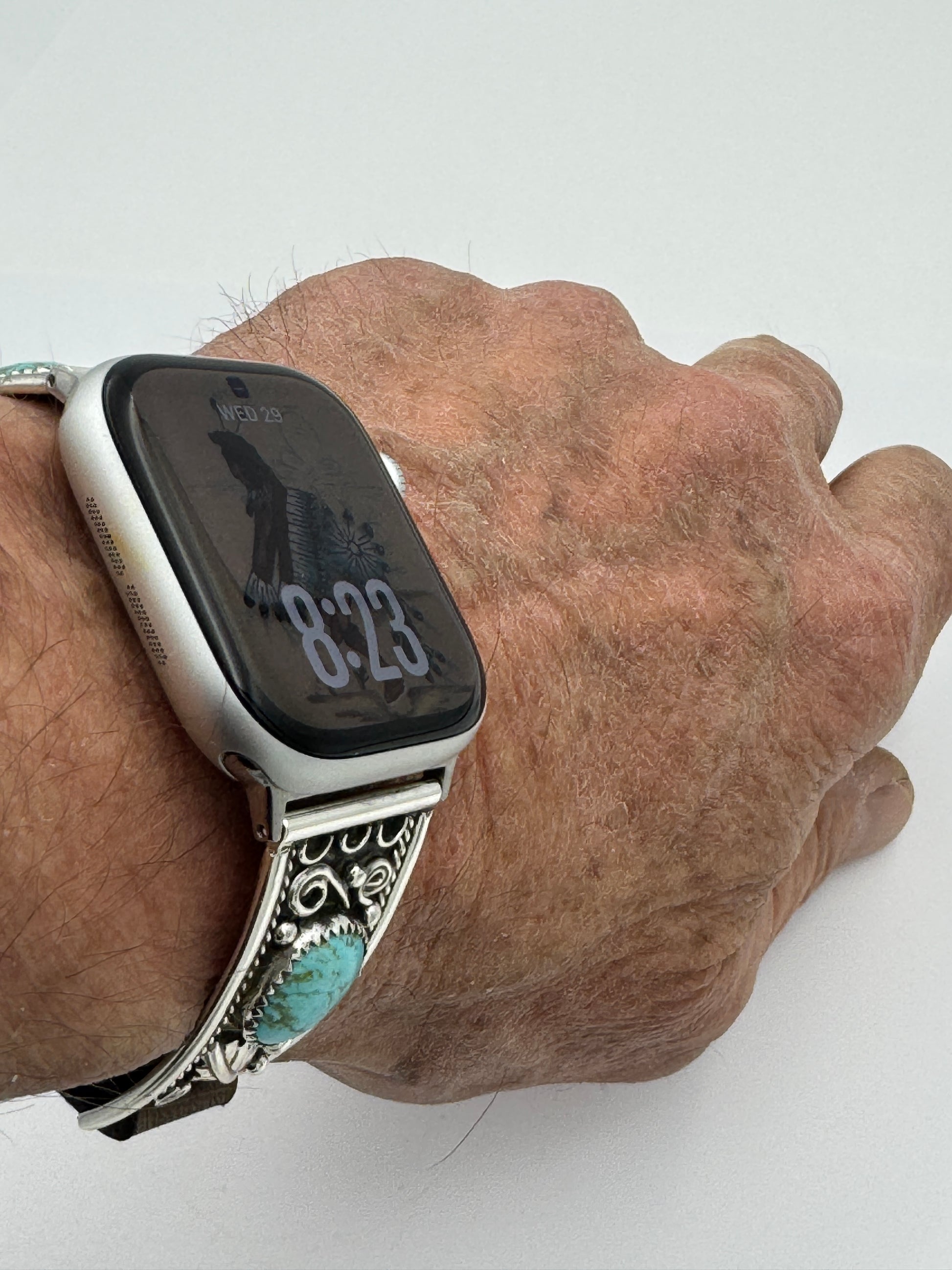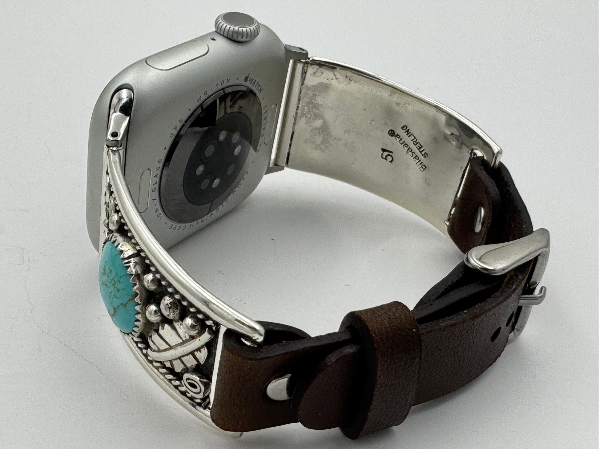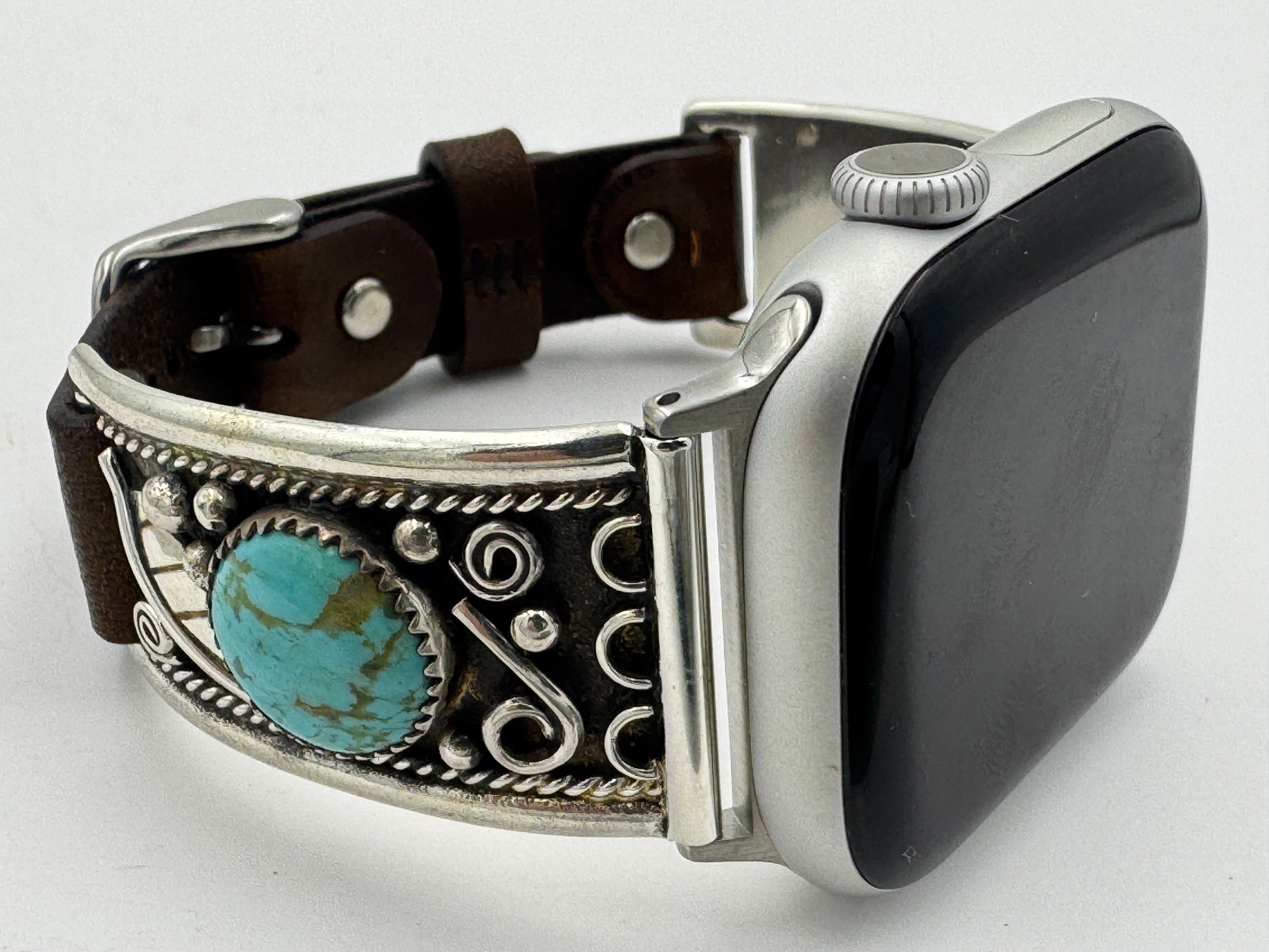 This purchase includes a Handcrafted Native American Sterling Silver Leather iBand for Apple WATCH Series 1 38mm thru Series 10 42mm. The Apple WATCH 38/40/41/42mm is not included.