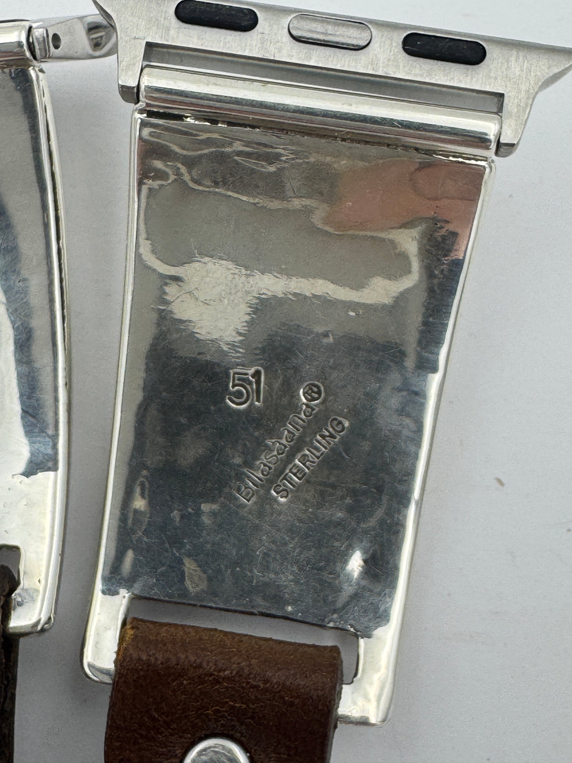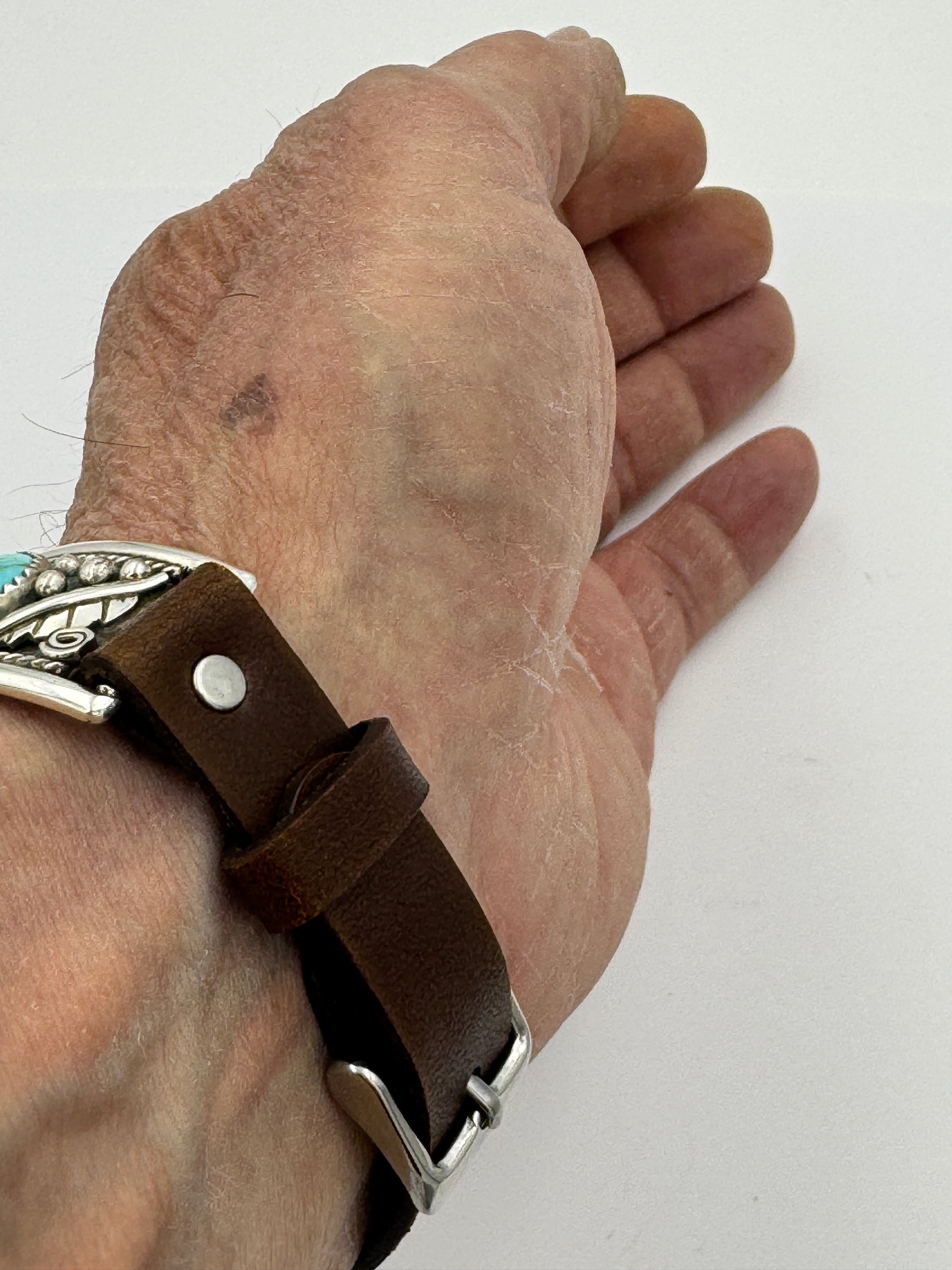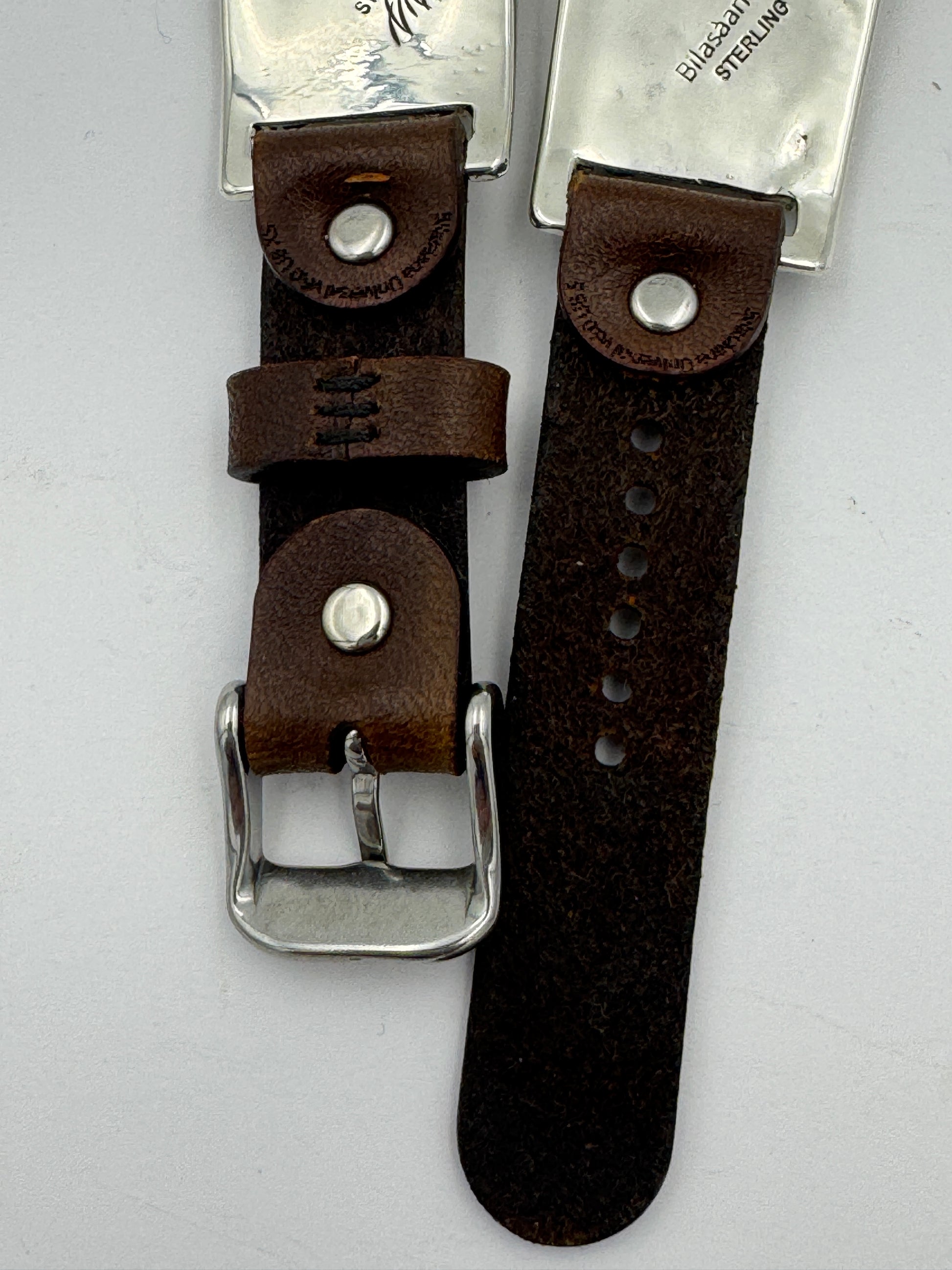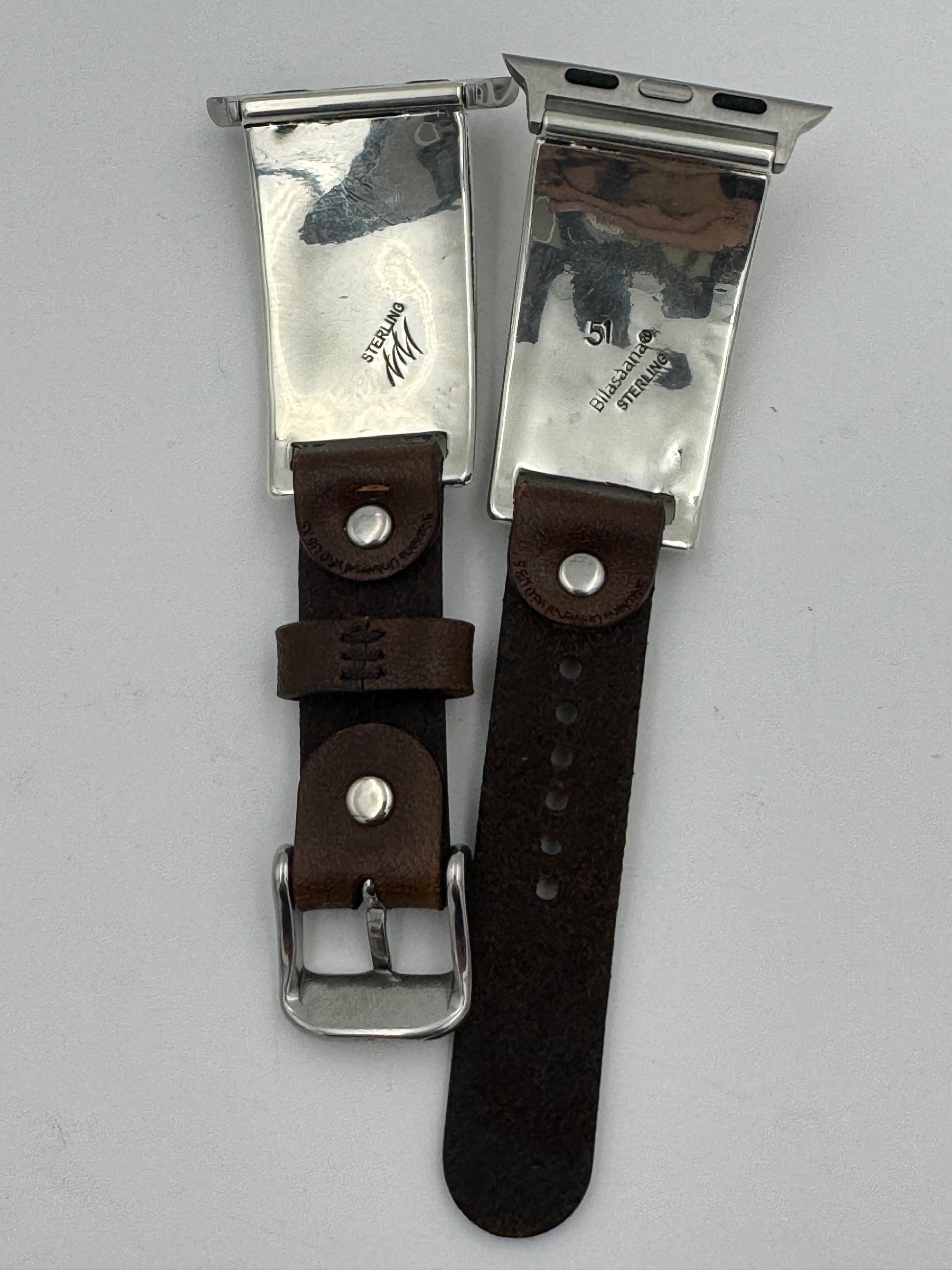 This is the 51st Bilasáana Nelson Morgan piece offered. The iBand consists of two Sterling Silver Tips with 38/40/41/42mm WATCH adapters and a leather band. The Sterling Silver Tips are Handcrafted by Nelson Morgan of the Navajo Nation and have an authentic Navajo twisted wire leaf design with Round shaped Kingman Turquoise stones on each side. On the inside of one Tip is the official Bilasáana Trademark, a Sterling mark and a serial #51. The other tip has Sterling mark and Nelson's authenticity Stamp.