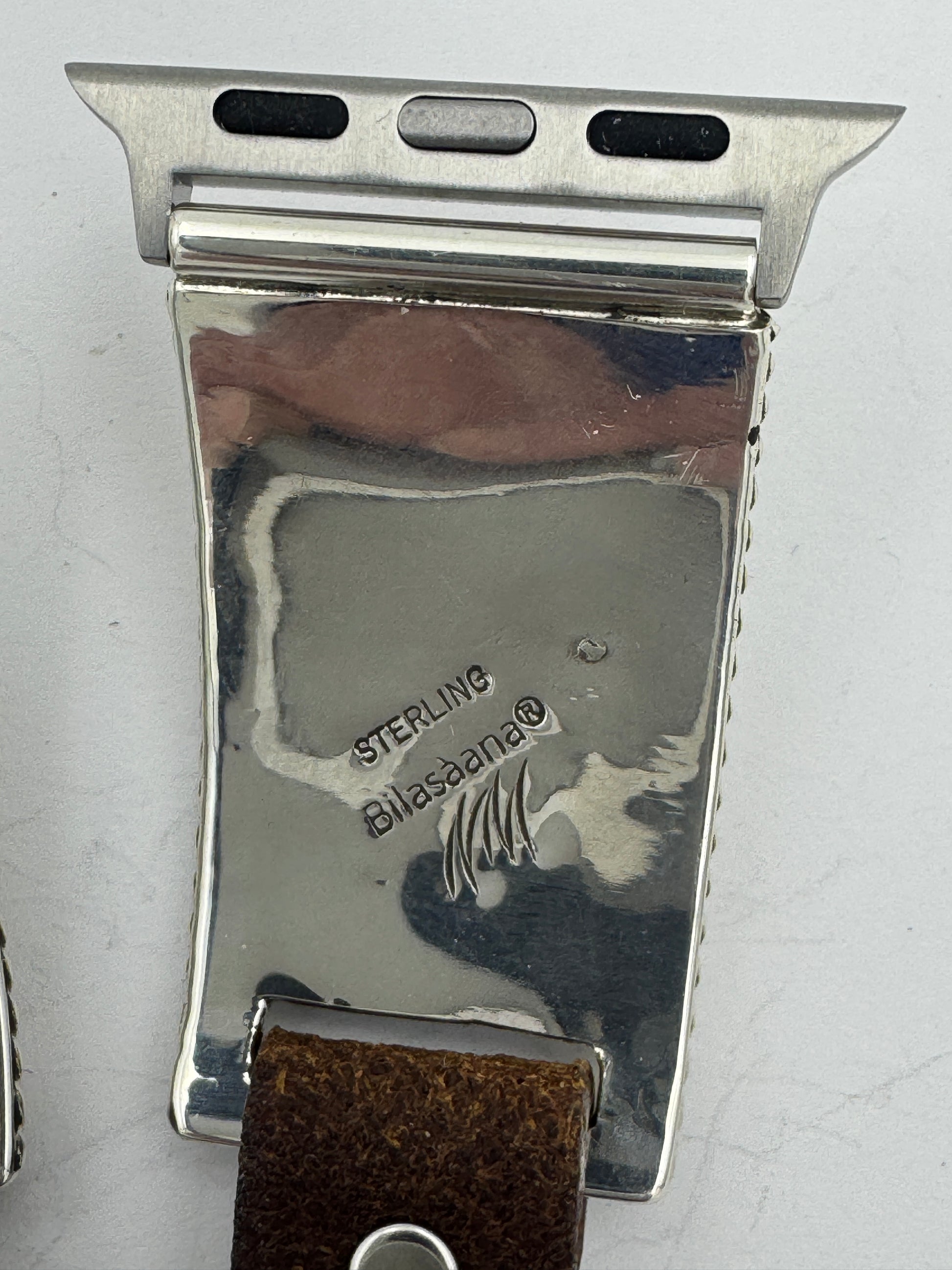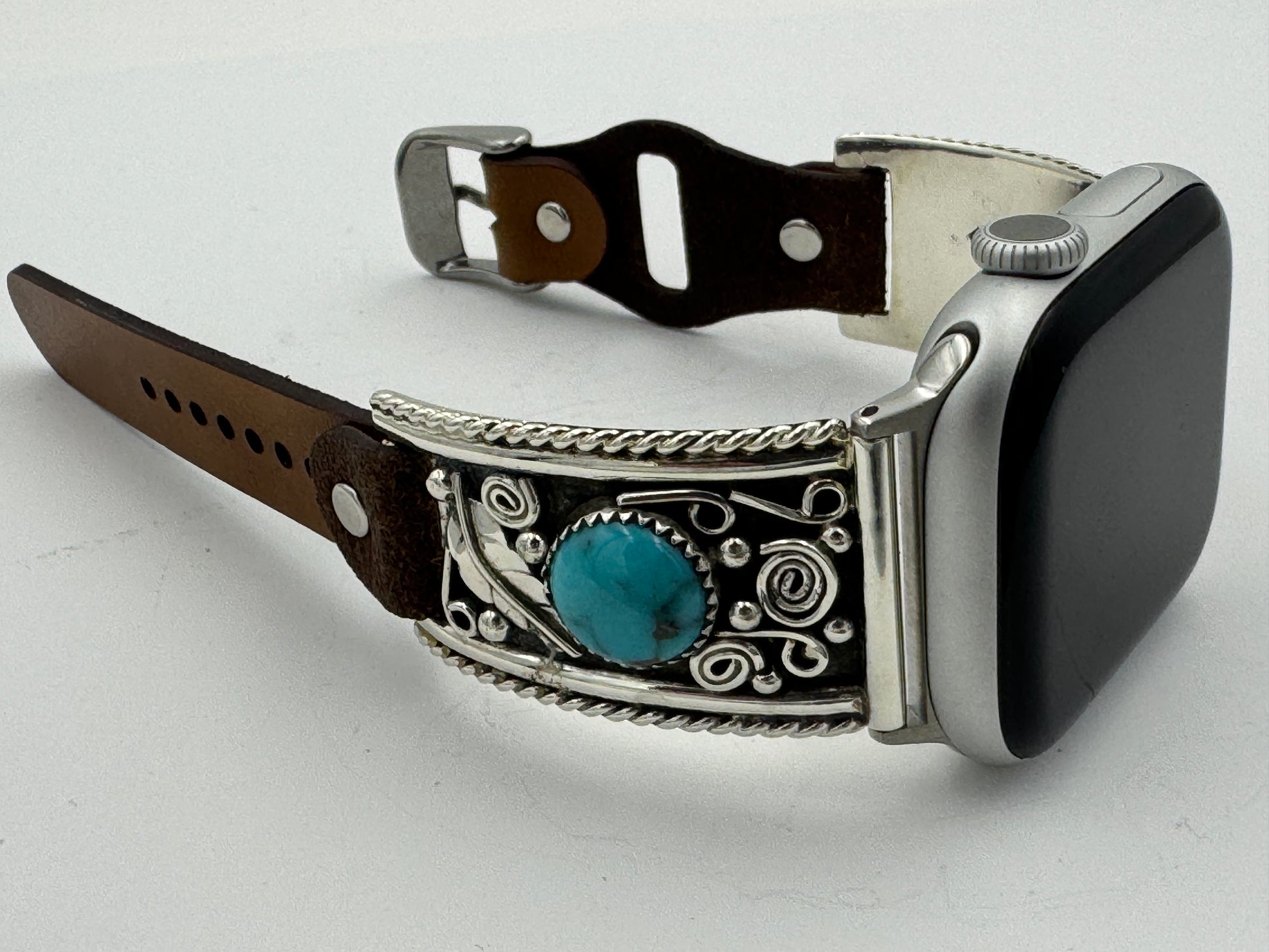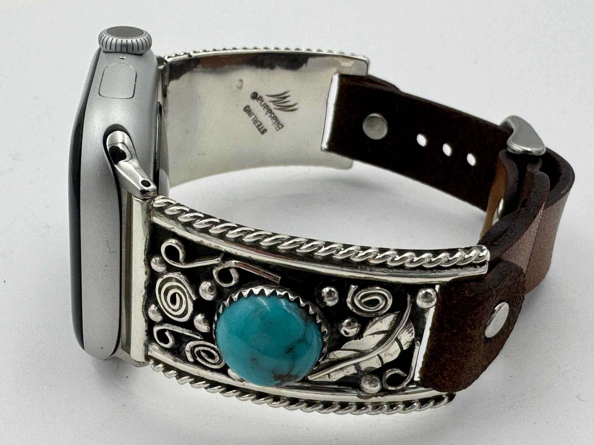 This is the 56th Bilasáana Nelson Morgan piece offered. The iBand consists of two Sterling Silver Tips with 38/40/41/42mm WATCH adapters and a leather band. The Sterling Silver Tips are Handcrafted by Nelson Morgan of the Navajo Nation and have an authentic Navajo twisted wire leaf design with Round shaped Campitos Turquoise stones on each side. On the inside of one Tip is the official Bilasáana Trademark, a Sterling mark and a serial #56. The other tip has Sterling mark, a Bilasaana mark and Nelson's authenticity Stamp.