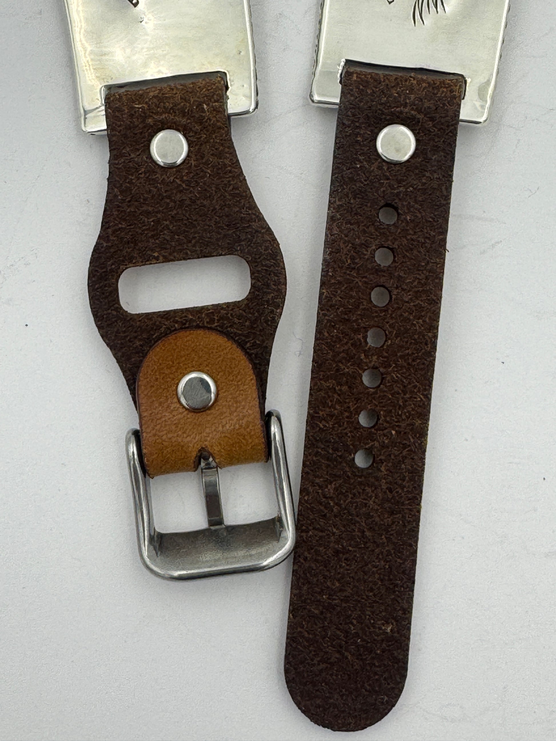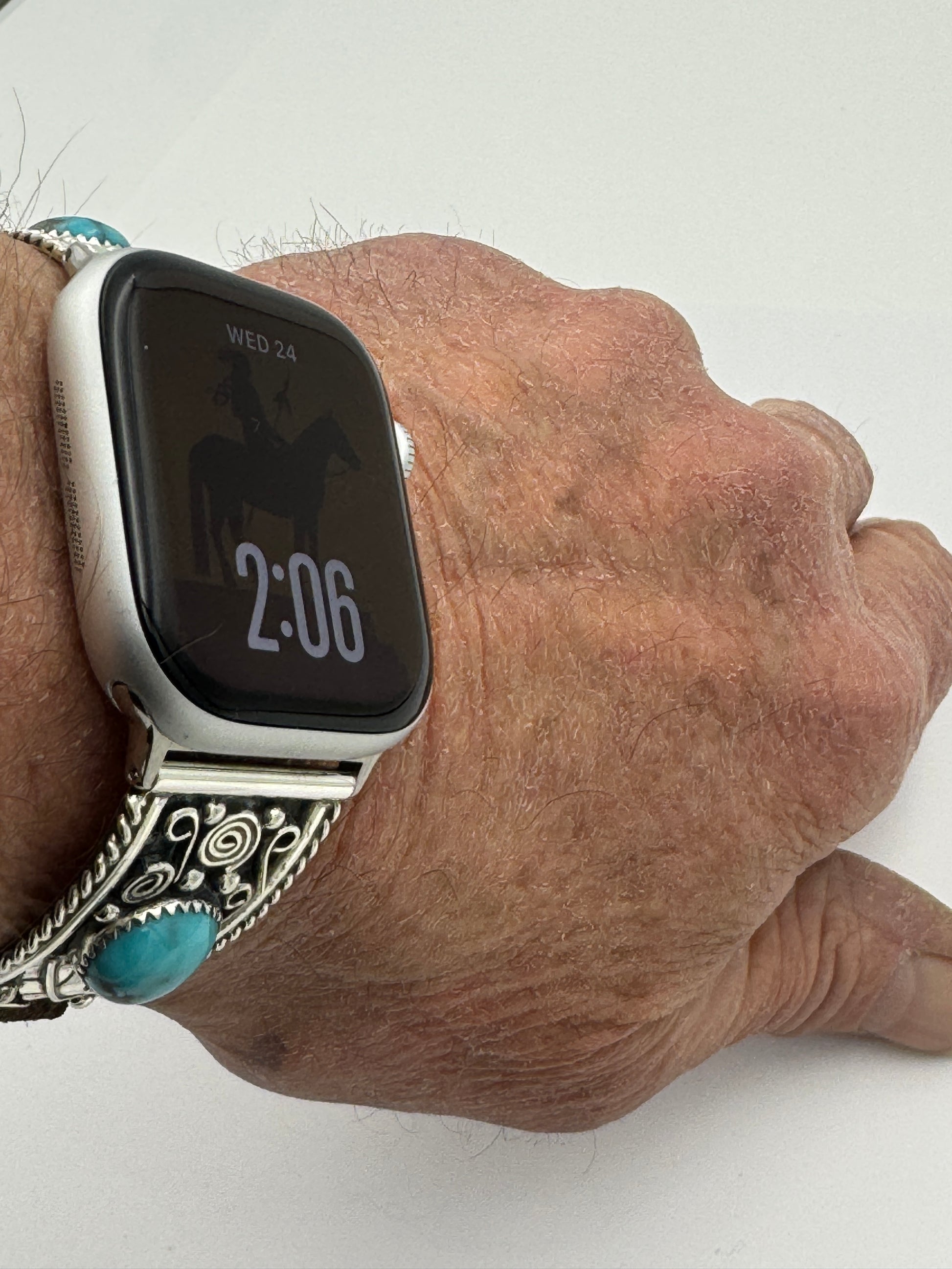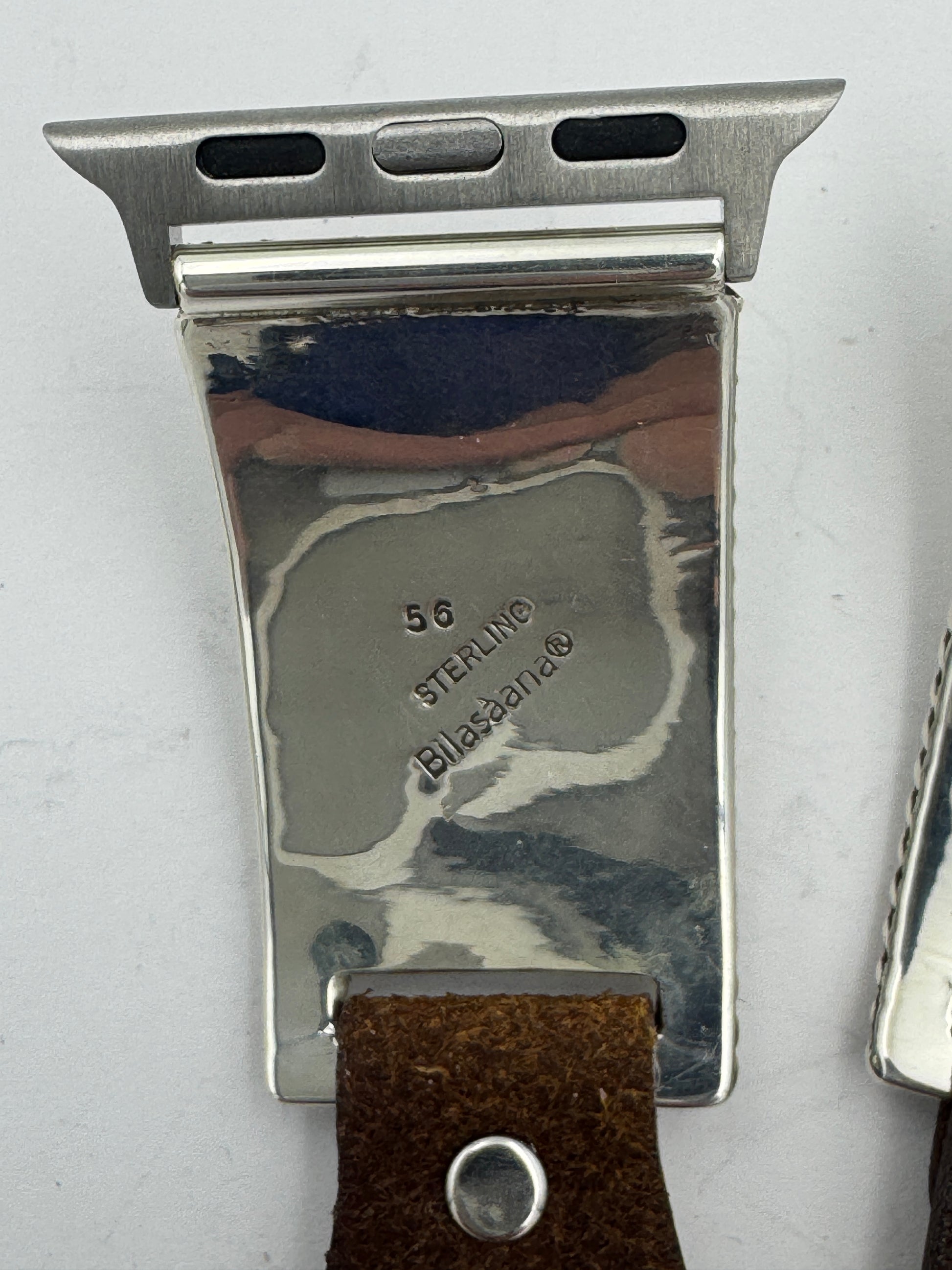 This is the 56th Bilasáana Nelson Morgan piece offered. The iBand consists of two Sterling Silver Tips with 38/40/41/42mm WATCH adapters and a leather band. The Sterling Silver Tips are Handcrafted by Nelson Morgan of the Navajo Nation and have an authentic Navajo twisted wire leaf design with Round shaped Campitos Turquoise stones on each side. On the inside of one Tip is the official Bilasáana Trademark, a Sterling mark and a serial #56. The other tip has Sterling mark, a Bilasaana mark and Nelson's authenticity Stamp.