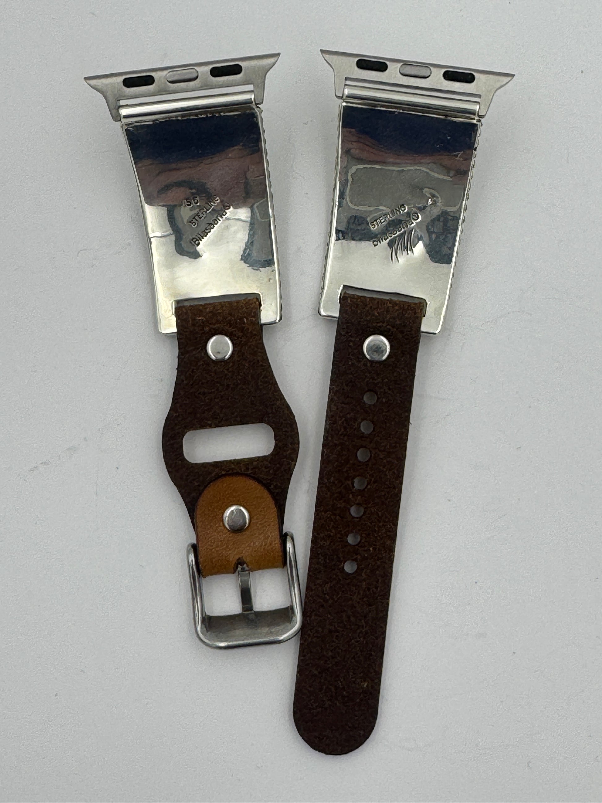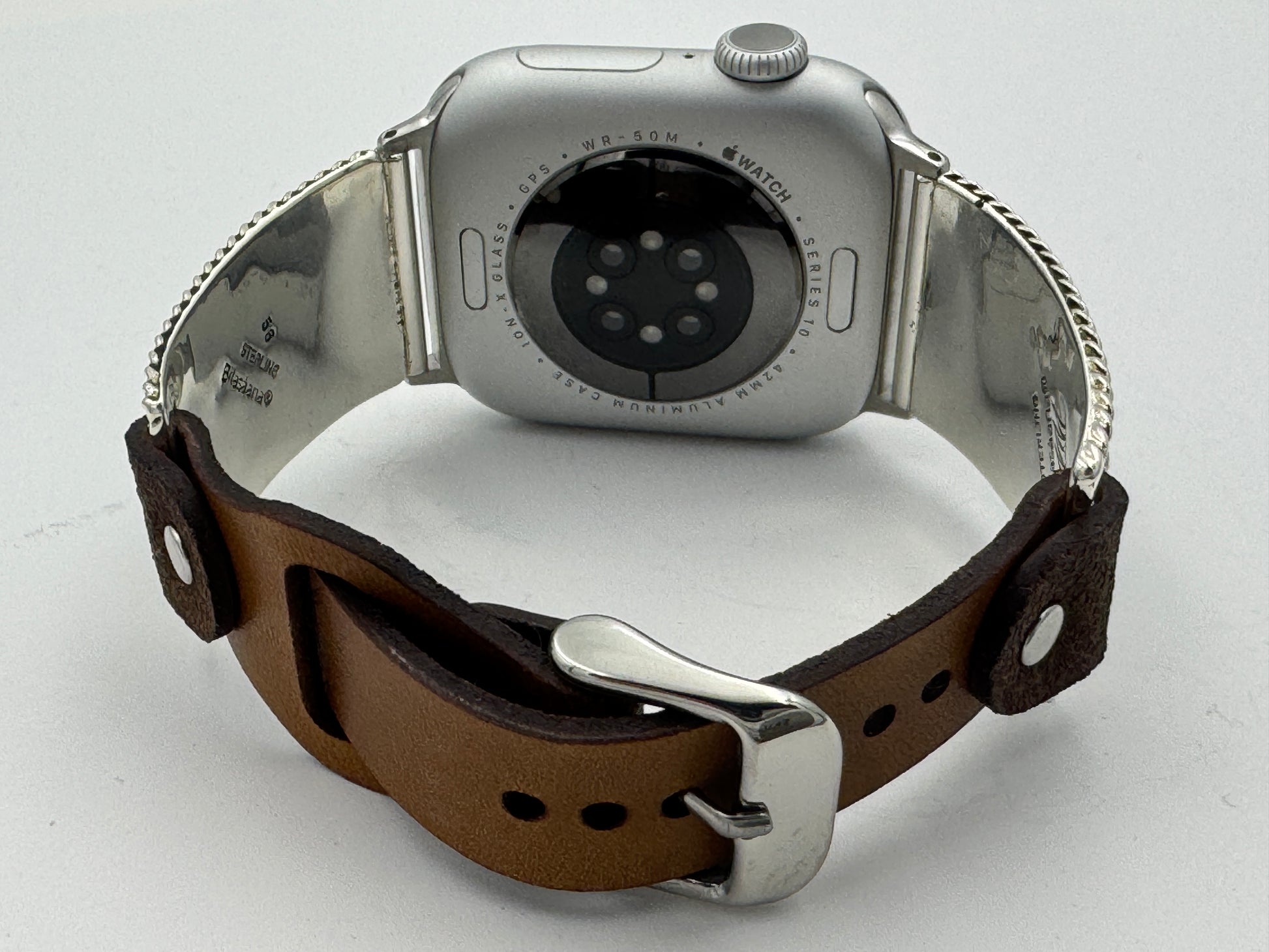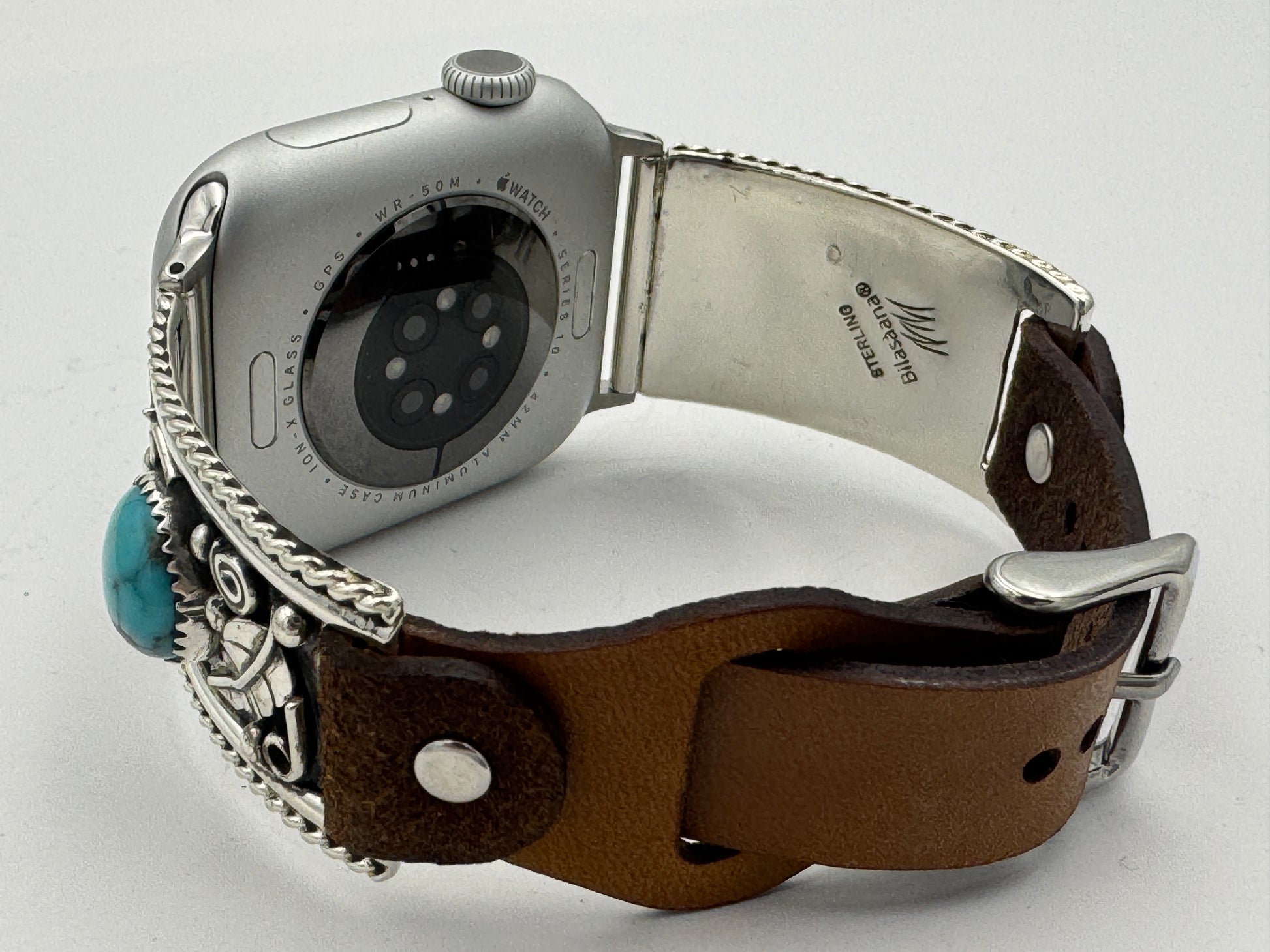 This purchase includes a Handcrafted Native American Sterling Silver Leather iBand for Apple WATCH Series 1 38mm thru Series 10 42mm. The Apple WATCH 38/40/41/42mm is not included.