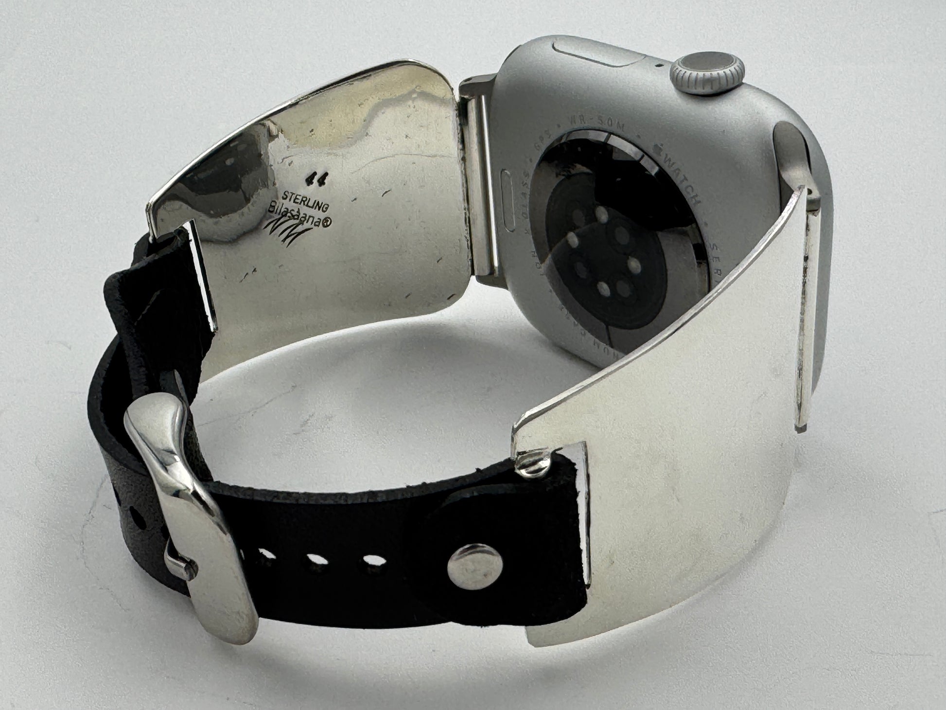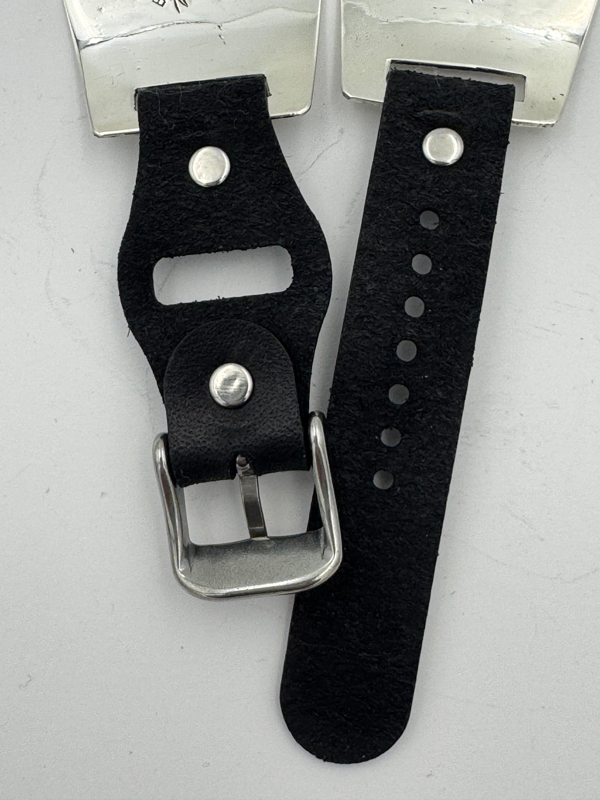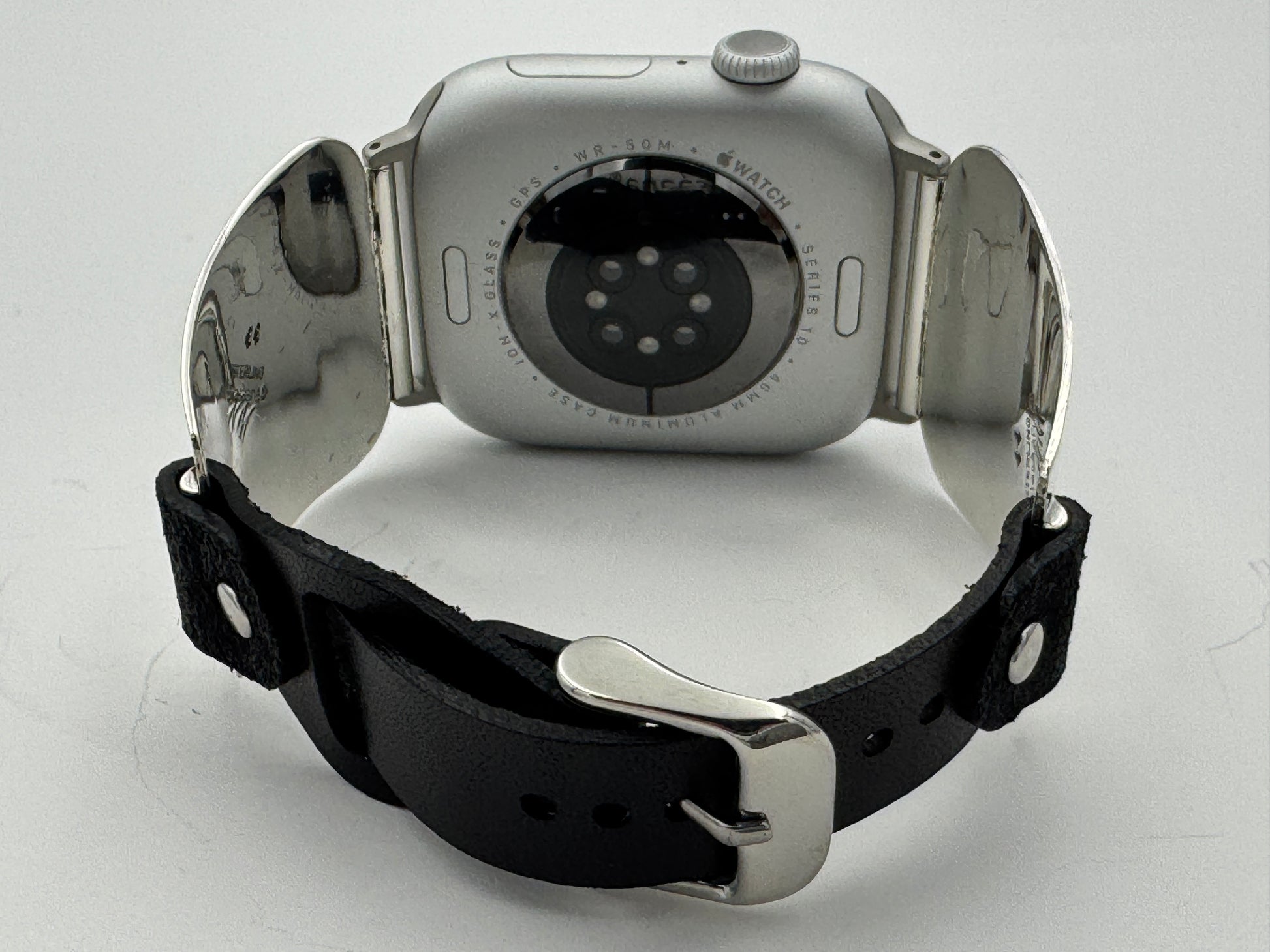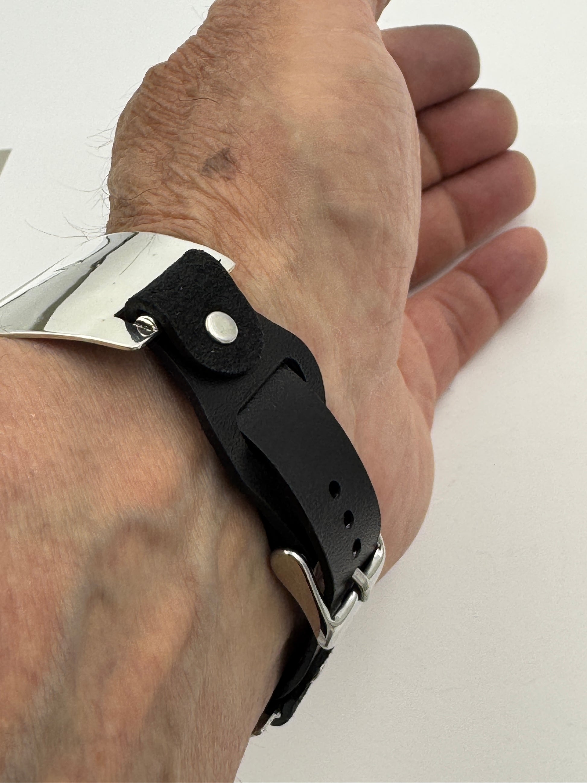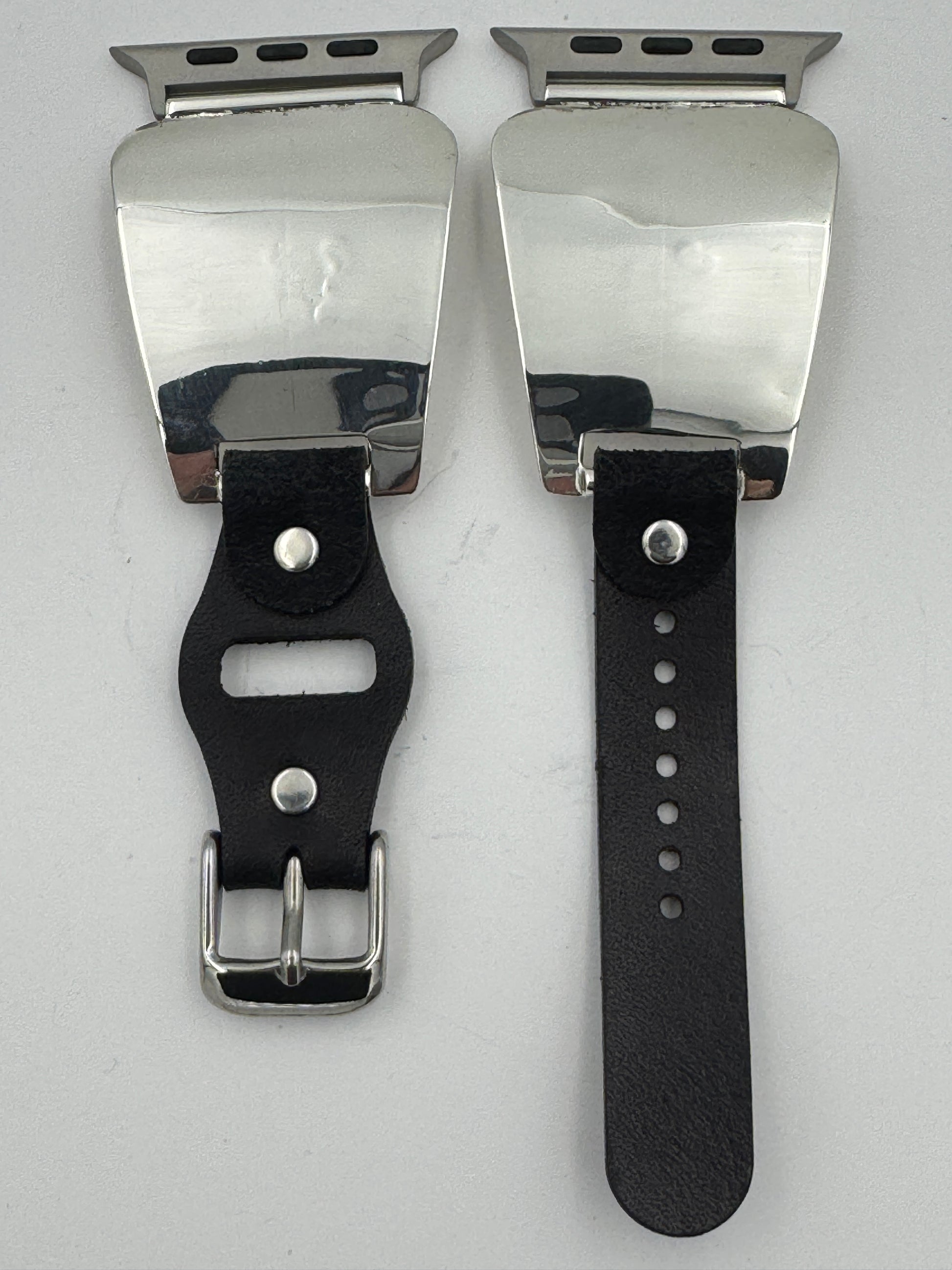 The iBand comes with our Laser Cut Riveted Universal buckle Leather Band v6.0 with no loop as shown. The leather band comes in three sizes X/S, S/M and M/L. The iBand shown has a Black colored S/M band attached. This is a great piece for a medium to a large size wrist. We can size this band to fit virtually any wrist. Buckskin, Dark brown, other colors and a buckle with loop style leather band also available. Choose your band size at checkout and we will contact you to assure a nice fit. Be sure and leave us valid contact information. The iBand will seamlessly integrate with the Apple 42mm Series 1 thru Series 9 45mm WATCH. This band also works with the new Series 10 46mm and the Ultra I and Ultra II 49mm Apple WATCHES.