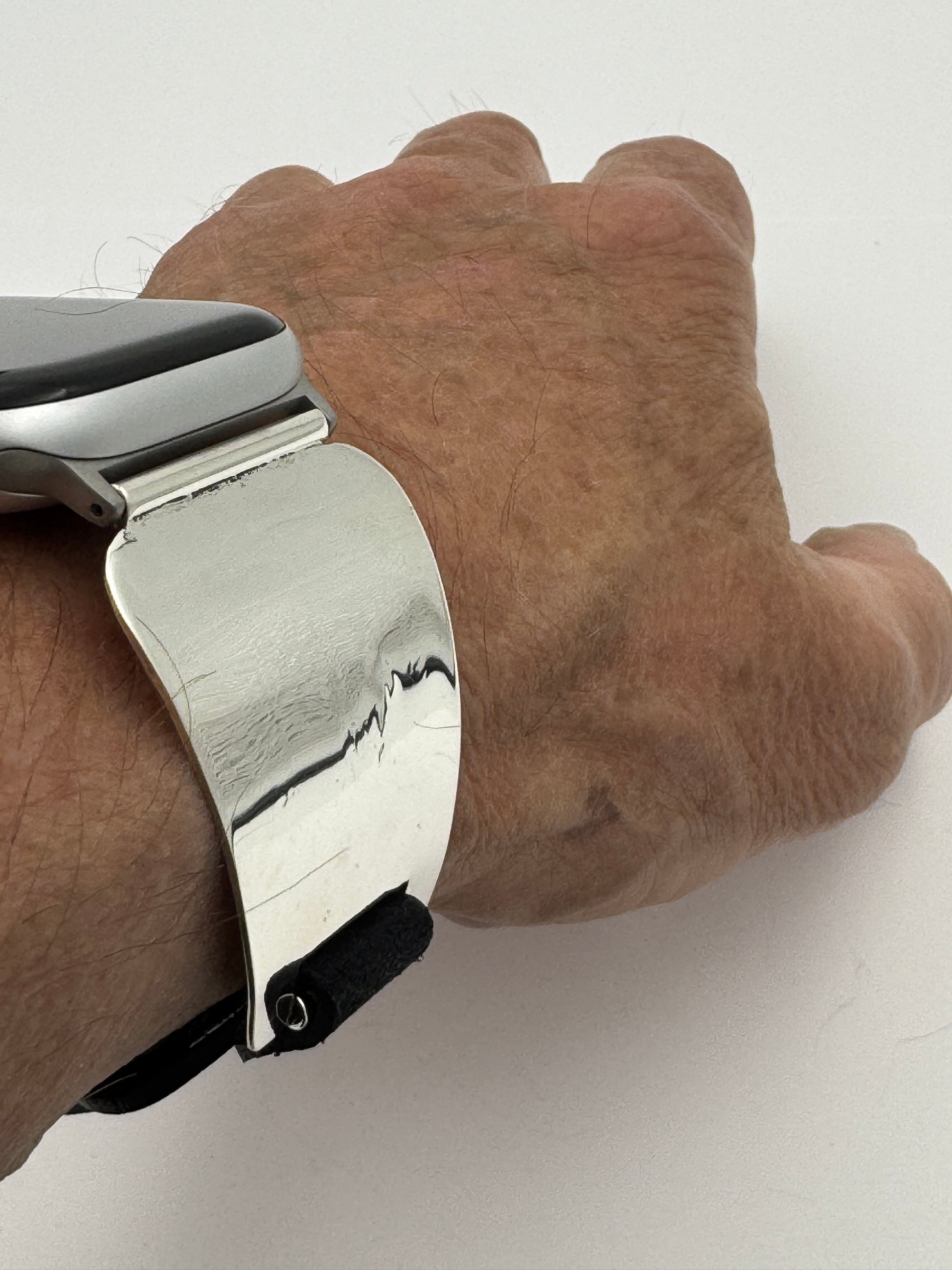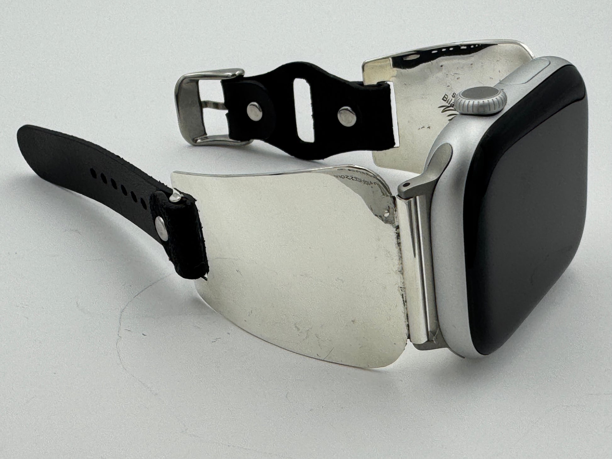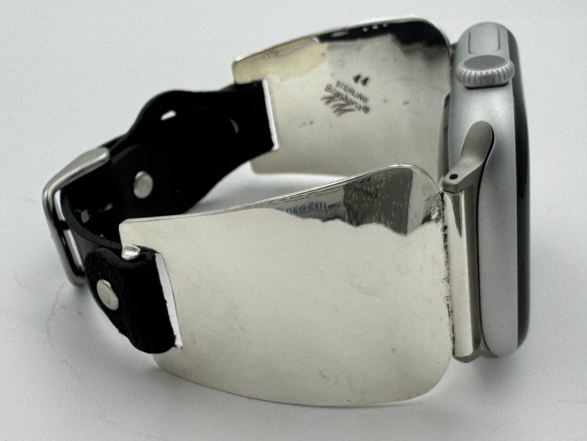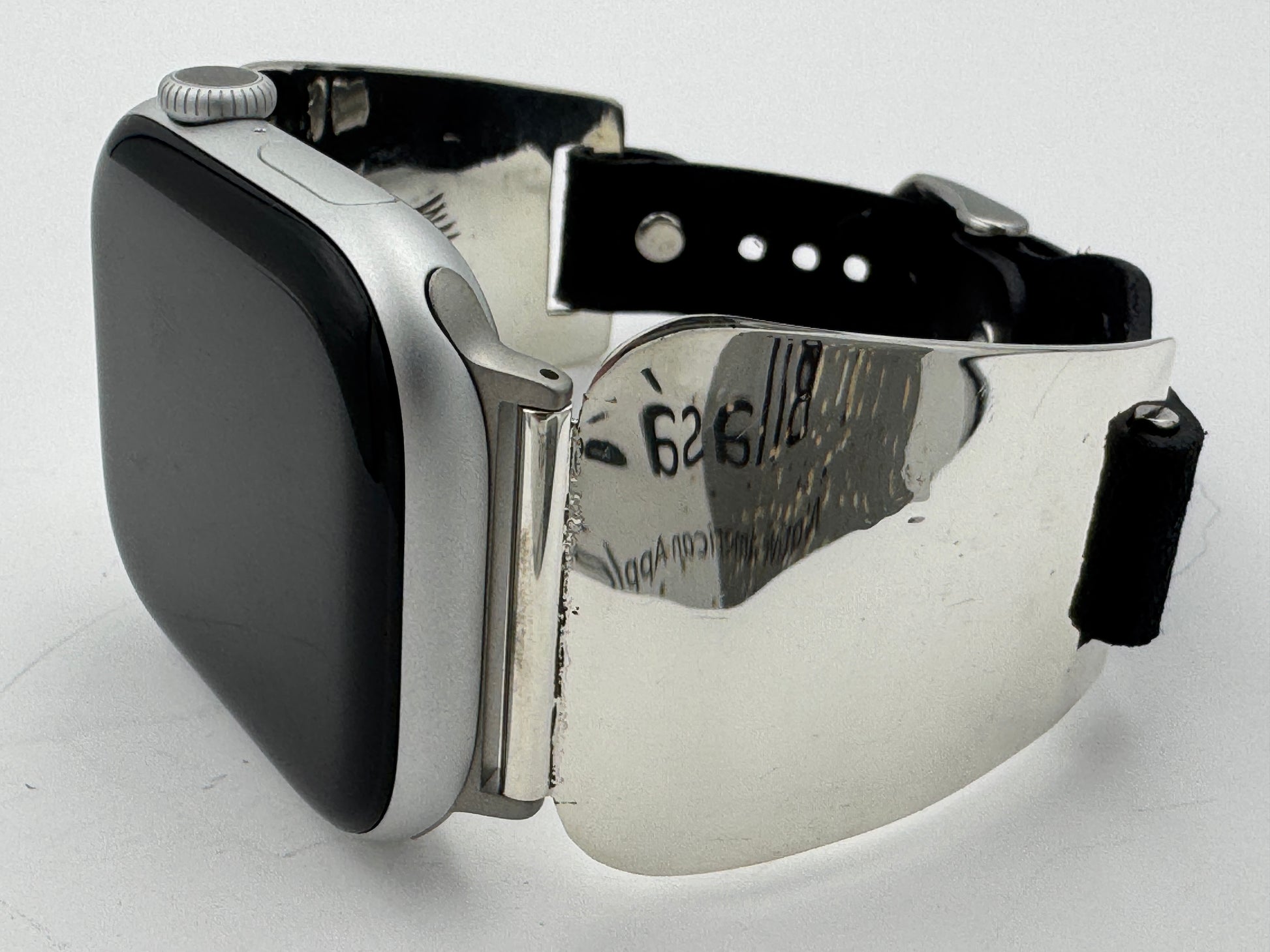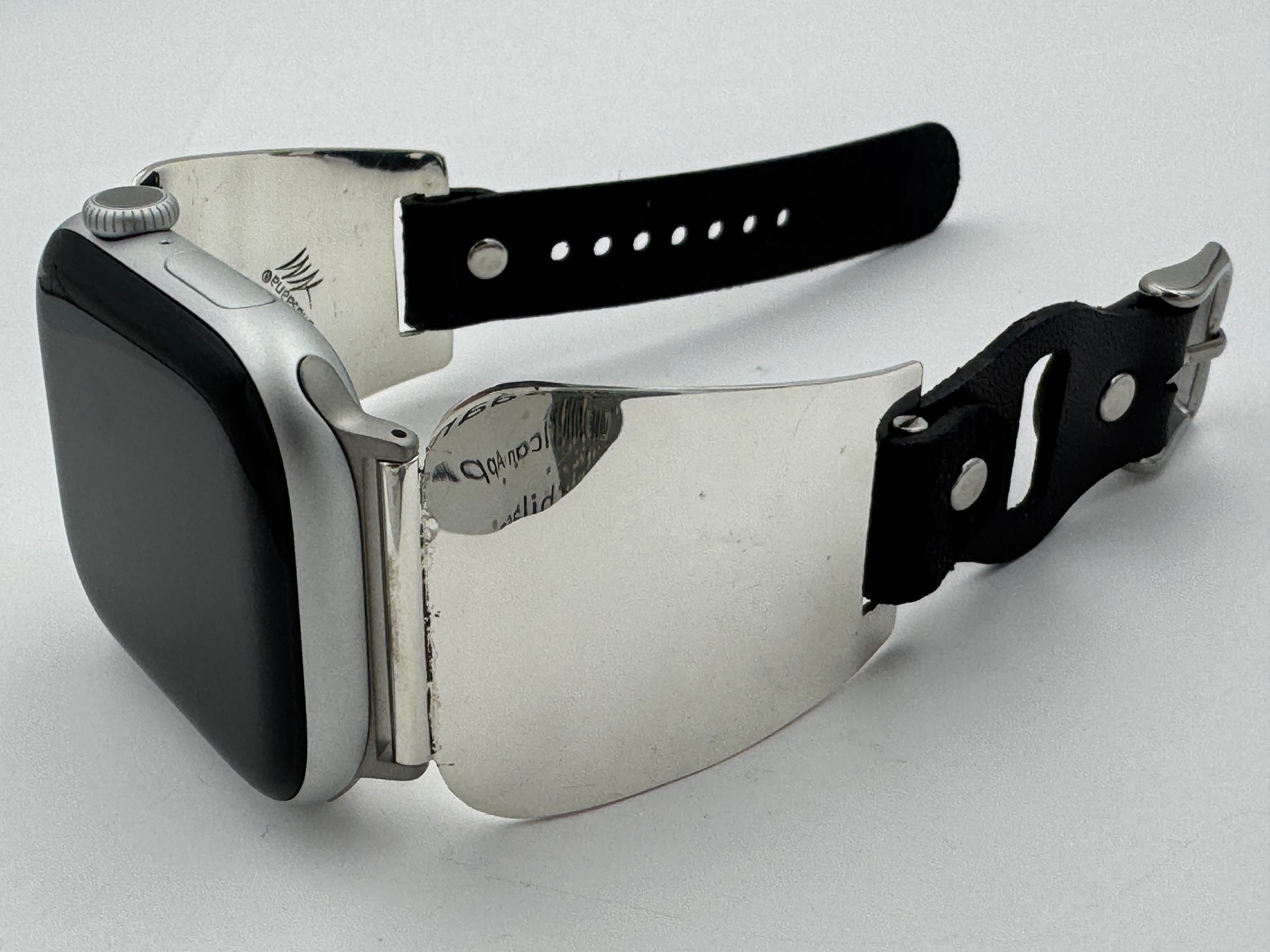 The iBand comes with our Laser Cut Riveted Universal buckle Leather Band v6.0 with no loop as shown. The leather band comes in three sizes X/S, S/M and M/L. The iBand shown has a Black colored S/M band attached. This is a great piece for a medium to a large size wrist. We can size this band to fit virtually any wrist. Buckskin, Dark brown, other colors and a buckle with loop style leather band also available. Choose your band size at checkout and we will contact you to assure a nice fit. Be sure and leave us valid contact information. The iBand will seamlessly integrate with the Apple 42mm Series 1 thru Series 9 45mm WATCH. This band also works with the new Series 10 46mm and the Ultra I and Ultra II 49mm Apple WATCHES.