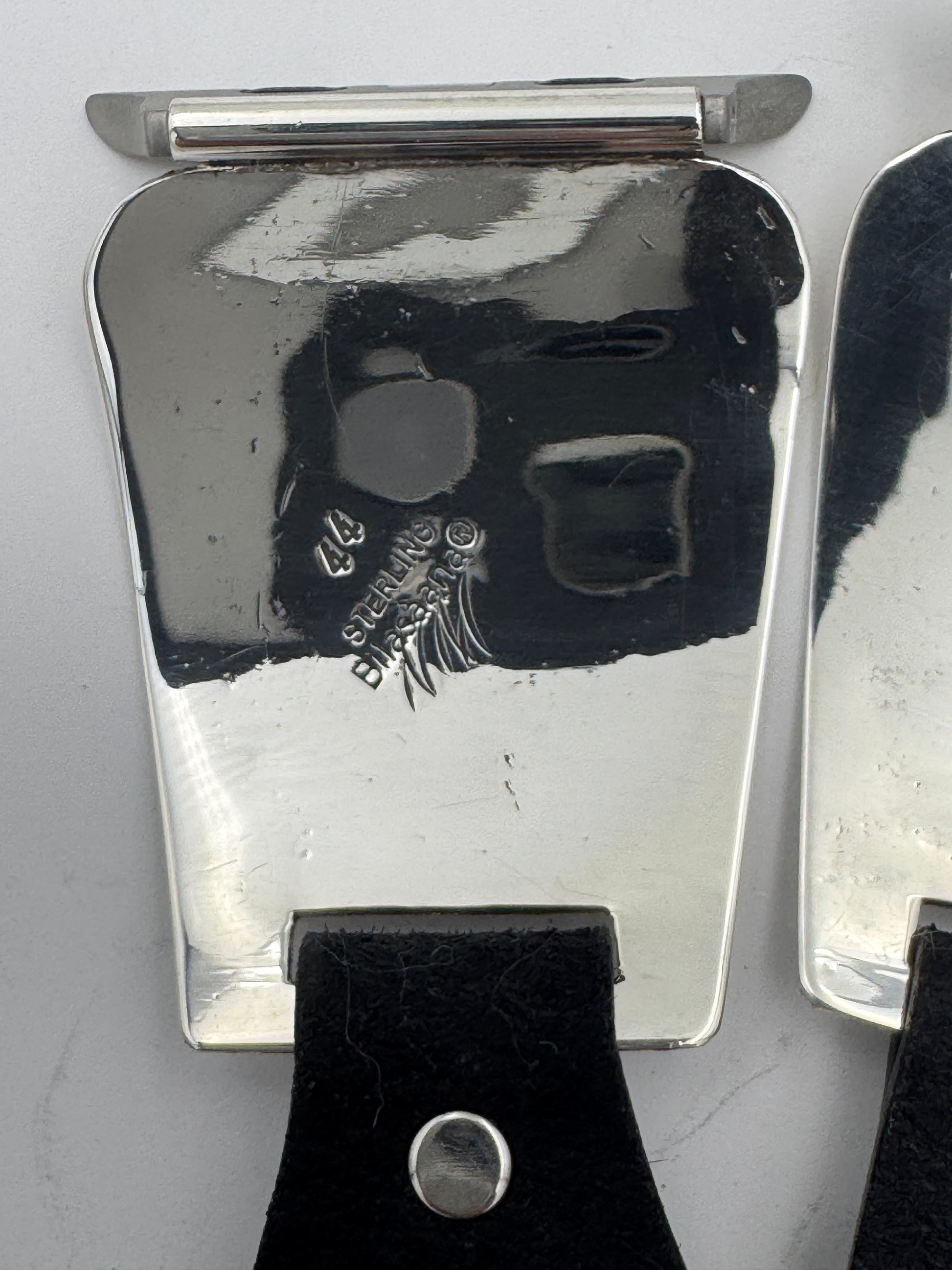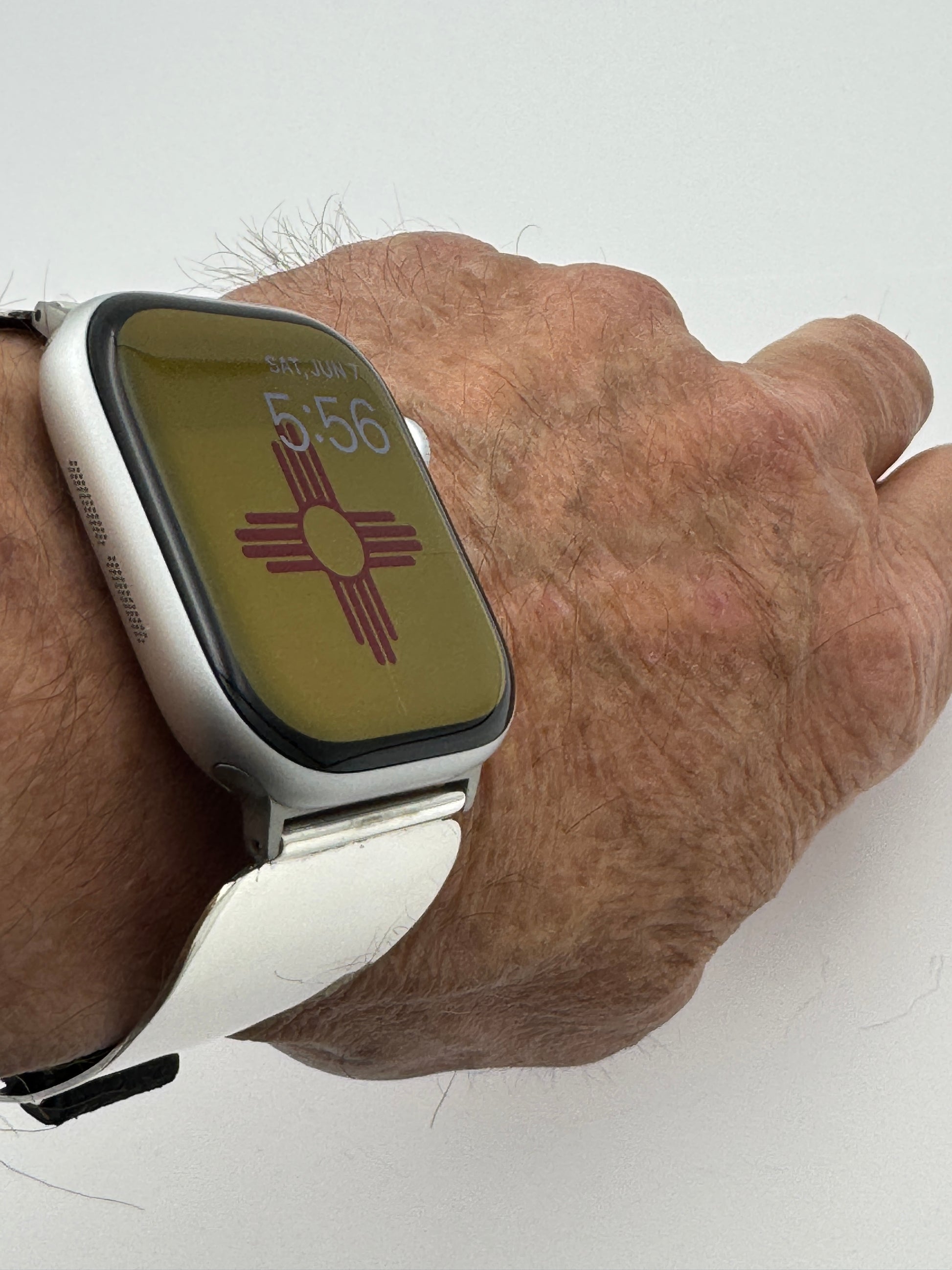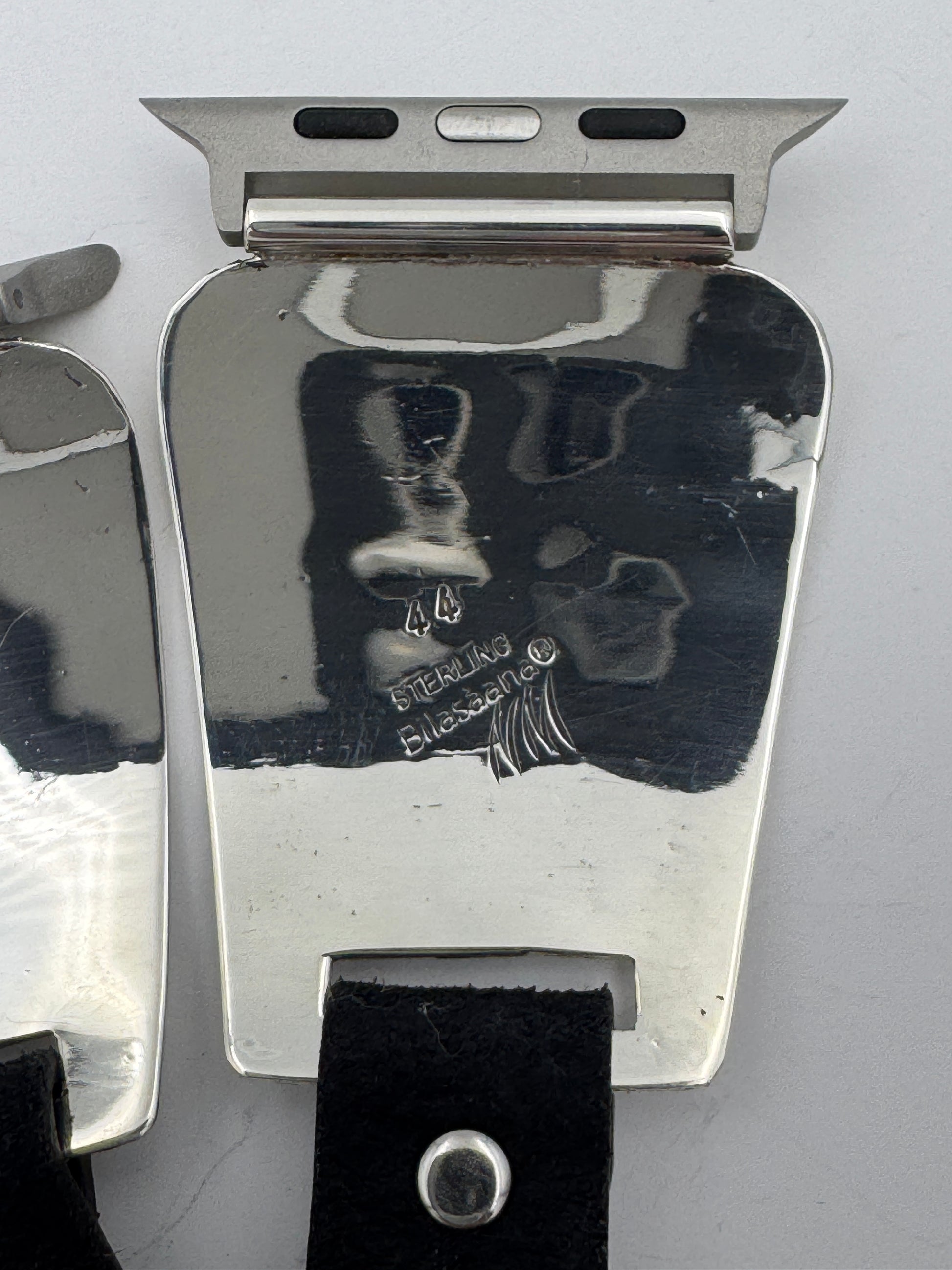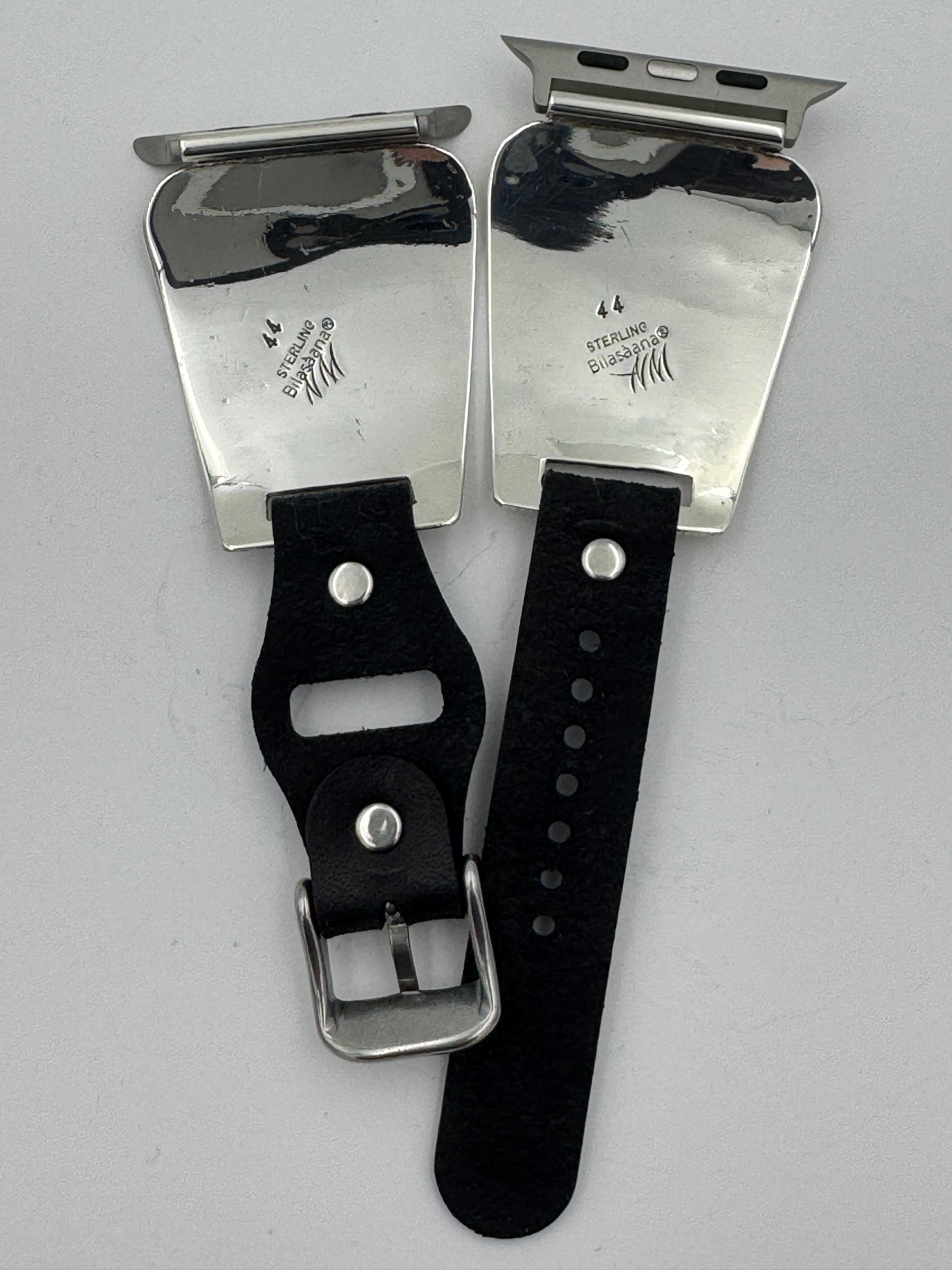 This is Nelson Morgan's 44th Bilasáana piece offered. The iBand consists of two Sterling Silver Tips with 42/44/45/46mm WATCH adapters and a leather band. The Sterling Silver Tips are Handcrafted by Nelson Morgan of the Navajo Nation and are modeled after some of our first designs by popular demand. On the inside of each Tip is the official Bilasáana Trademark, the serial number 44, a Sterling mark and Nelson's NM authenticity mark.